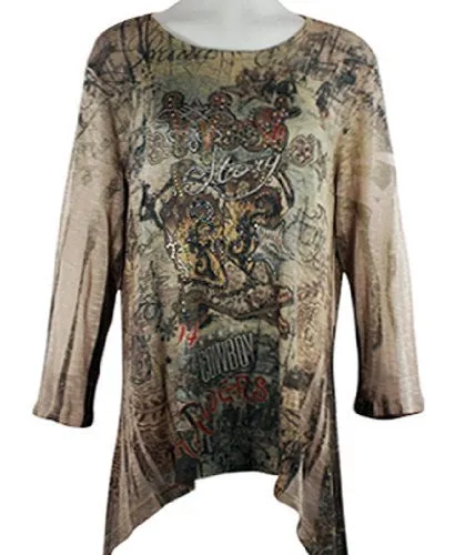 Cactus Fashion contemporary tops and tunics are designed with cotton, rayon and fabric blends for lightweight comfort and style. These versatile tops and tunics are a perfect addition to any wardrobe offering an array of style and design flexibility. These woman's top offers a perfect match to wear with jeans, shorts or dress pants basically a go anywhere, dress up or dress down top that's easy to pack, light weight and ultra comfortable. These contemporary, stylish tops and tunics take their unique designs from period prints, various food items, famous cities, western themes, flora and fauna as well as bits of nostalgia. The colorful printing of these tops utilizes a unique blend of multiple colors as well as subtle shadings producing a sure to get noticed look even before the added rhinestone highlights accentuate their unique designs. You'll find these tops and tunics are perfect for year round use even in the summer the fabric offers a lot of breath-ability plus being made of lightweight cotton and fabric blends wear comfortably even in warm climates. Please note that design, colors and styles change fairly rapidly in this product line as once a style is retired it is no longer available.