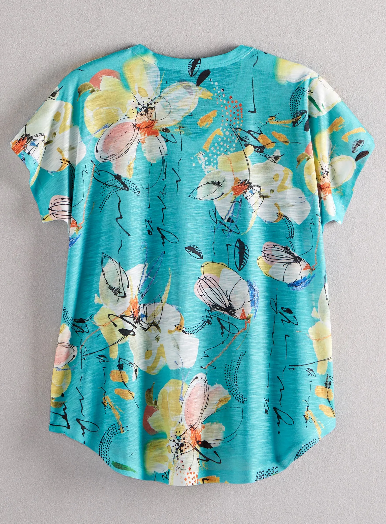 Inspired by the nature trail on Caladesi Island State Park in Florida, this floral and aqua blue top in lightweight burnout fabric is just right for spring and summer. The cap sleeves, V neck, and cute rounded hemline are all flattering details that play well with curvy figures but won’t overwhelm petite gals. Designed and made in the US.
