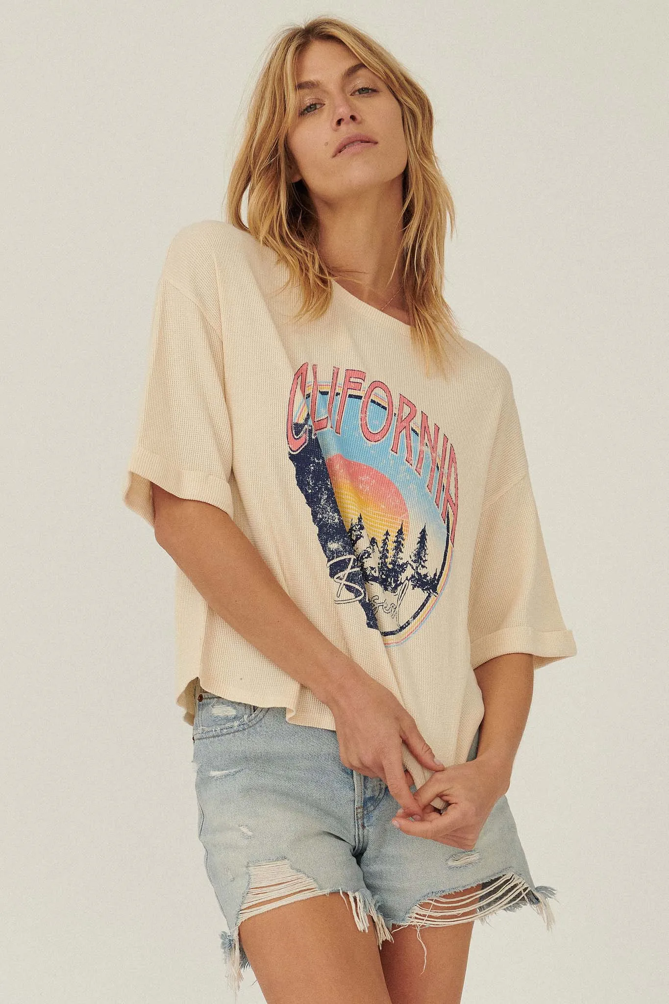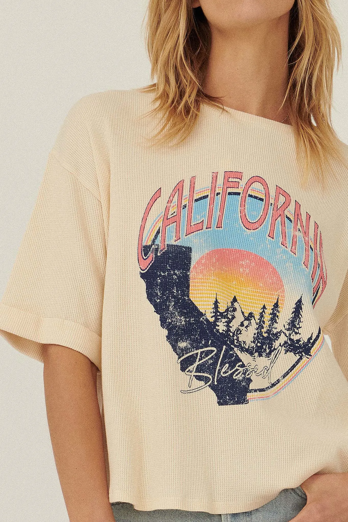 • Vintage-style "California Blessed" text print with landscape graphics.