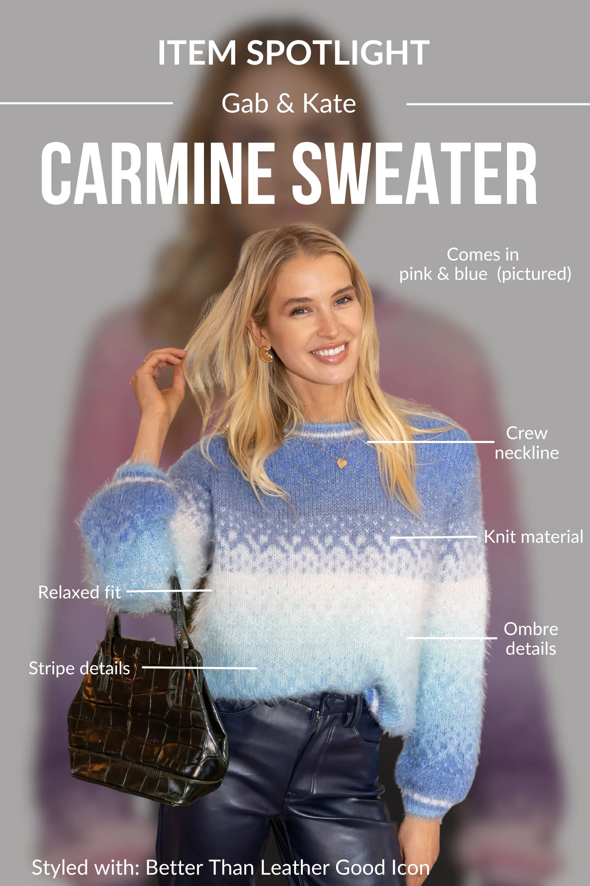 Add some color to your closet with the Carmine Sweater. This super soft and cozy sweater features a crew neckline, relaxed fit, stripe details, ombre details, and knit material. Rock this all season long with a trendy pair of jeans and boots!