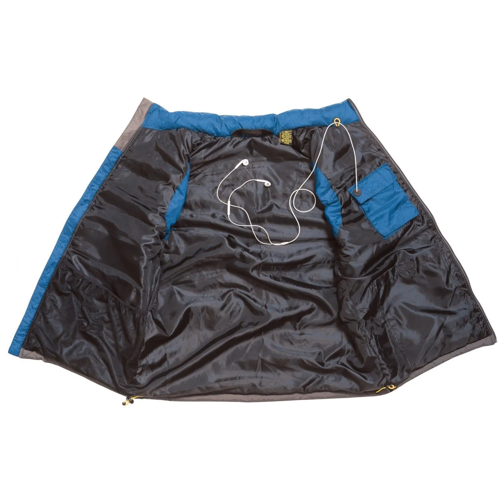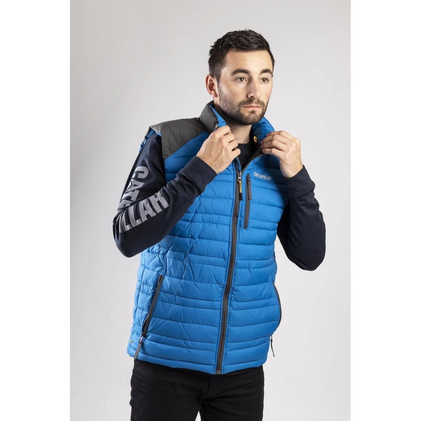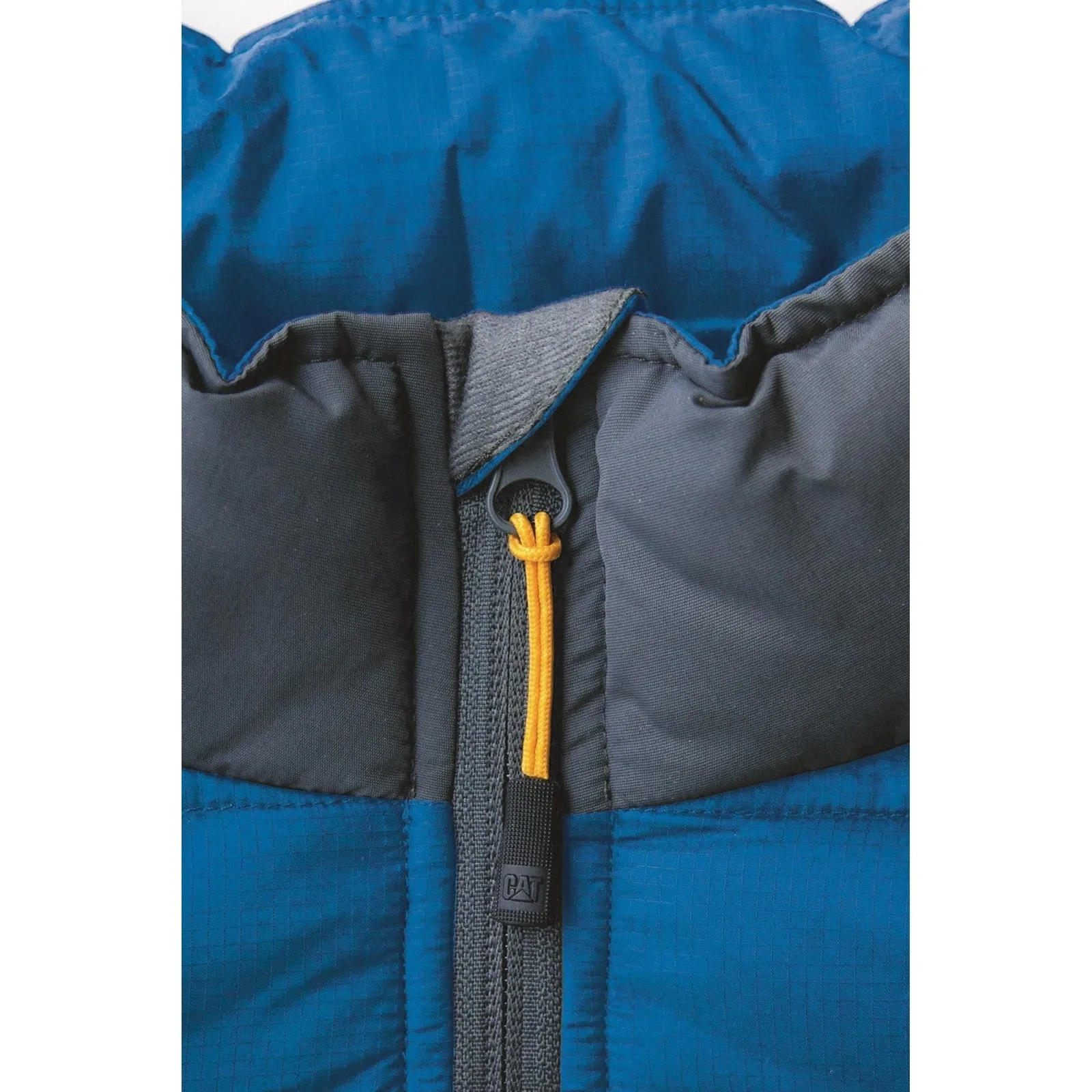 Caterpillar Defender Insulated Vest Durable water resistant finish Quilted insulated body for warmth and maximum performance Reflective logo print on left chest and back collar Inside upper left chest pocket with hook and loop flap closure and wire management to keep cords in place, increasing job site safety Full front zip with storm flap and beard guard Stand up collar with contrast overlay on outer collar and shoulders Adjustable drawcord and cord locks at bottom sides for optimal fit Left chest zip pocket for quick access and safe storage Inside lower left tablet pocket with hook and loop closure Secure multipurpose pockets