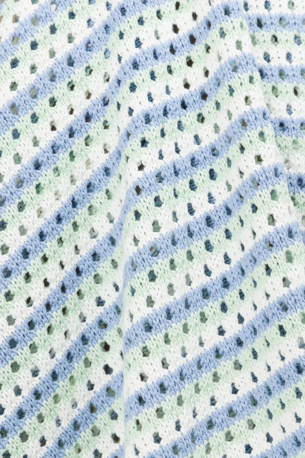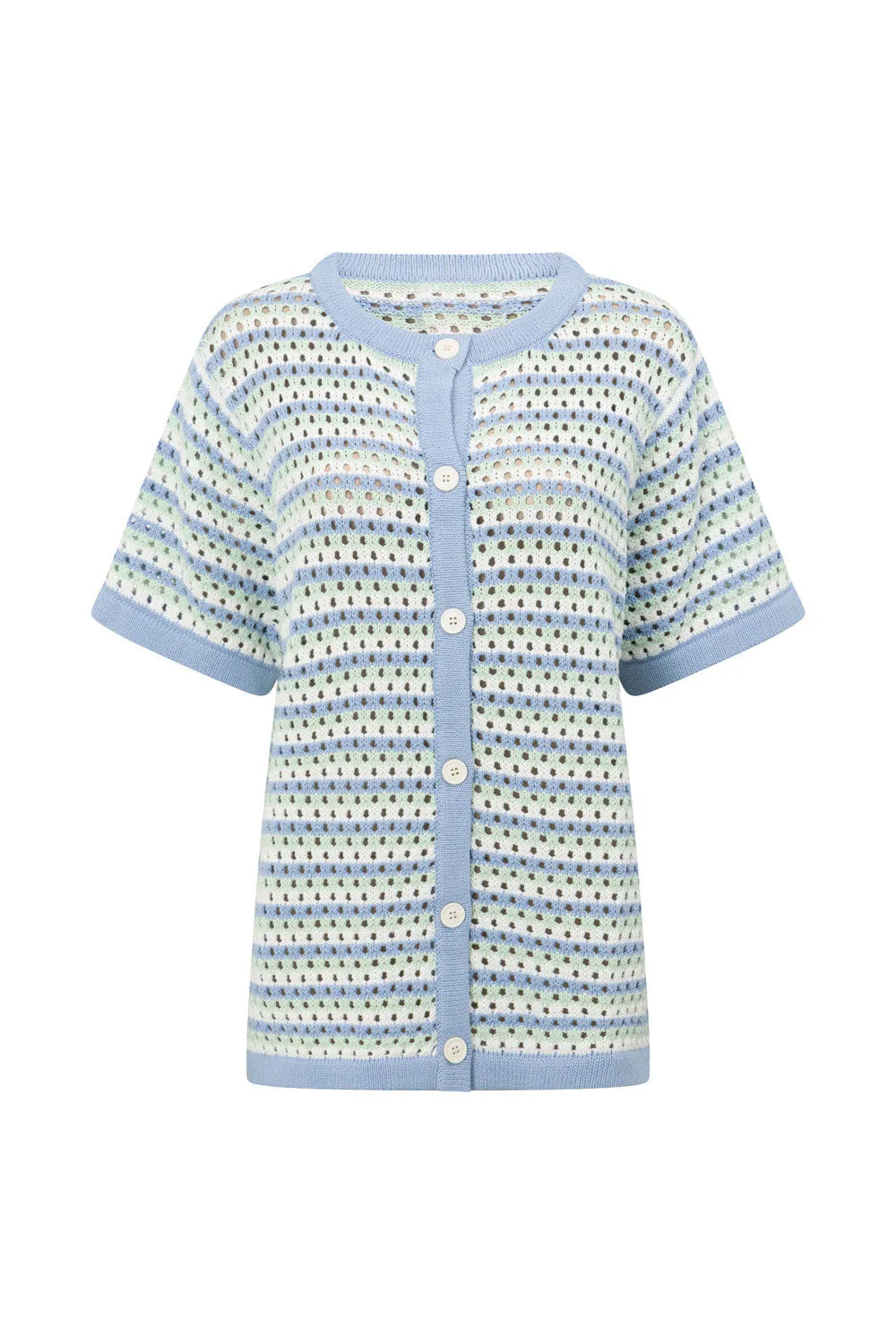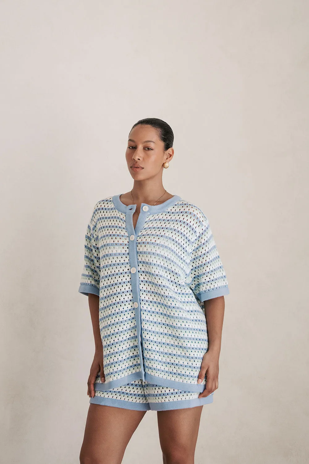 The vintage inspired Chantel Knit Top is made from a natural cotton diamond jacquard knit. It is unlined and features blue, mint and white stripes, contrast blue trims, buttons down centre front and an oversized fit. Wear over a neutral bralette and pair with the Chantel Knit Shorts! Designed exclusively by Sabo.