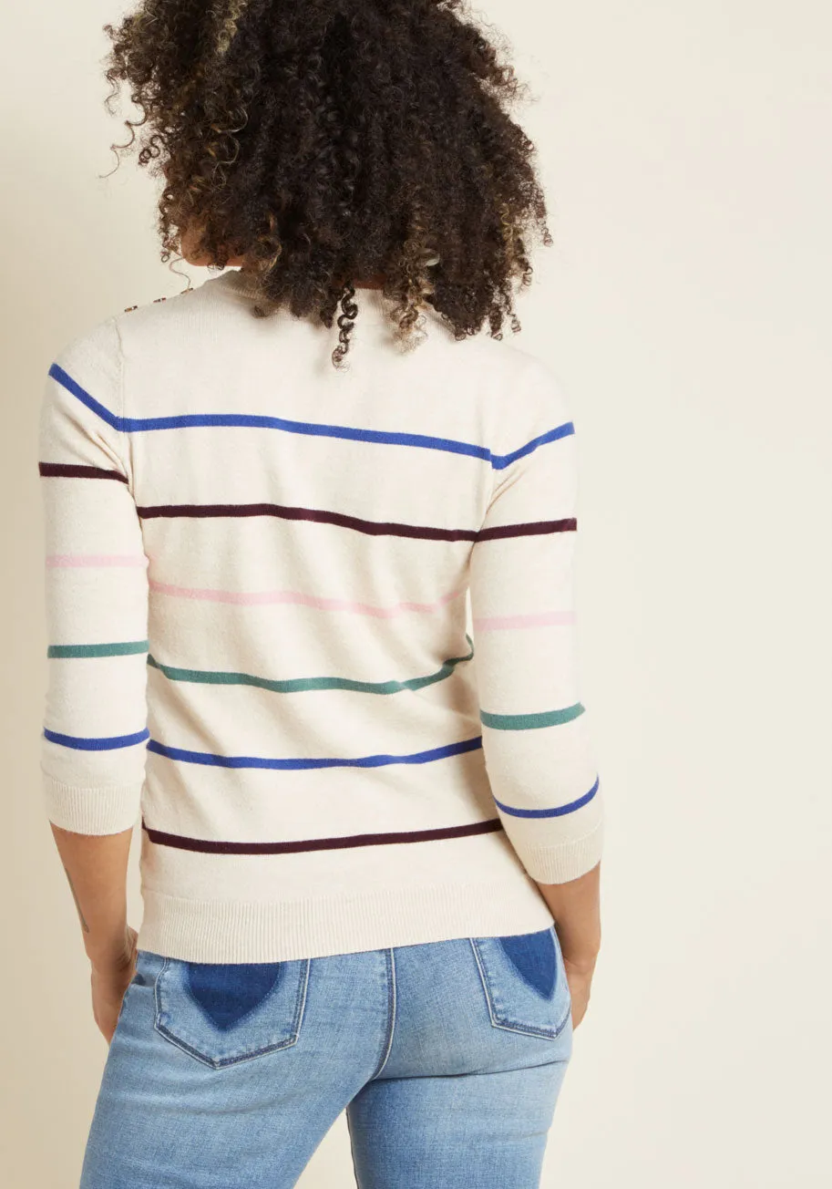 Show your style smarts in this ivory sweater! With buttons at the left shoulder, cropped sleeves, and a fine, soft knit with ribbed edges, this blue, burgundy, pink, and green striped pullover will be your favorite wardrobe staple. No matter how you wear it, this ModCloth namesake label piece - with improved fabric to avoid pilling - offers an A look.