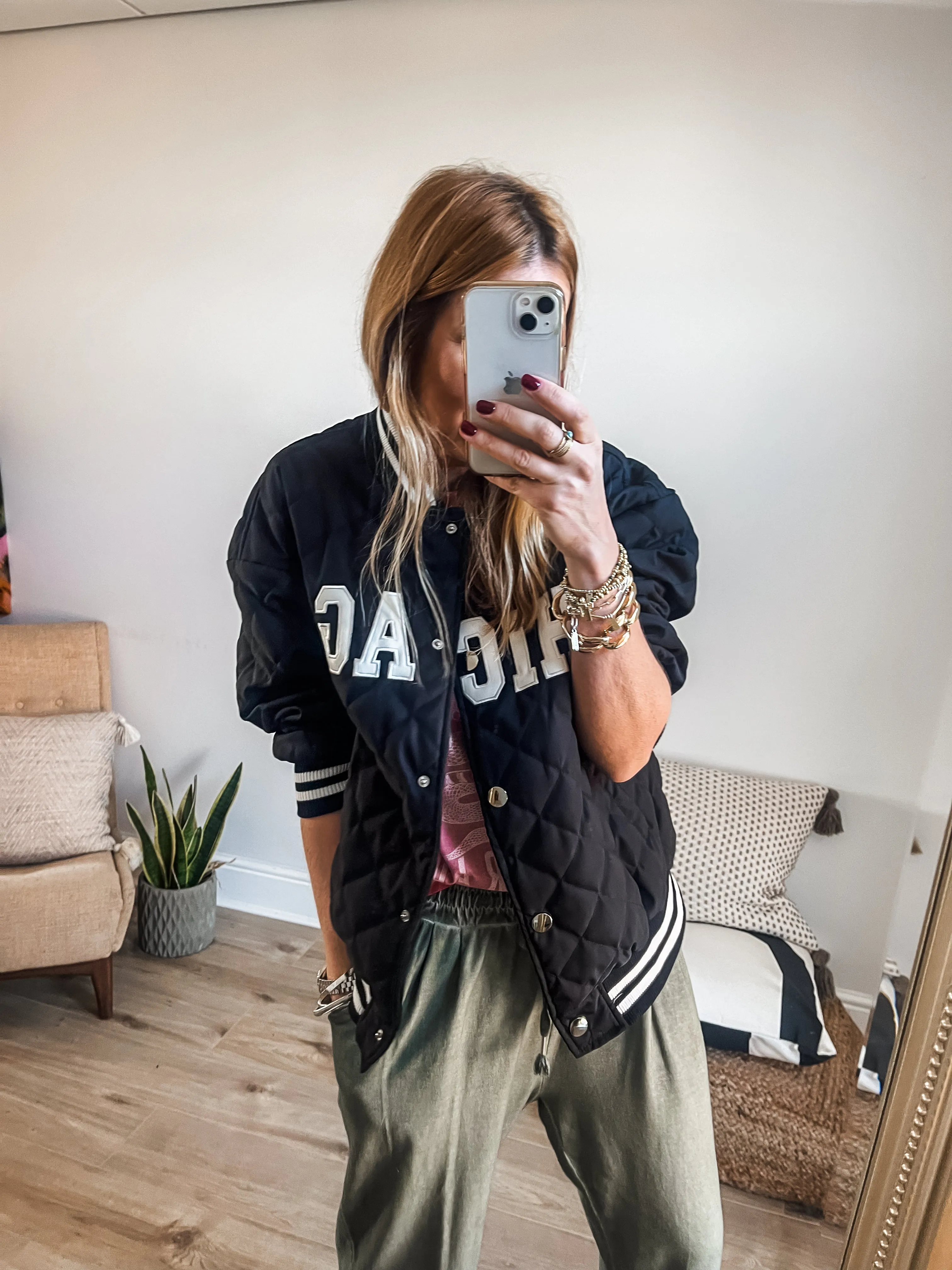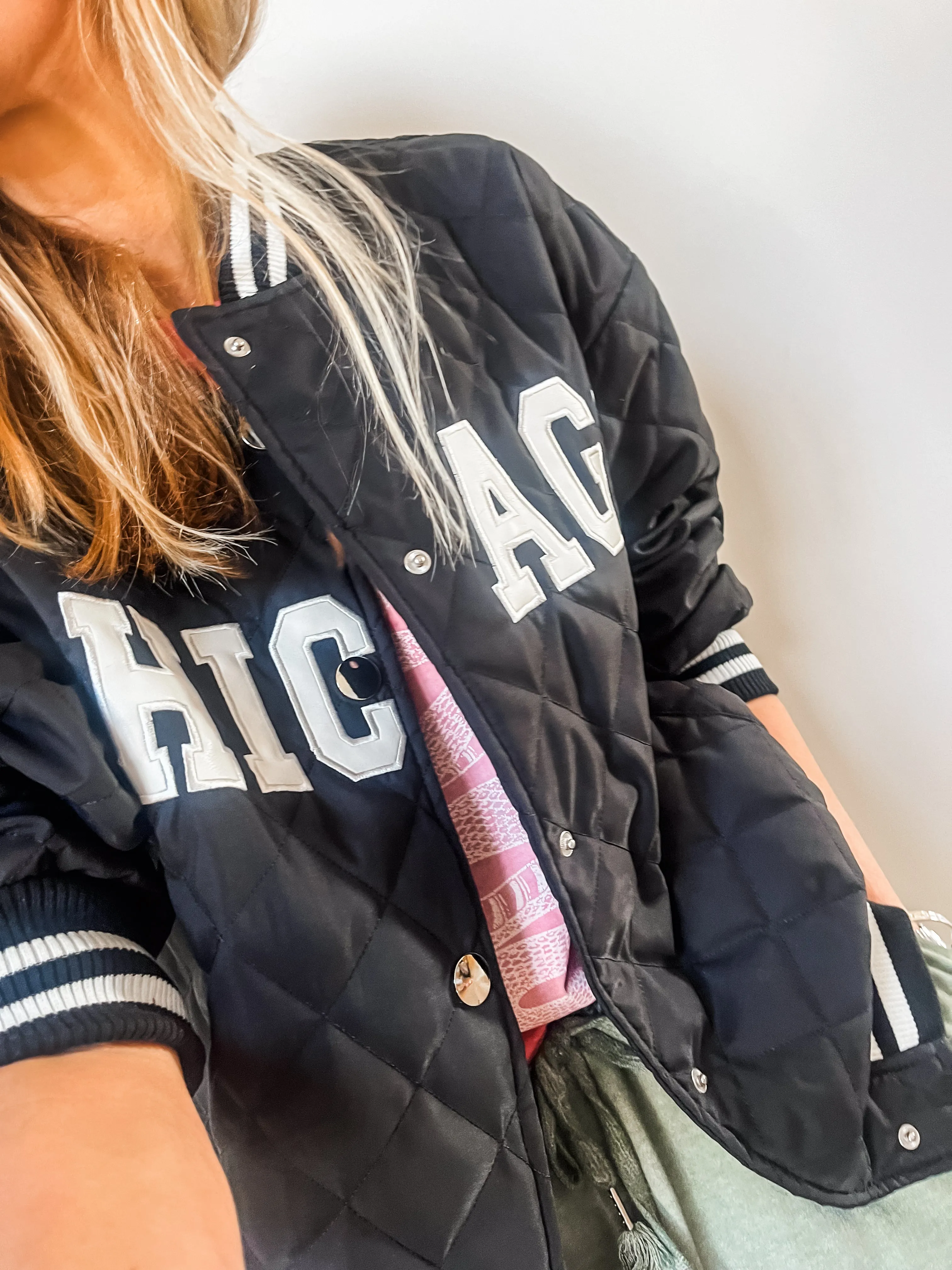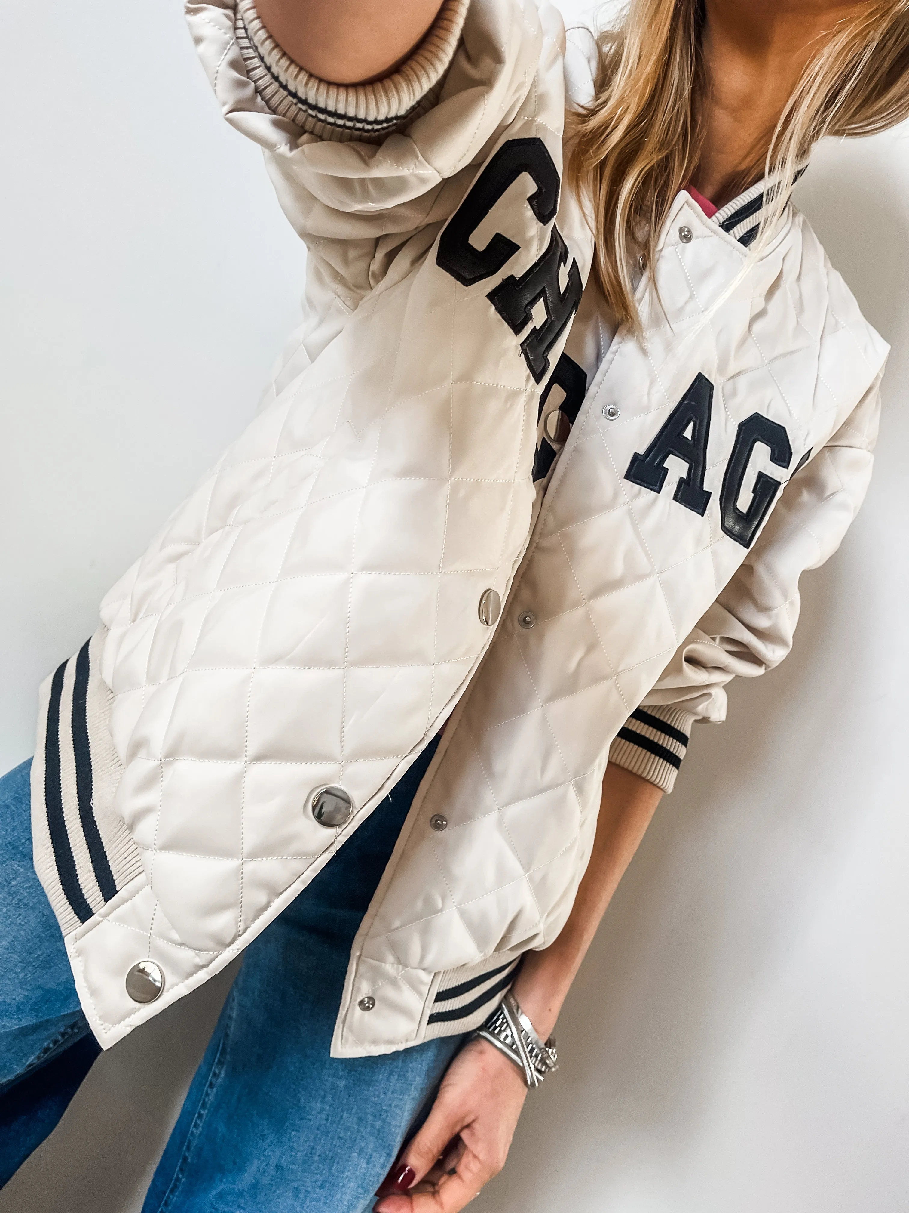 Elevate your street style with the Chicago Quilted Bomber Jacket. Its relaxed fit, baseball collar, and press stud fastening offer both comfort and on-trend fashion. With a Chicago slogan across the front and contrasting ribbed sports stripe cuffs, neckline, and hem that add a touch of athletic style to this must-have piece.