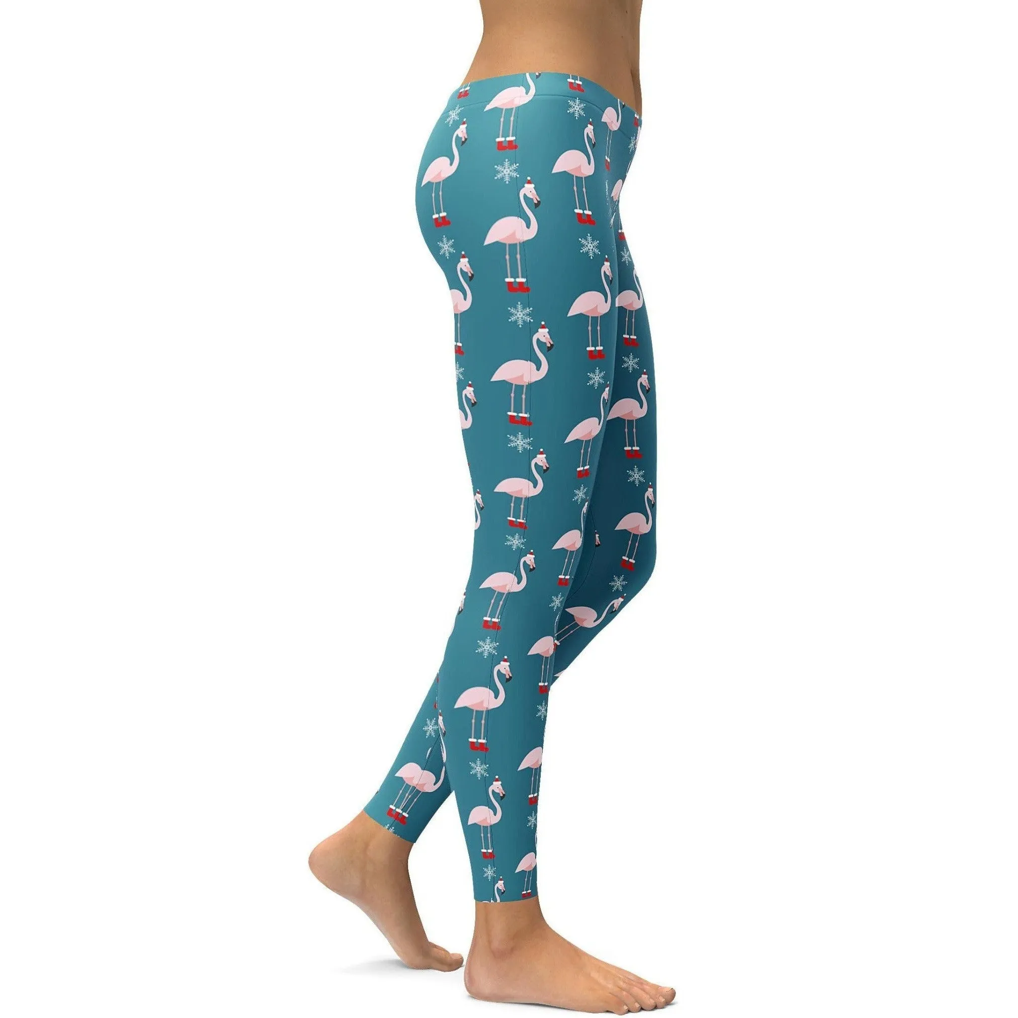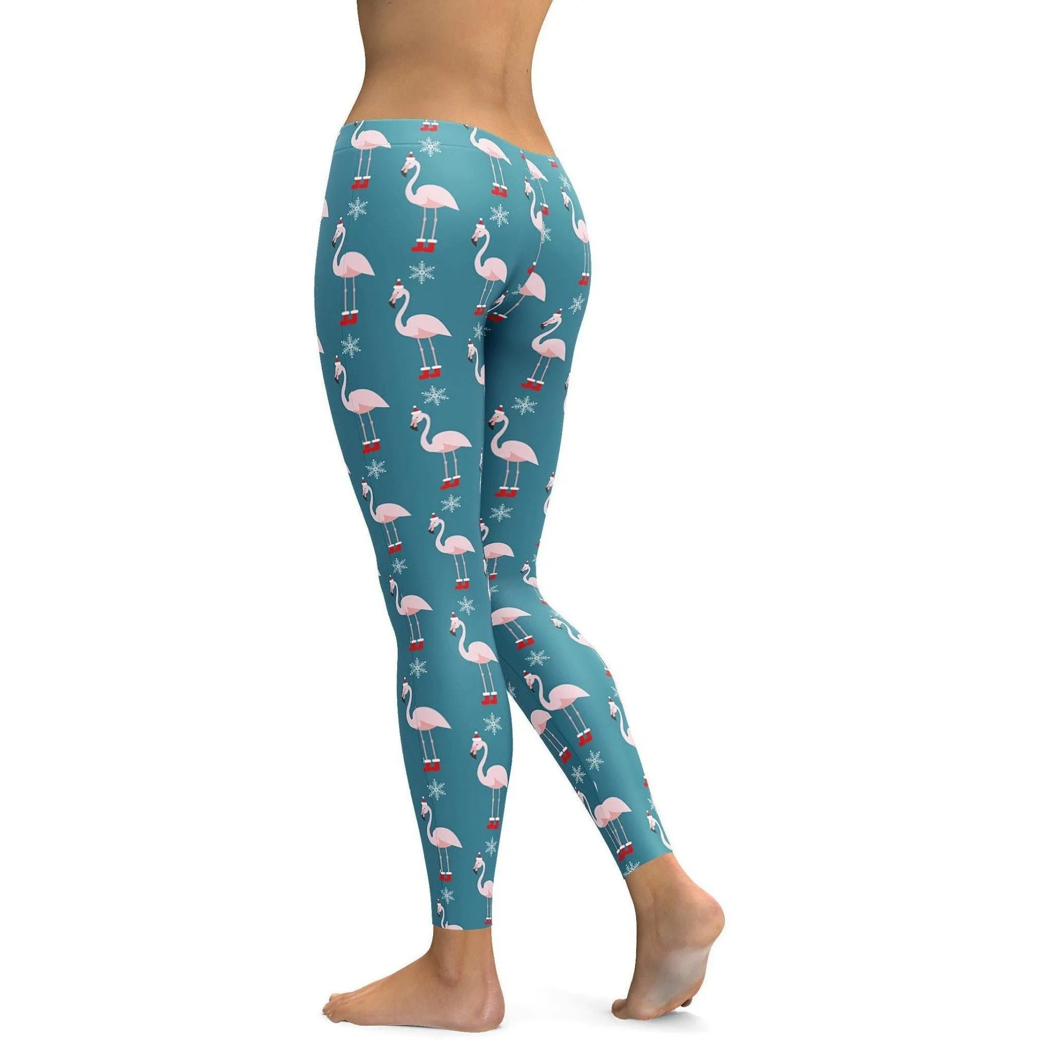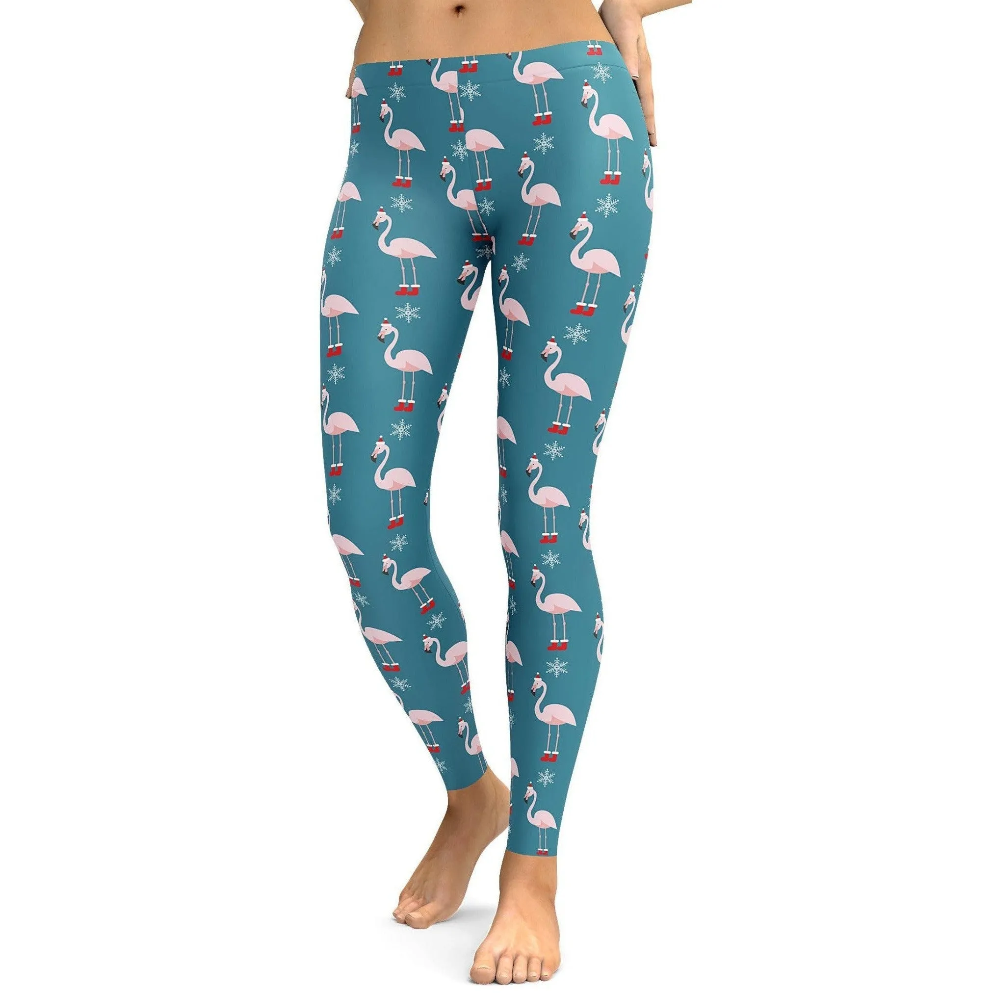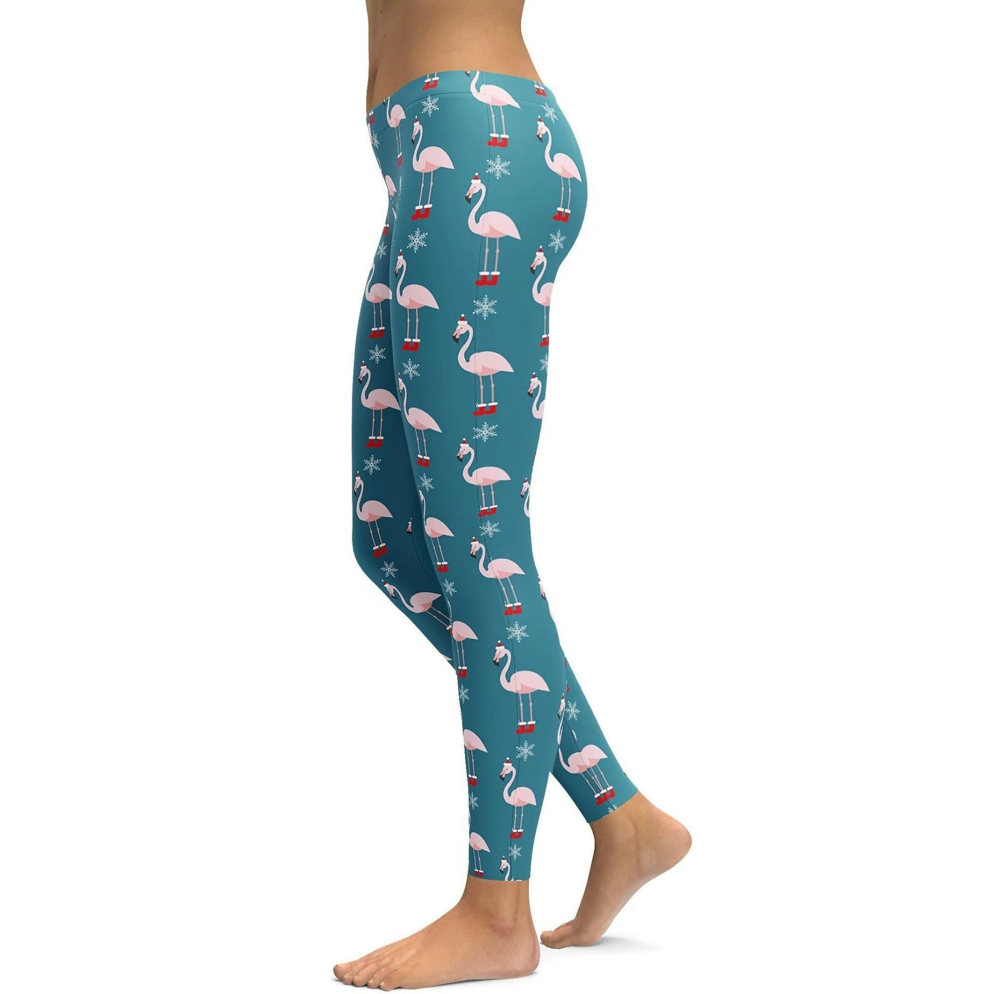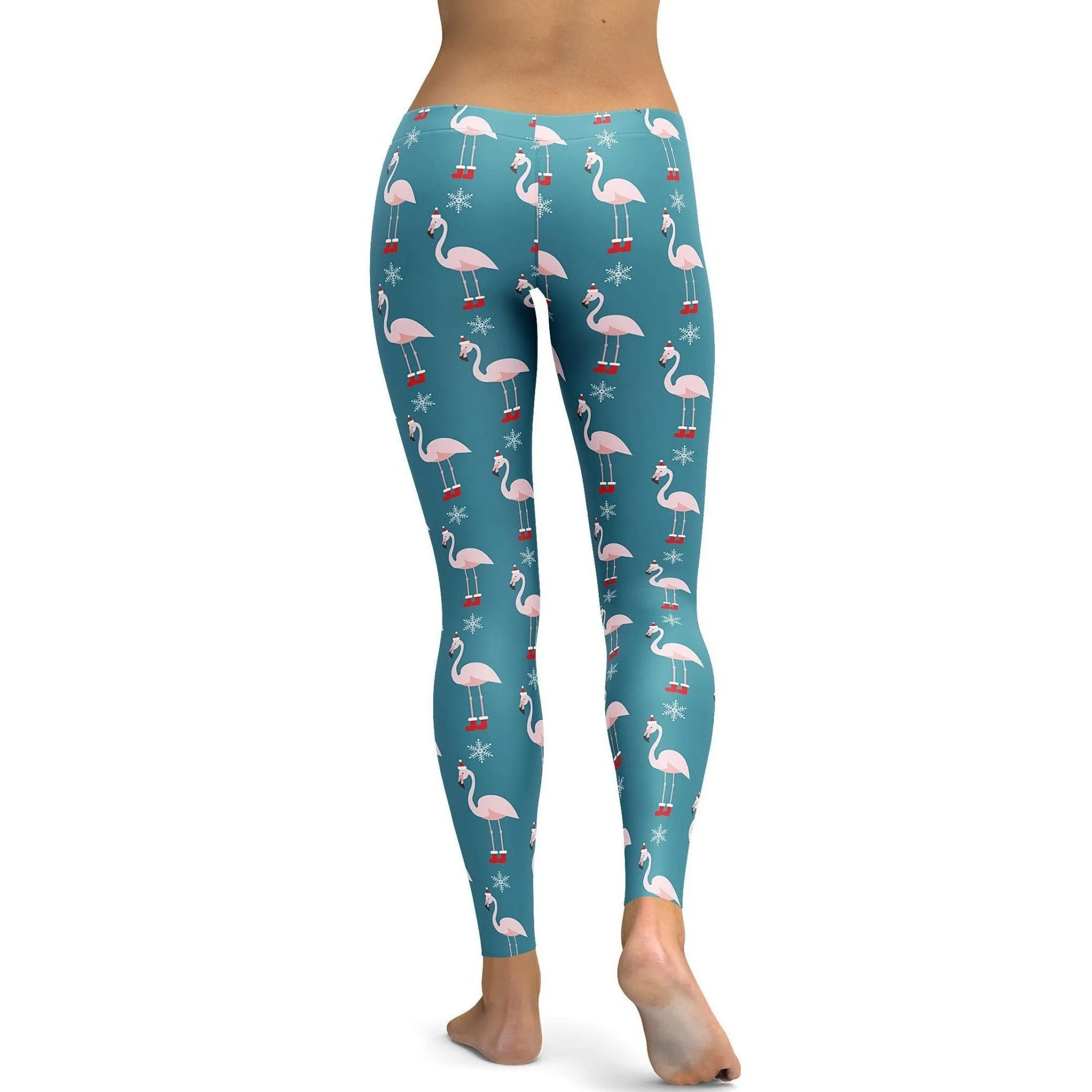 The Gearbunch Christmas Flamingo Patterned Leggings are a unique design, gorgeous soft stretchy fabric in teal green with cute pink flamingos.