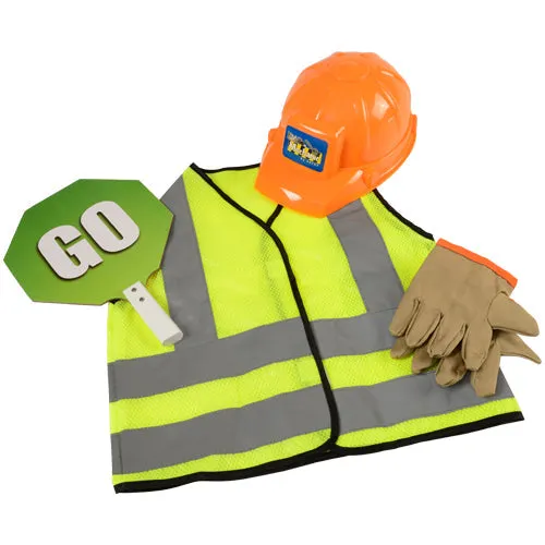 Pretend you are a road worker with this realistic Road Worker Outfit. It has easy slip-on, hook and loop closures and includes a Vest, Stop Sign, and Hard Hat.