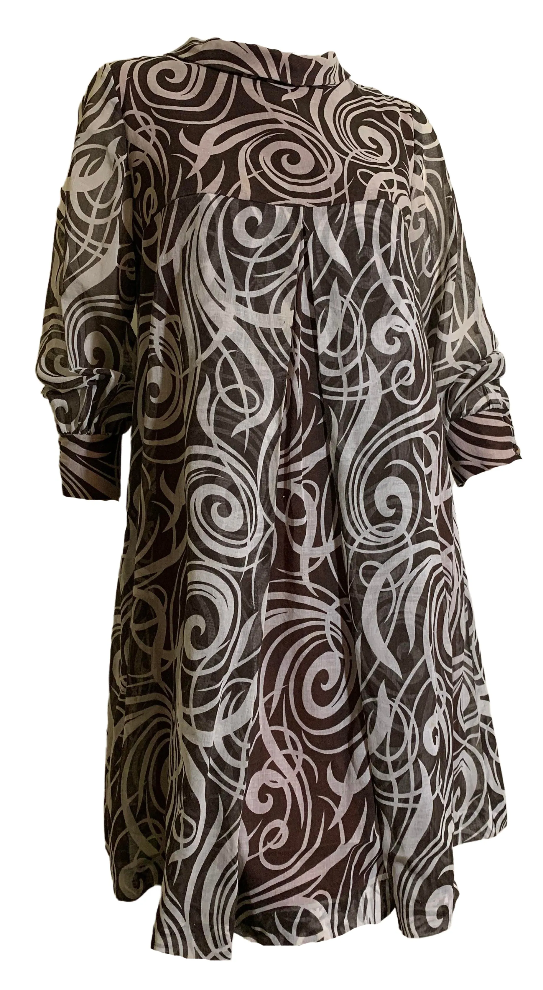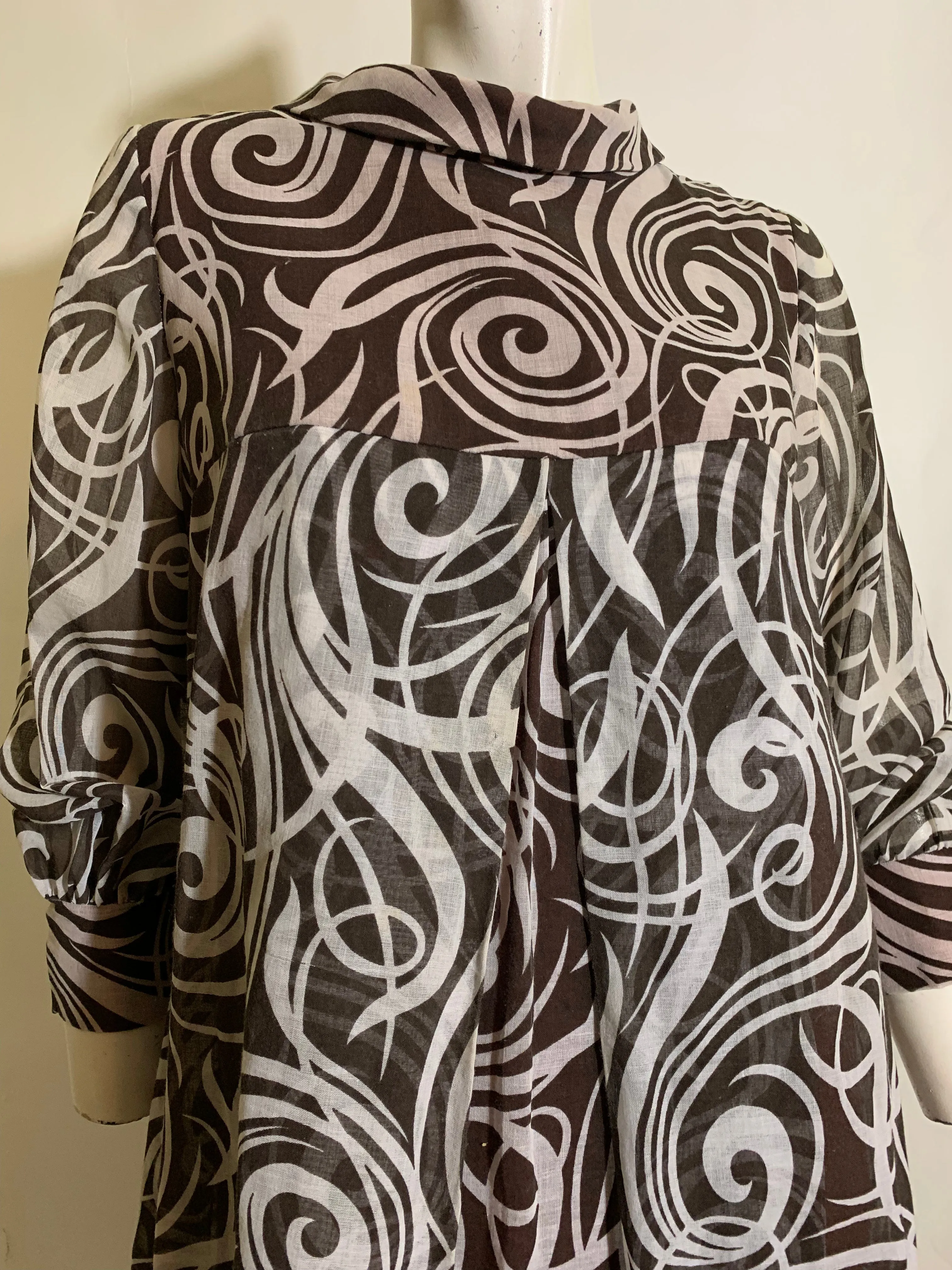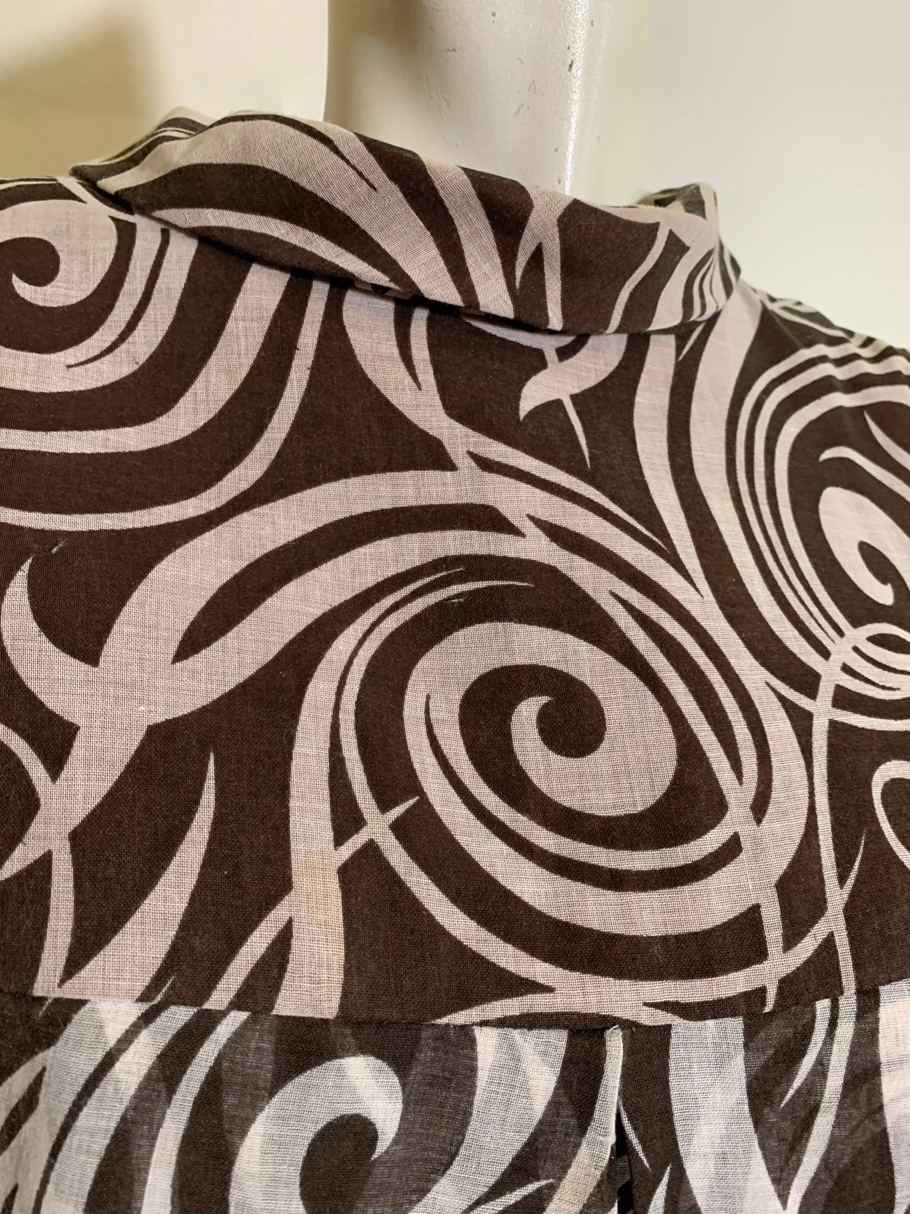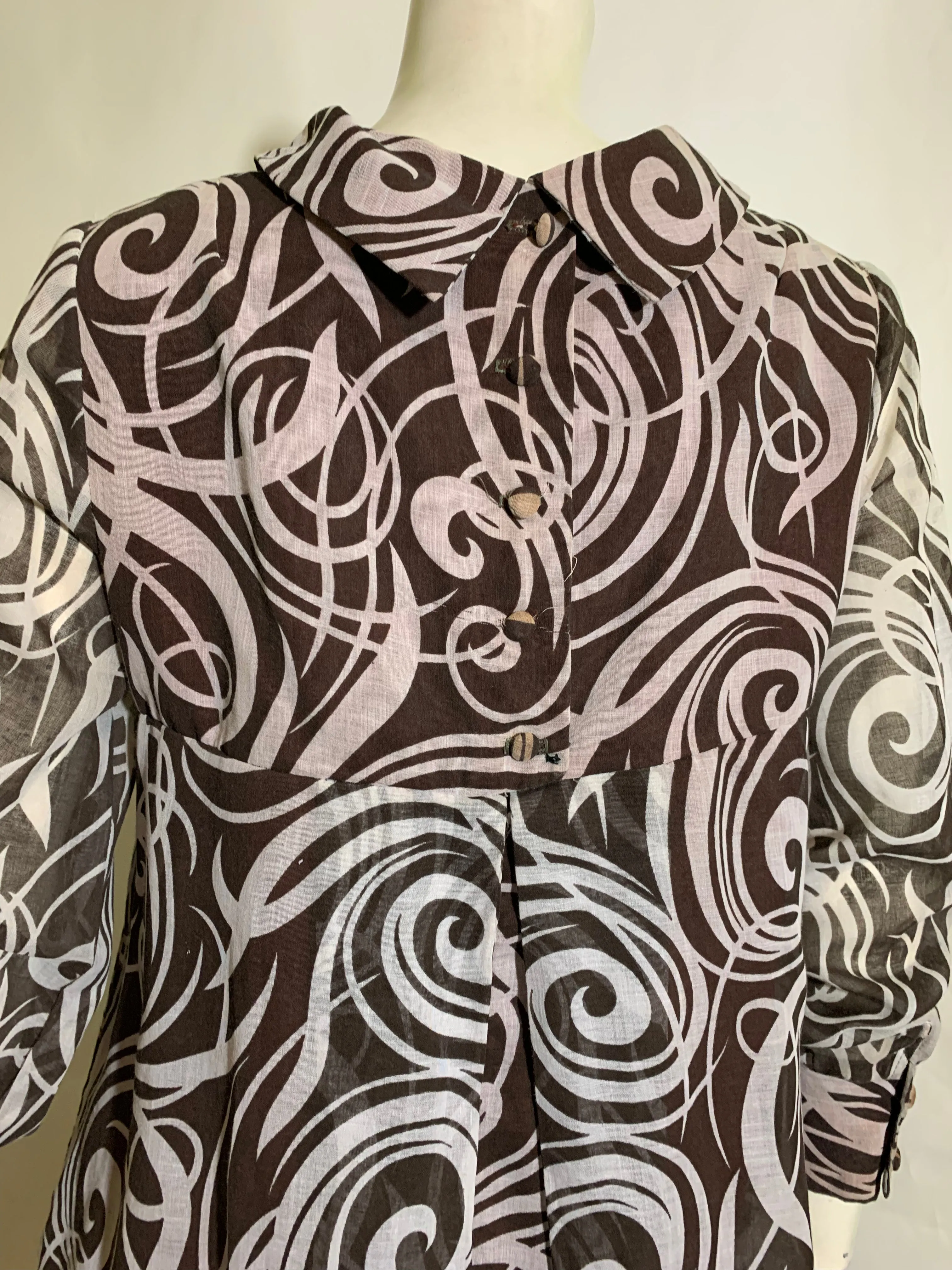 Cocoa and white swirled print semi-sheer cotton swing dress lined with brown acetate taffeta. Fold down collar, wide sleeve cuffs with covered buttons- more buttons on back of upper bodice, zips below. Single large pleat center front. Minor wear, no stains or holes.
