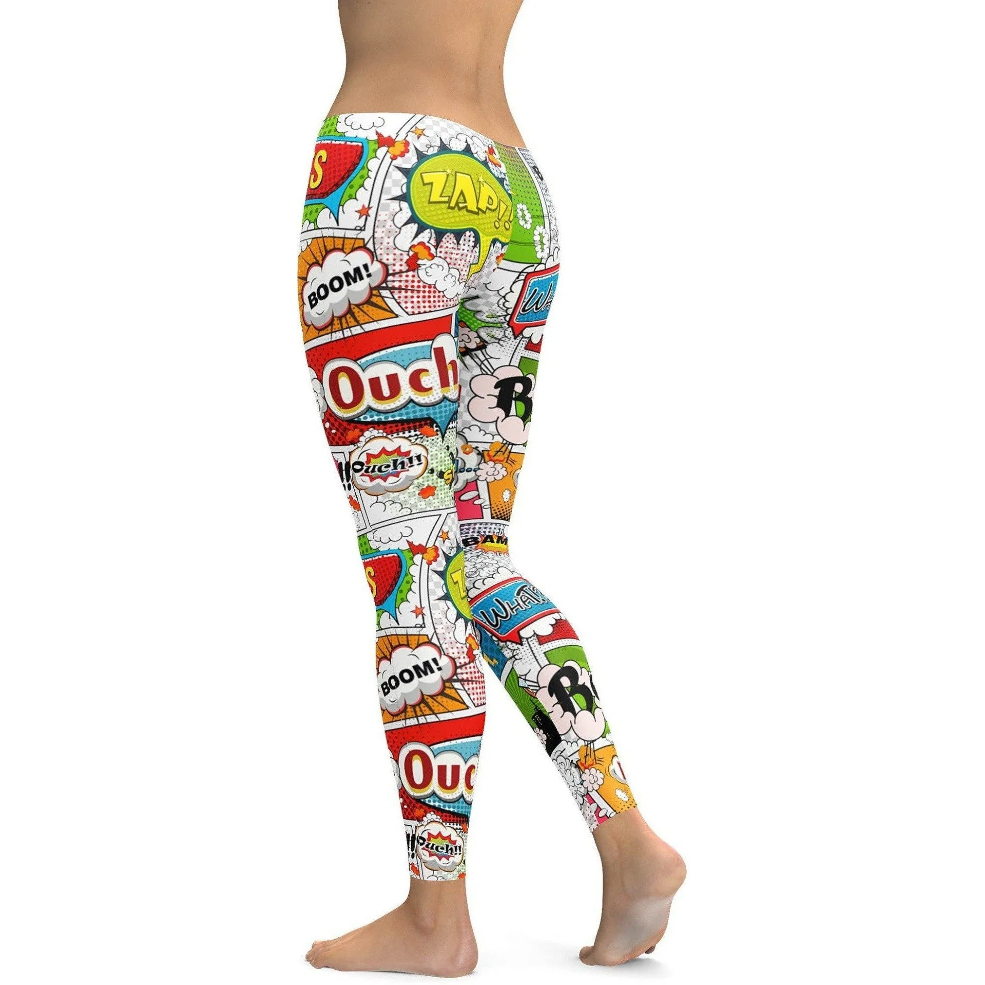 Escape to the world of comic books when wearing the Gearbunch Comic Super Hero Leggings. They feature an all over comic book inspired print with cool text in vibrant green, blue, orange, red, white and black