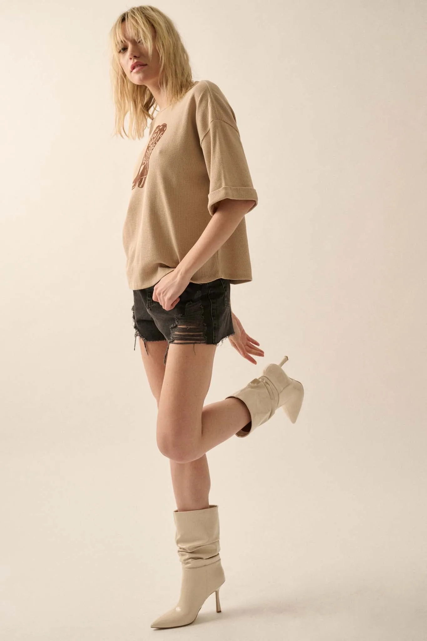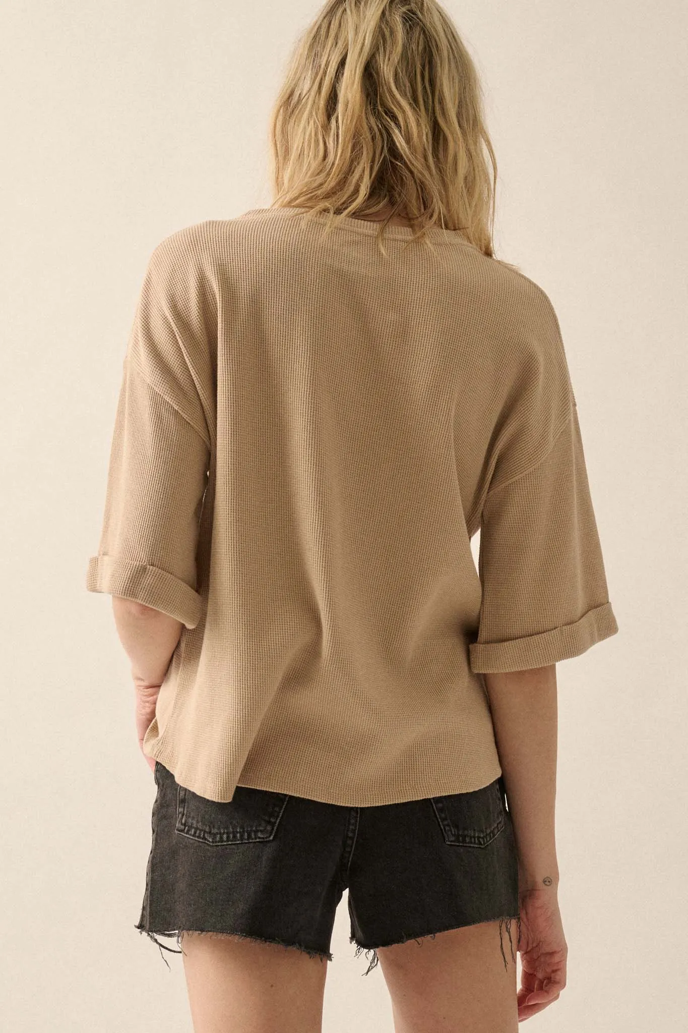 • Waffle-knit thermal graphic tee.