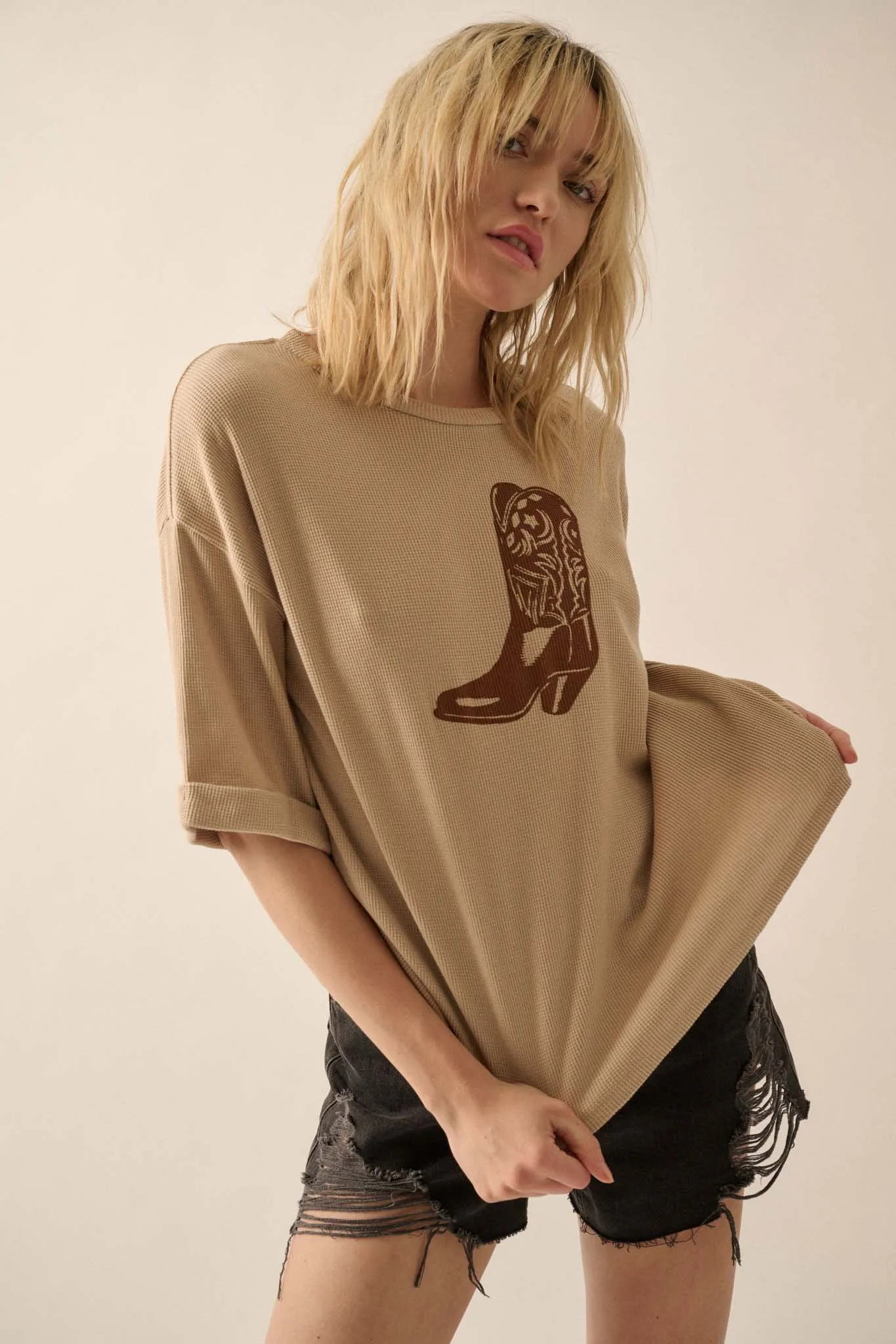 • Vintage-style western cowboy boot graphic print.