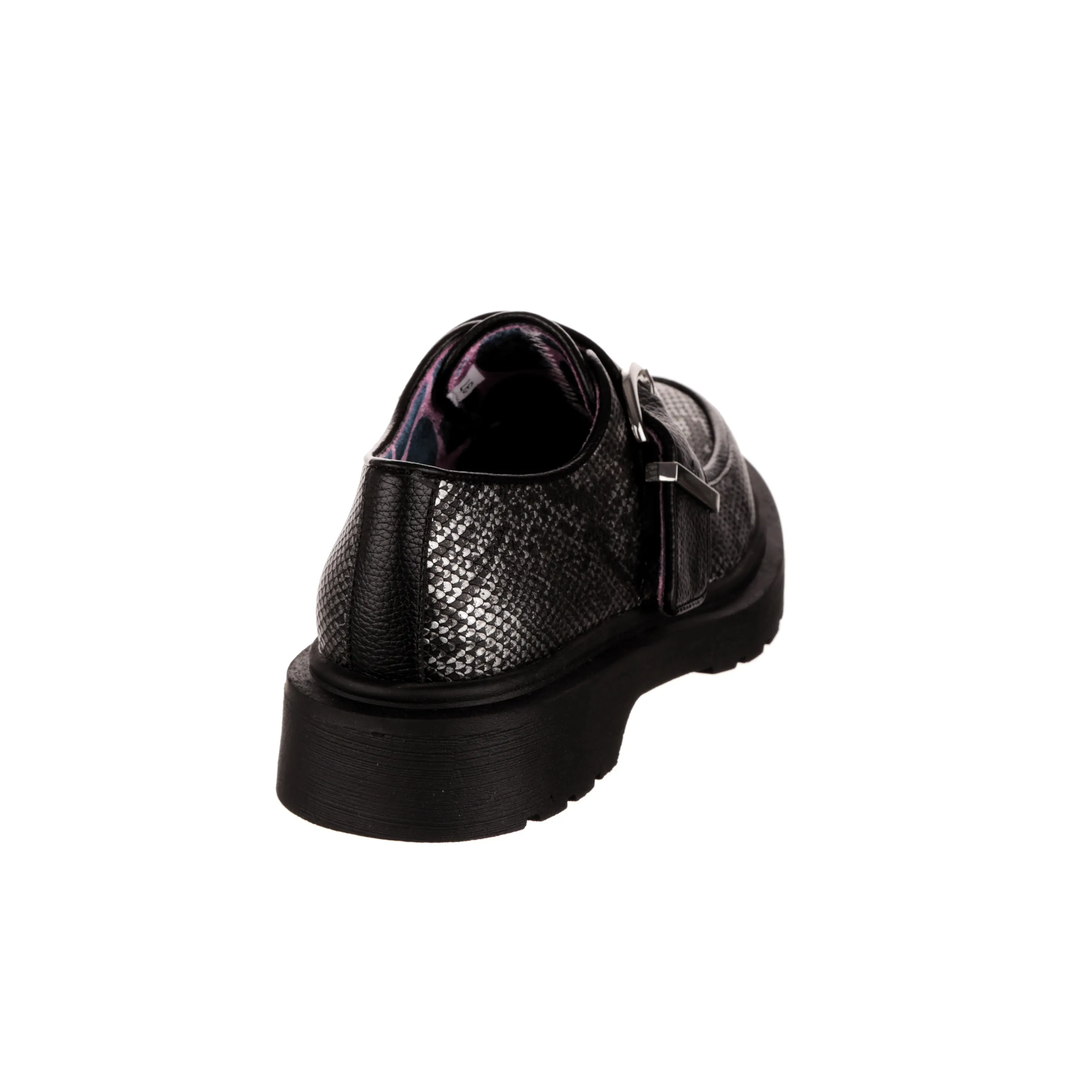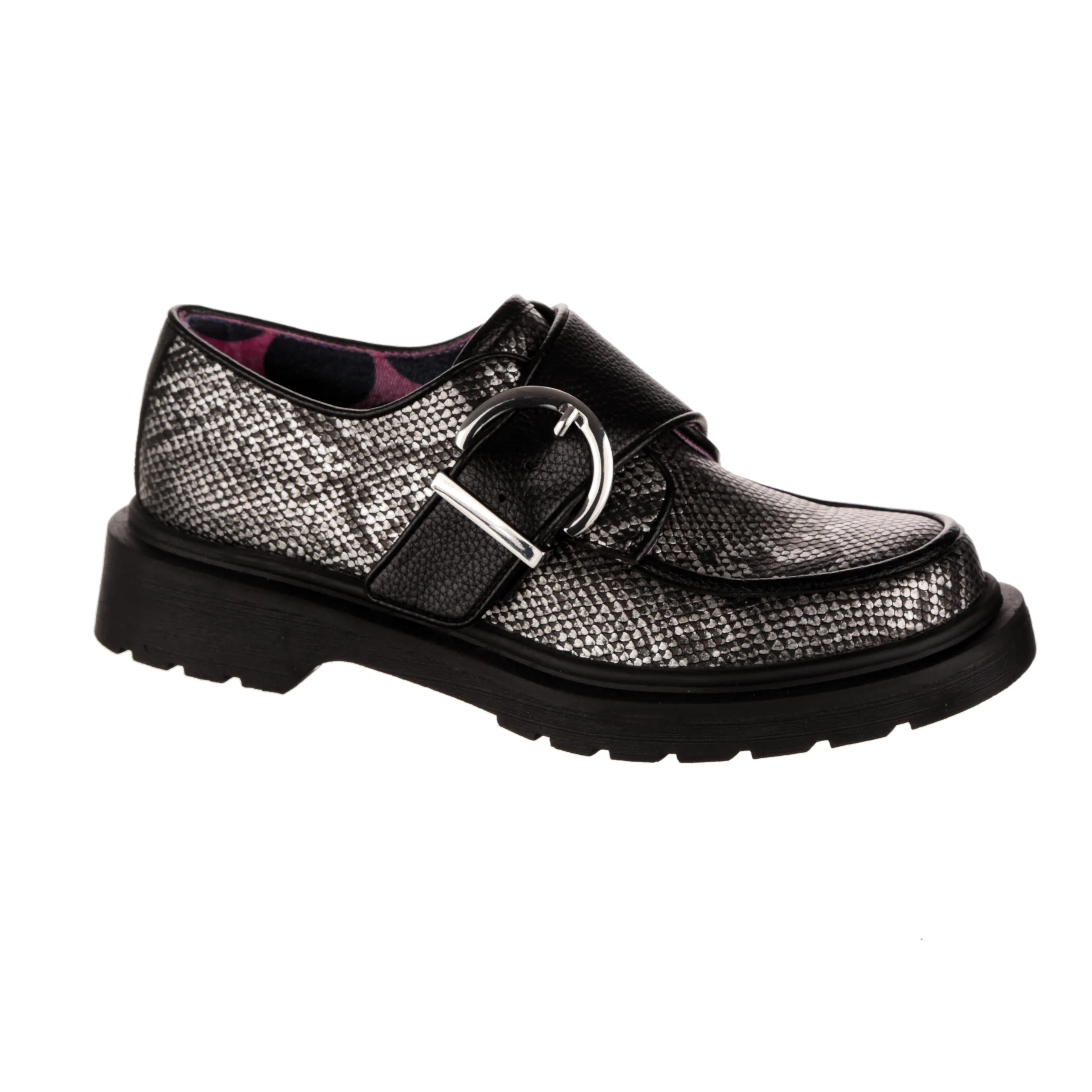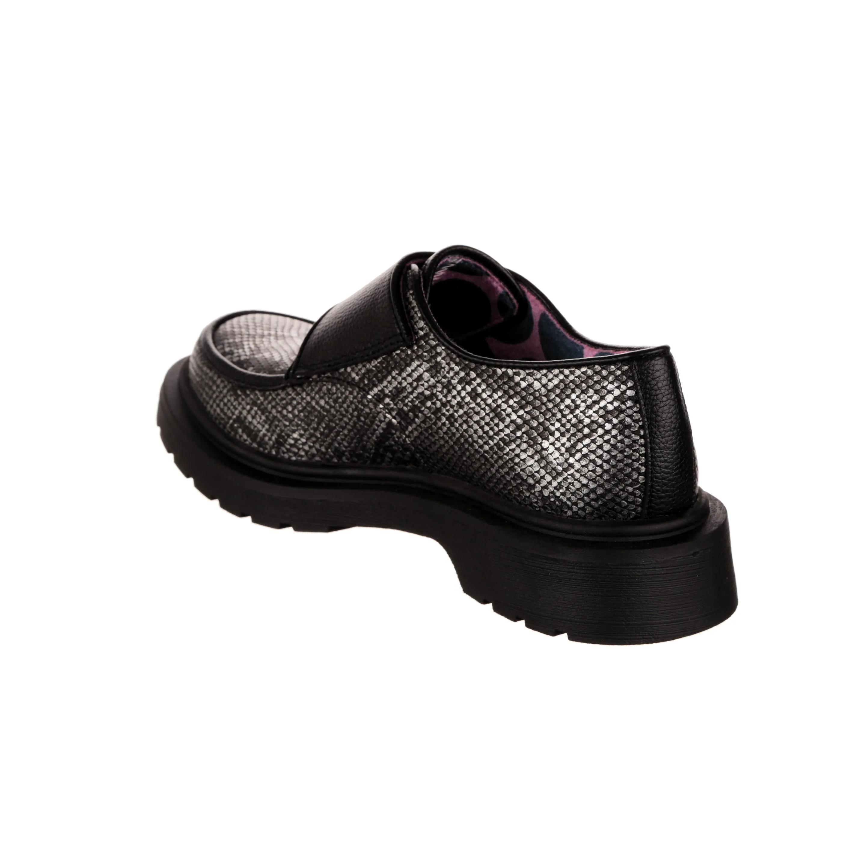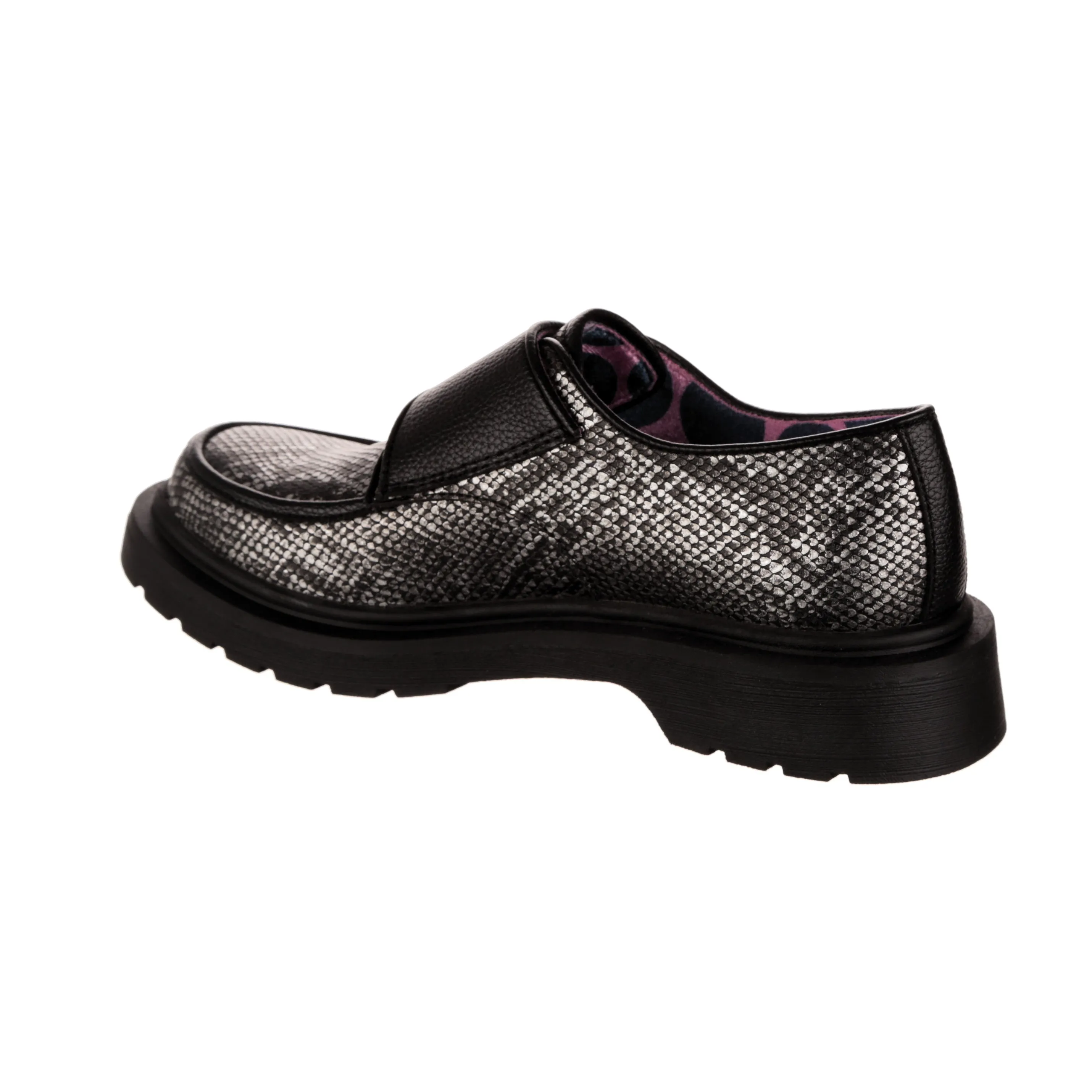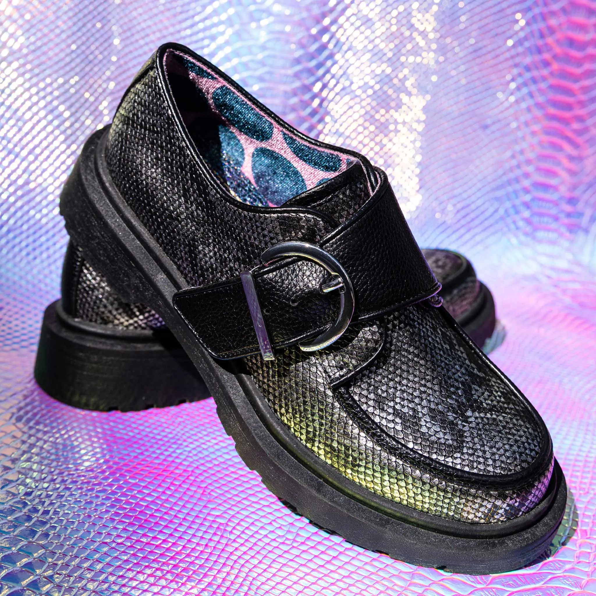 Cool and casual, these vintage-style brogues feature iridescent silver and black snakeskin accented by a reflective, rainbow quality that you'll want to wear day and night. The single black monk strap has an adjustable oversized buckle for that statement feel, the perfect finishing touch to your look!