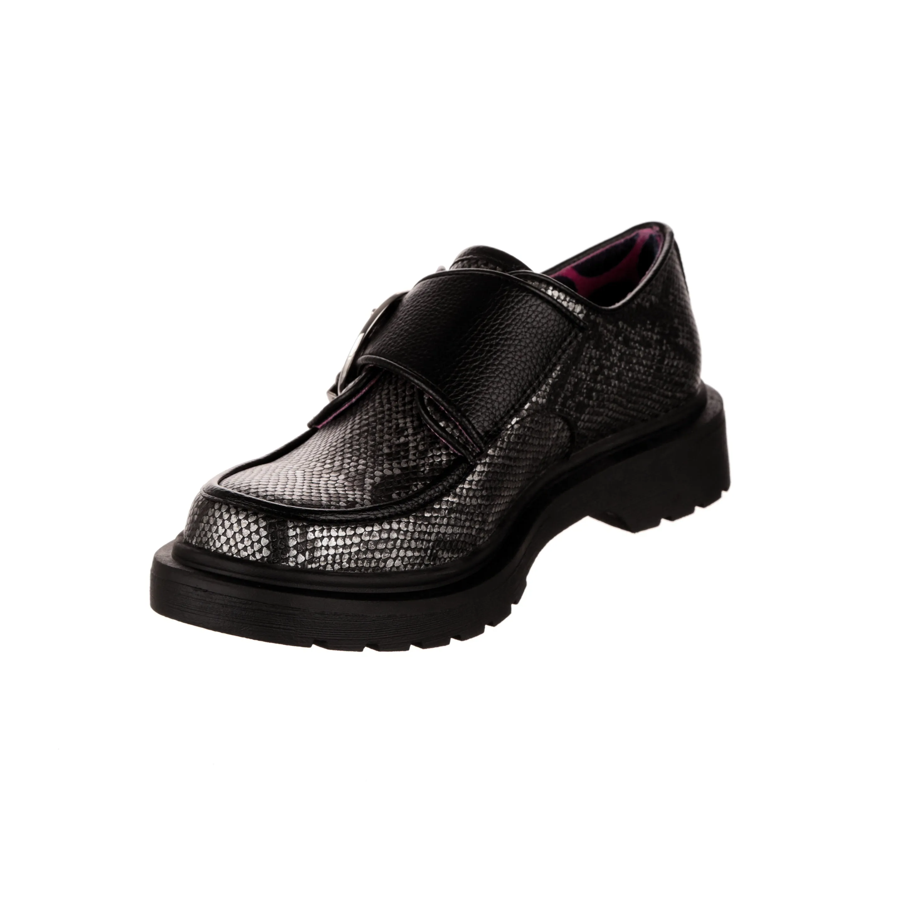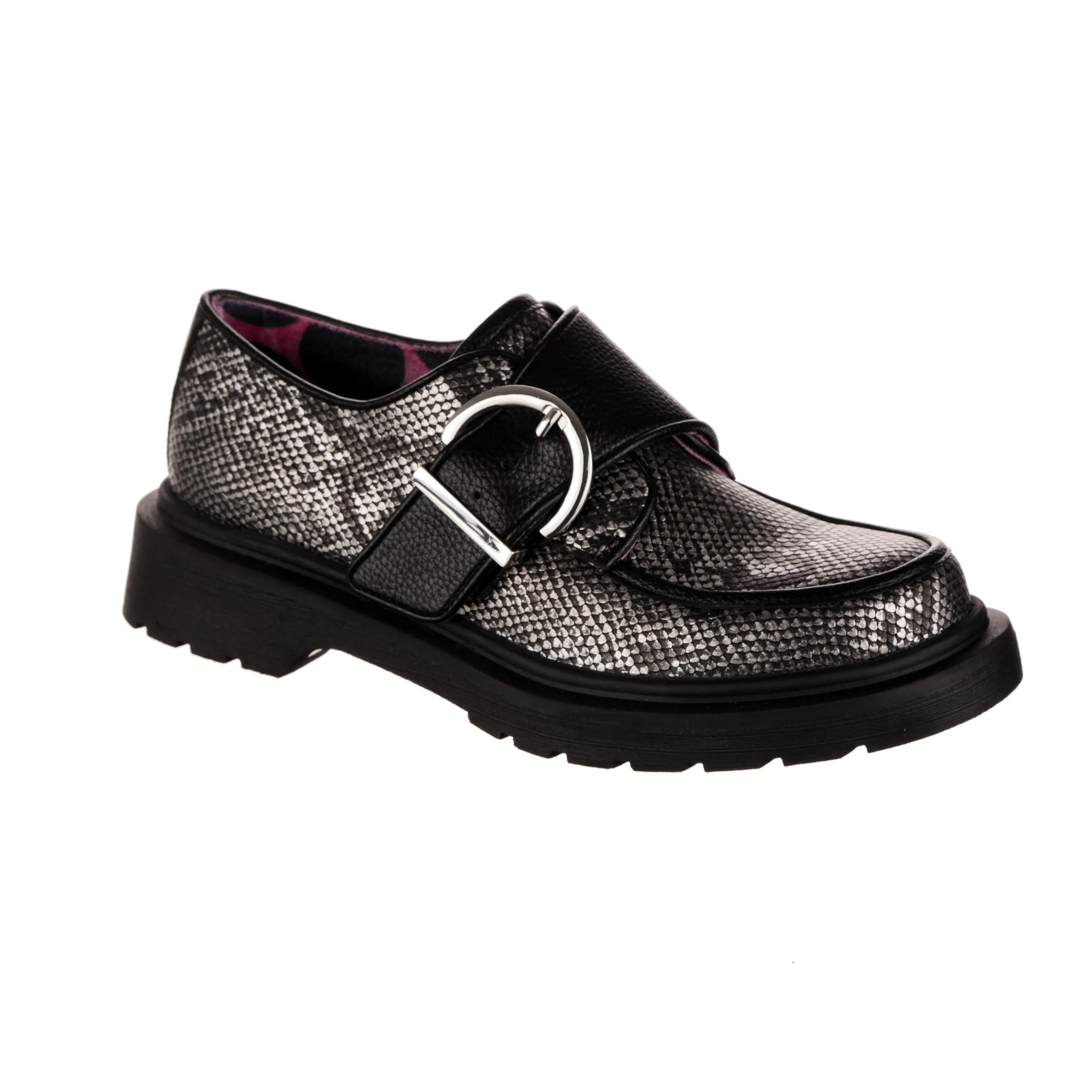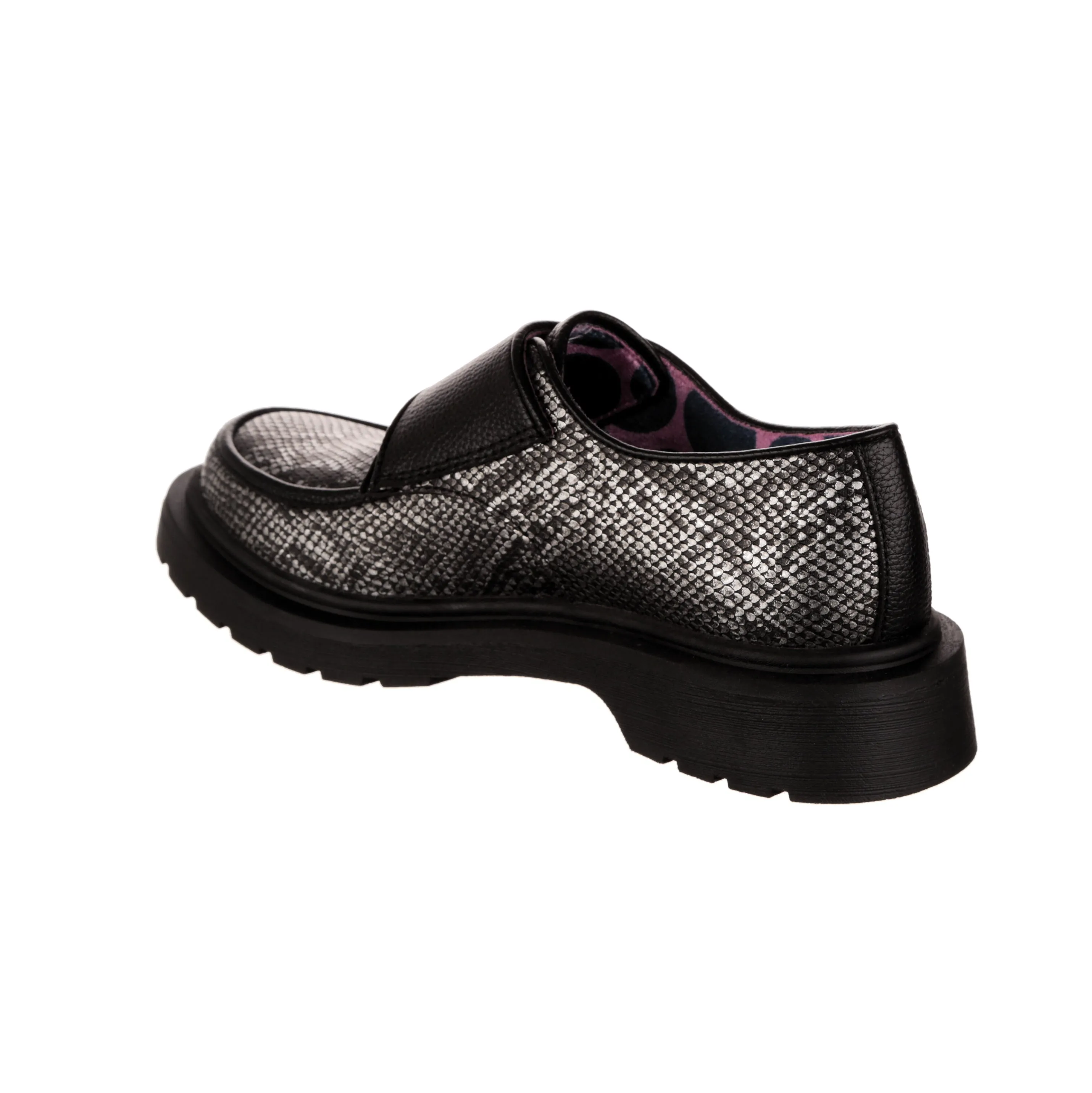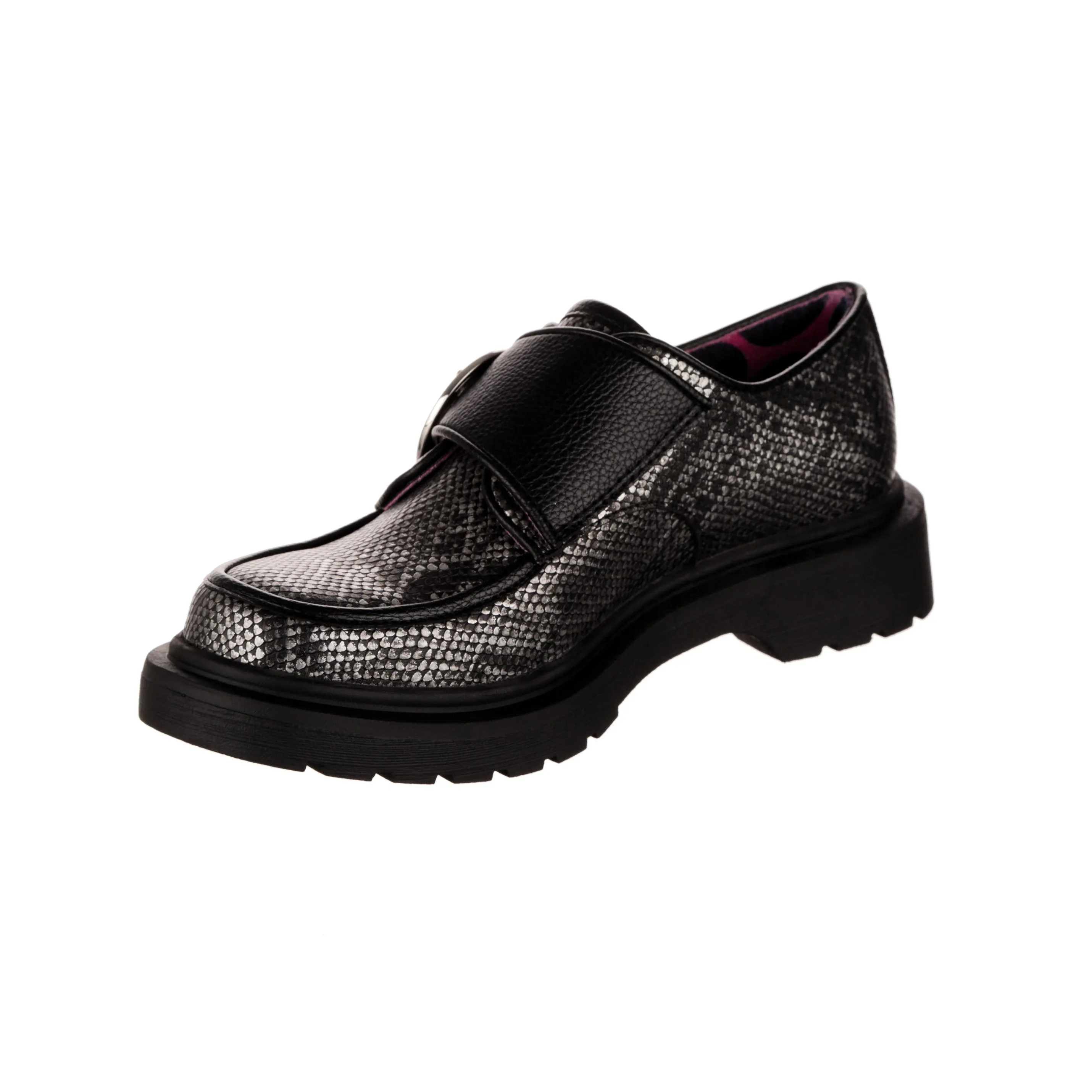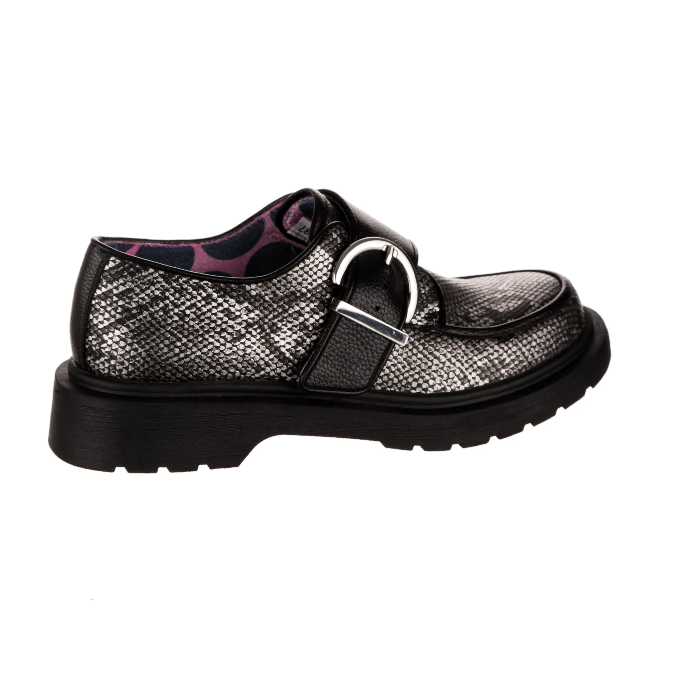Cool and casual, these vintage-style brogues feature iridescent silver and black snakeskin accented by a reflective, rainbow quality that you'll want to wear day and night. The single black monk strap has an adjustable oversized buckle for that statement feel, the perfect finishing touch to your look!