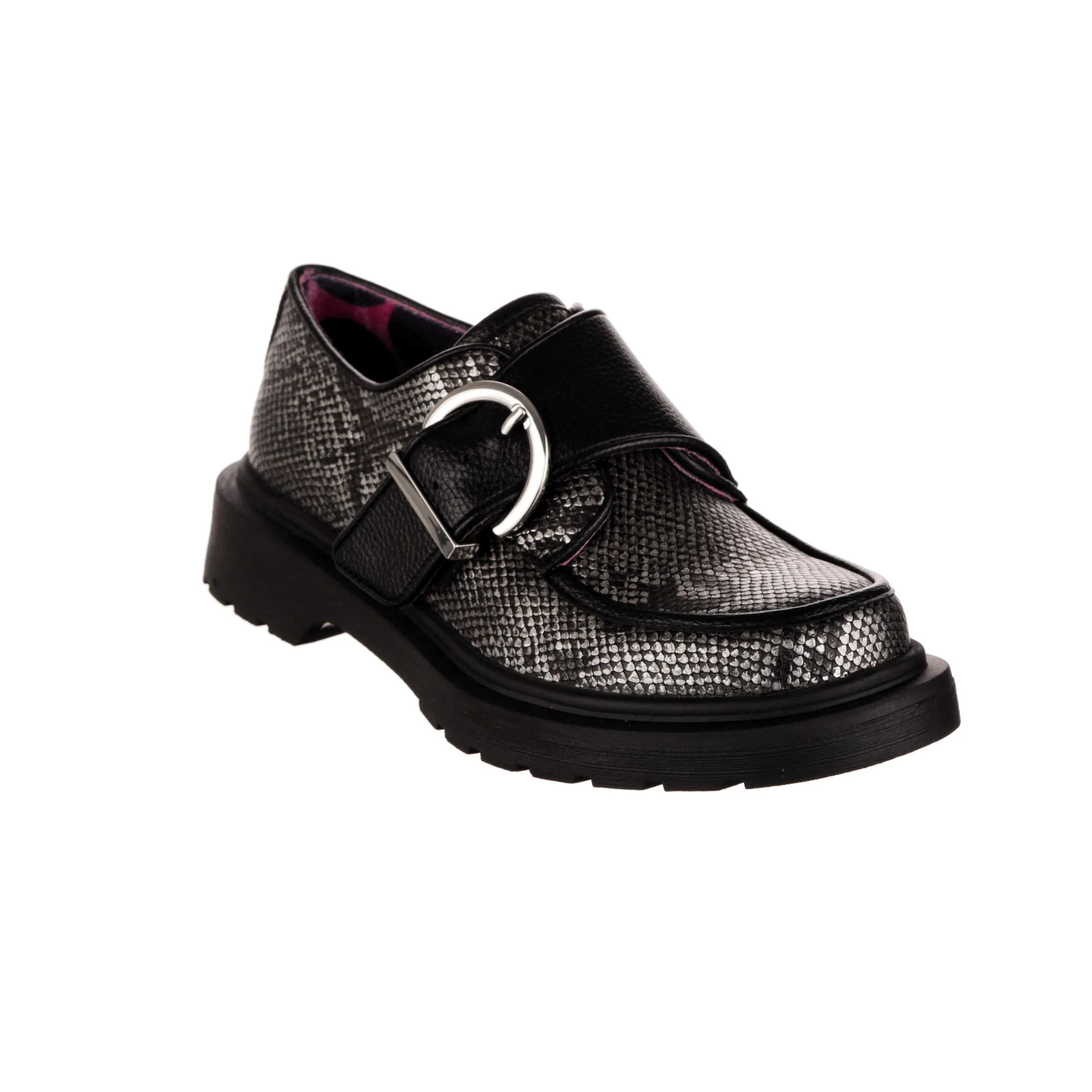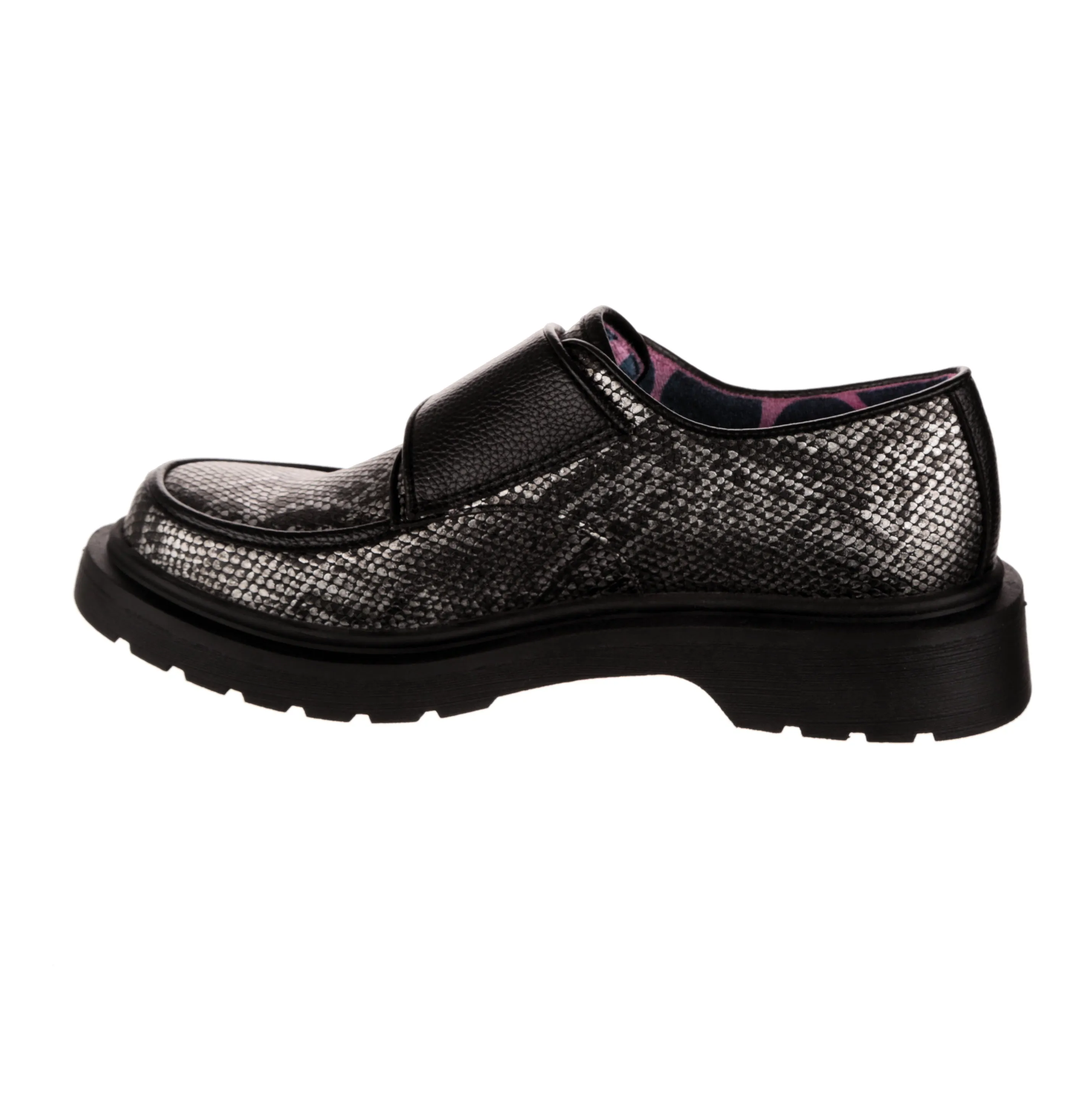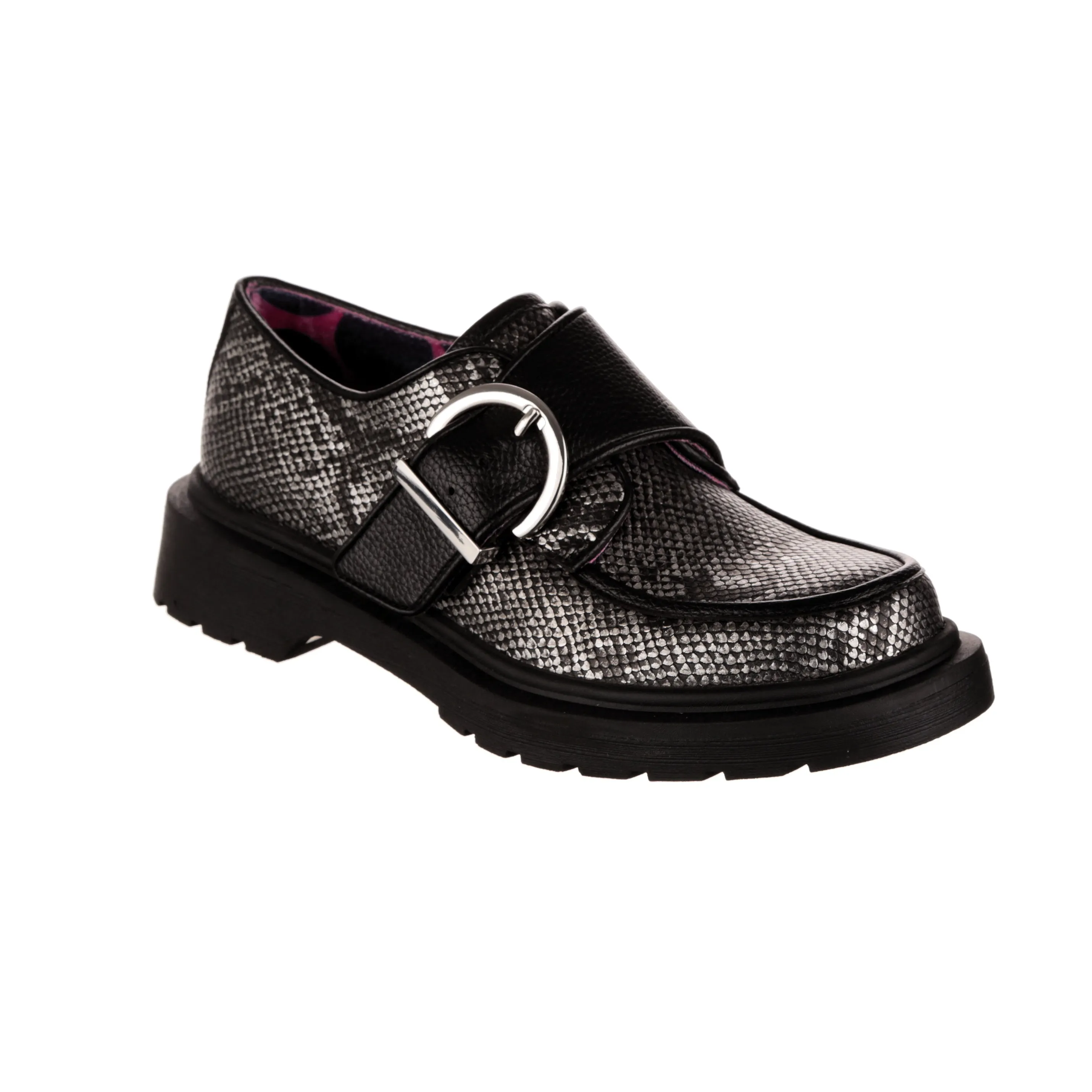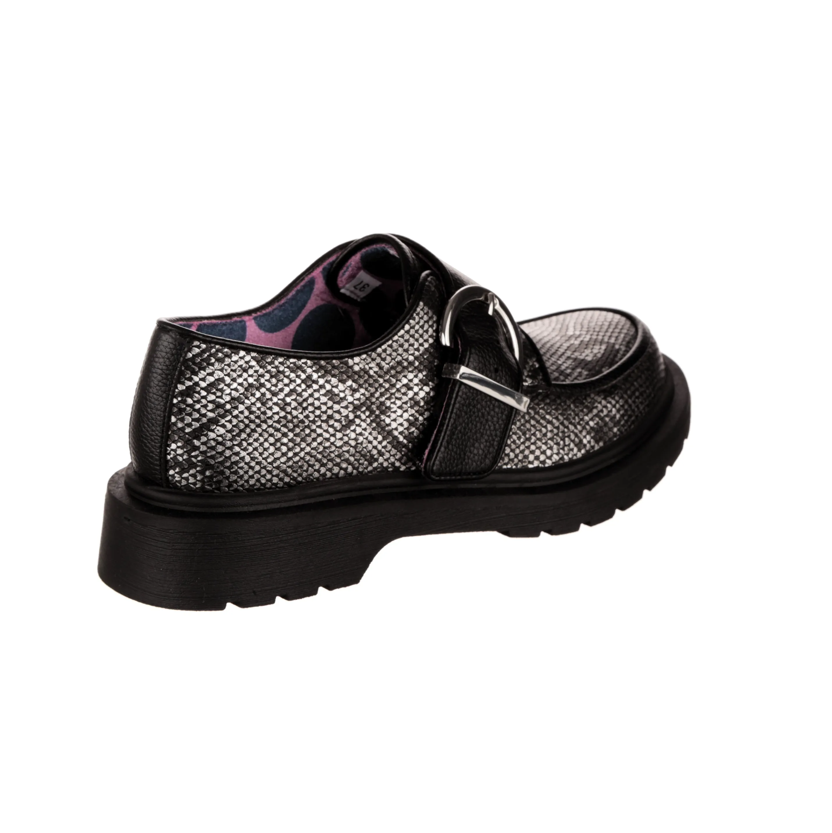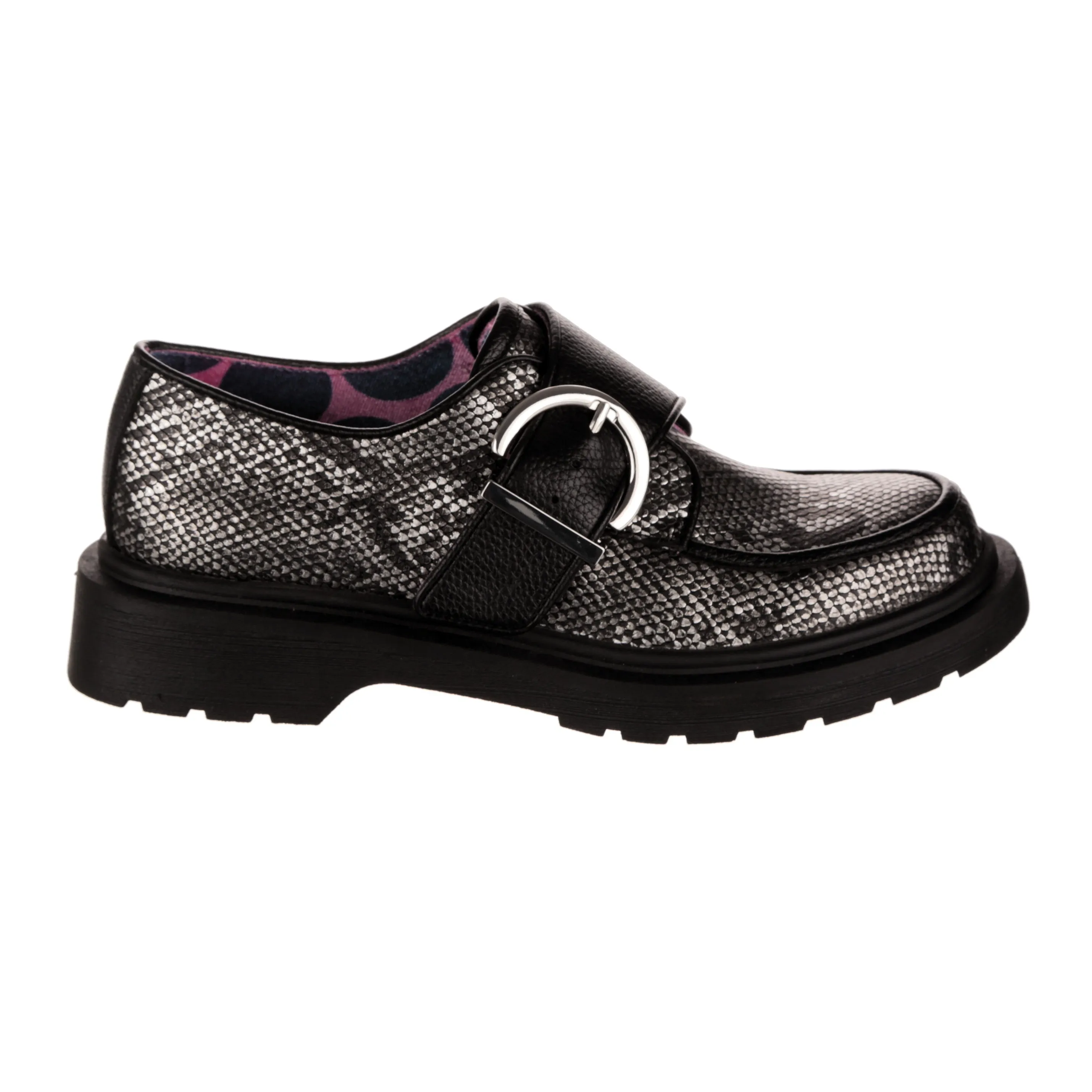 Cool and casual, these vintage-style brogues feature iridescent silver and black snakeskin accented by a reflective, rainbow quality that you'll want to wear day and night. The single black monk strap has an adjustable oversized buckle for that statement feel, the perfect finishing touch to your look!