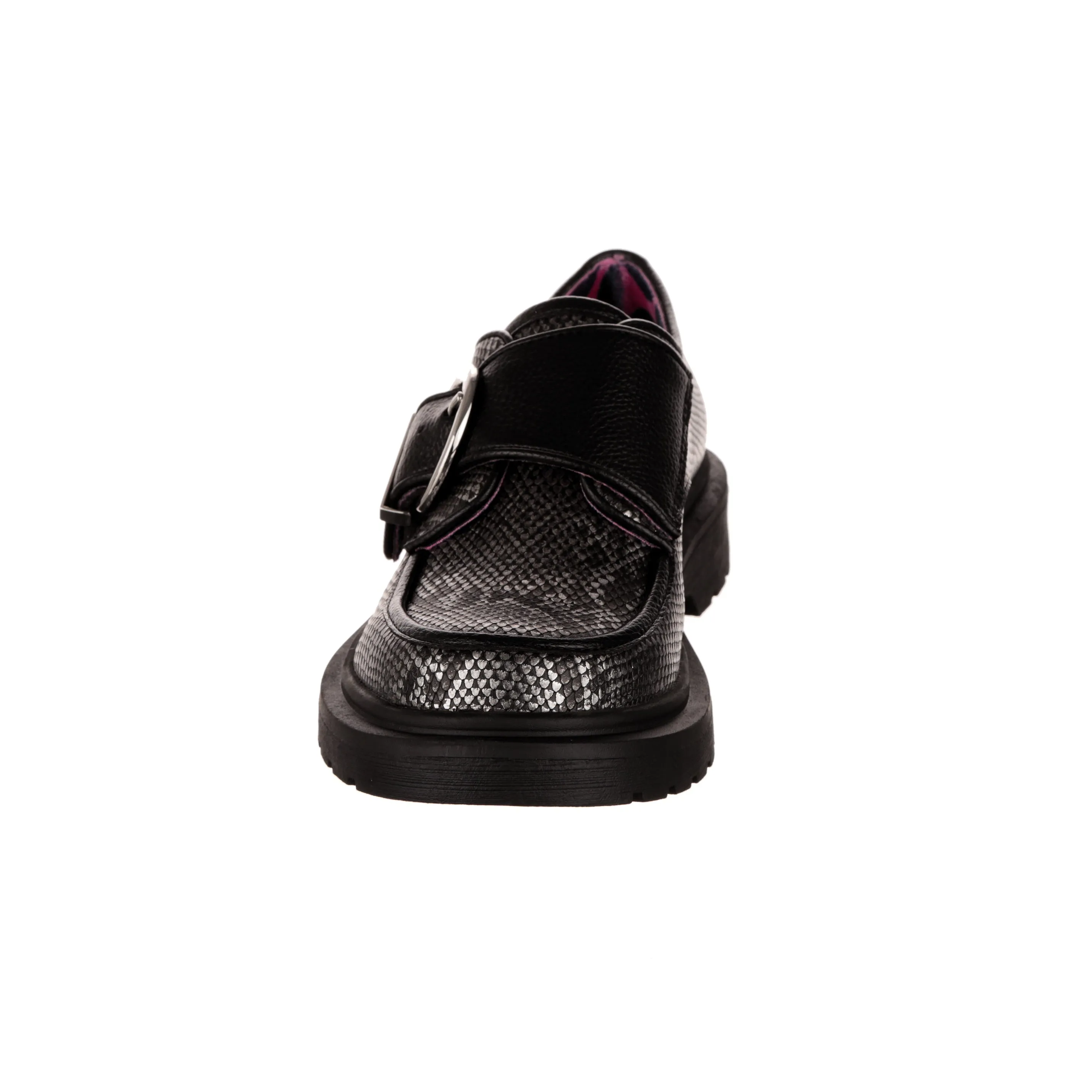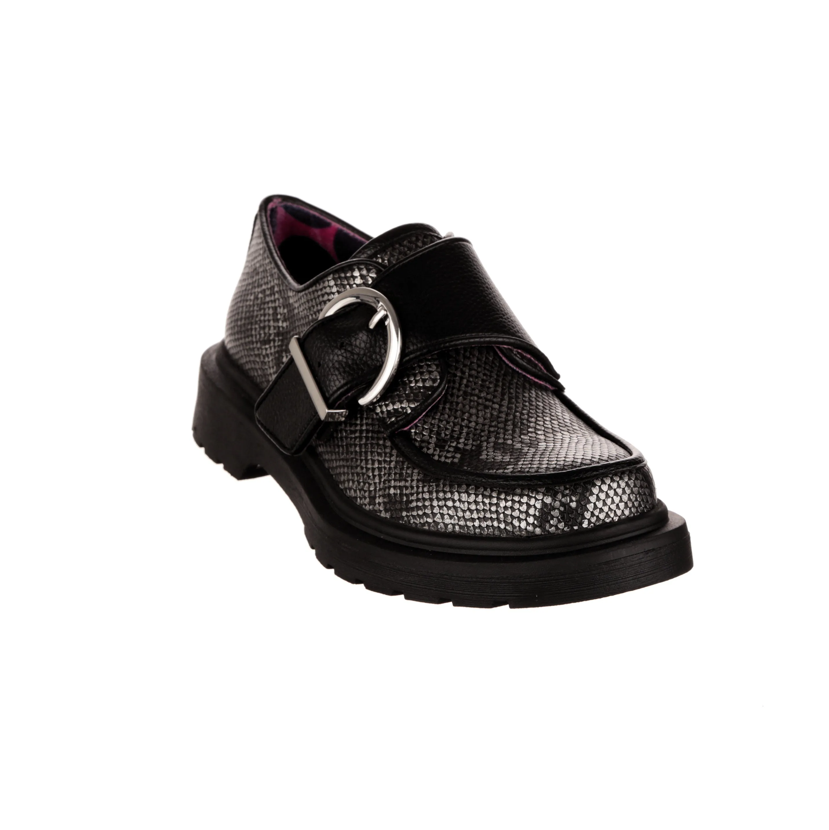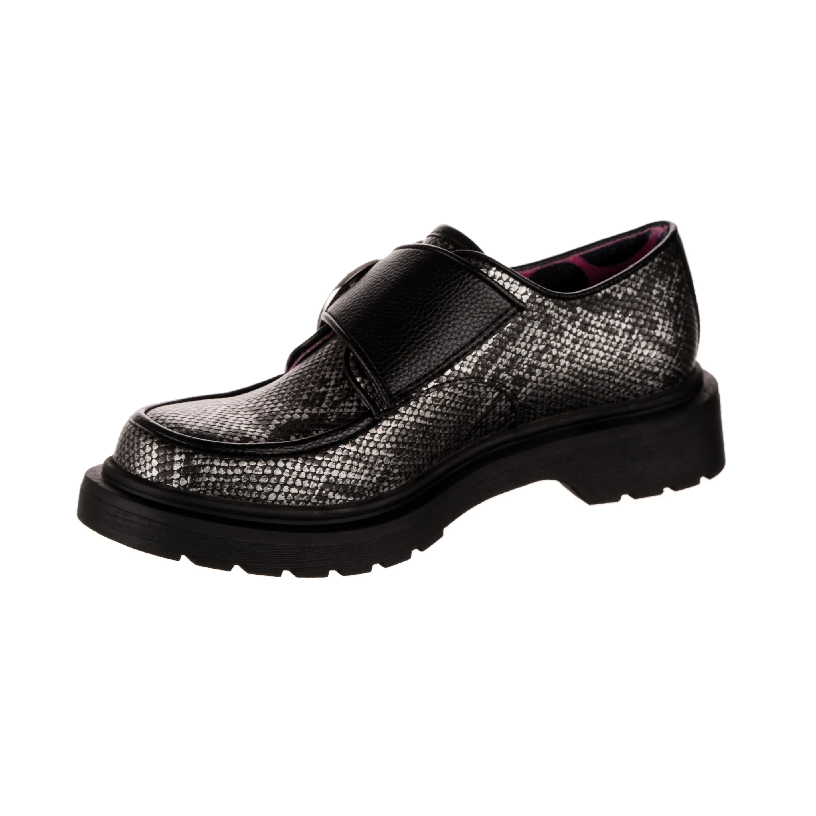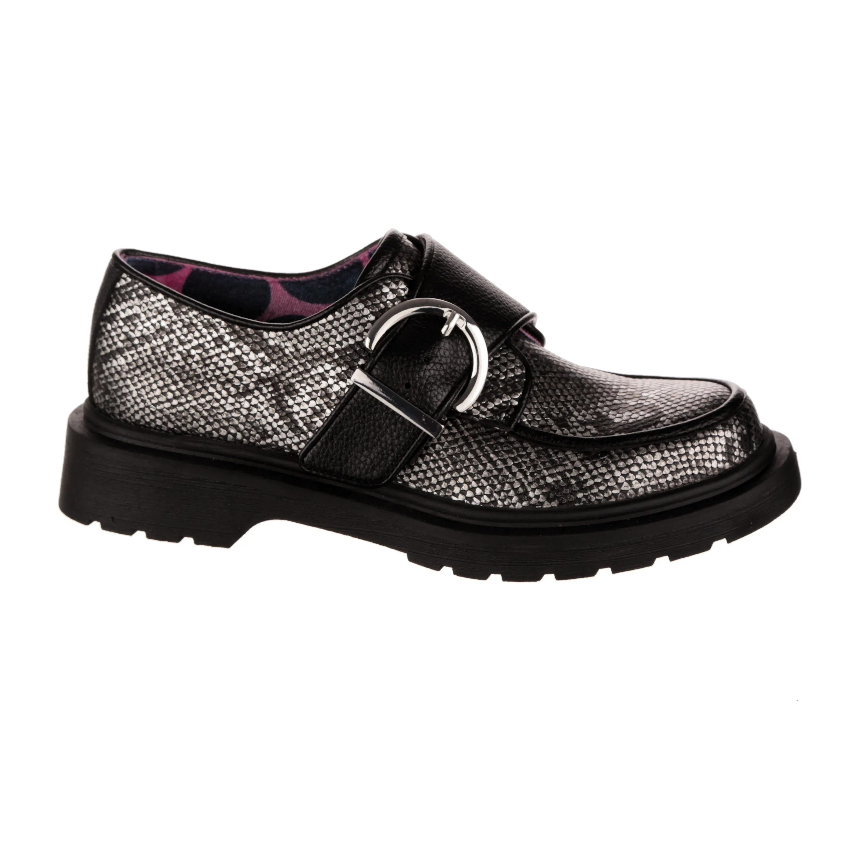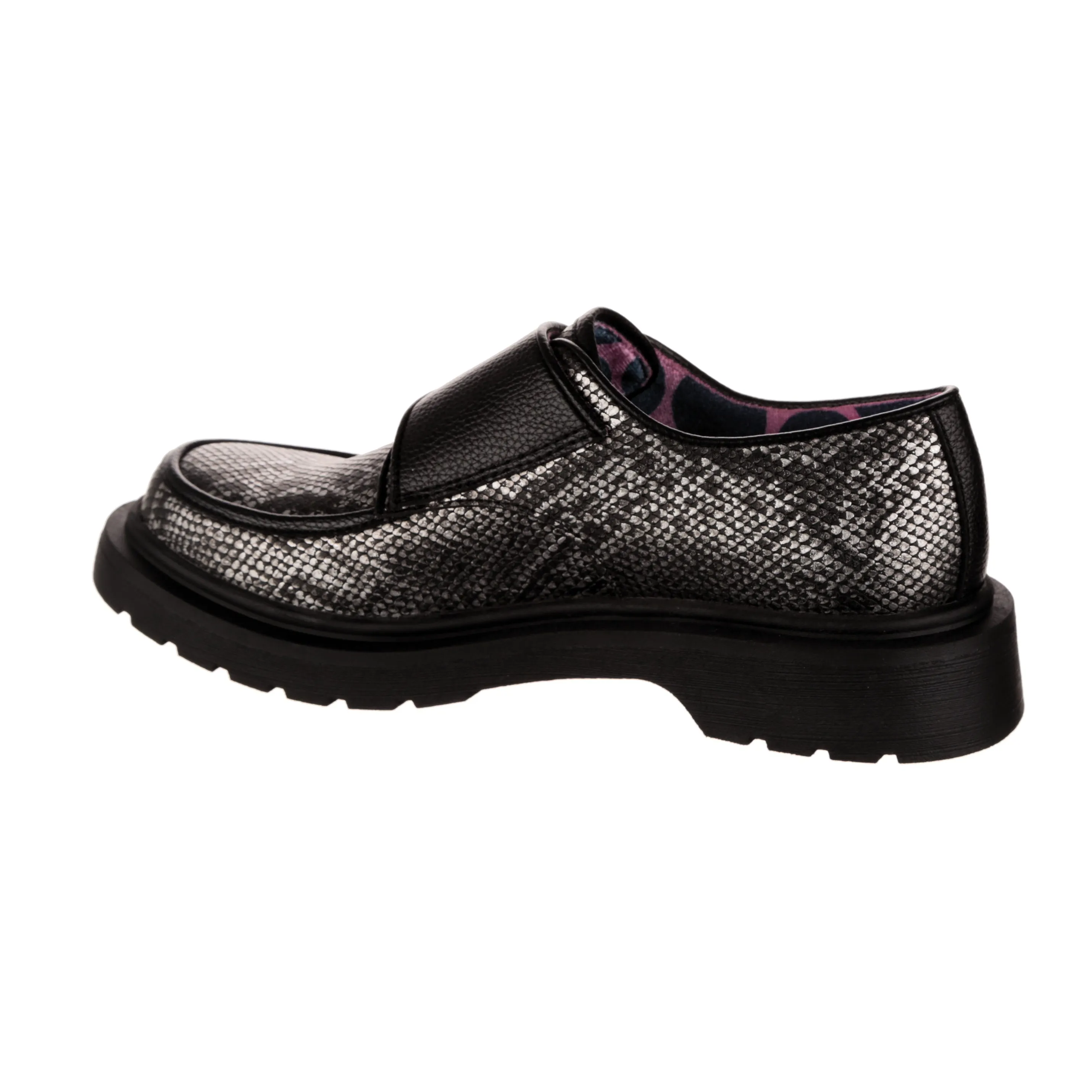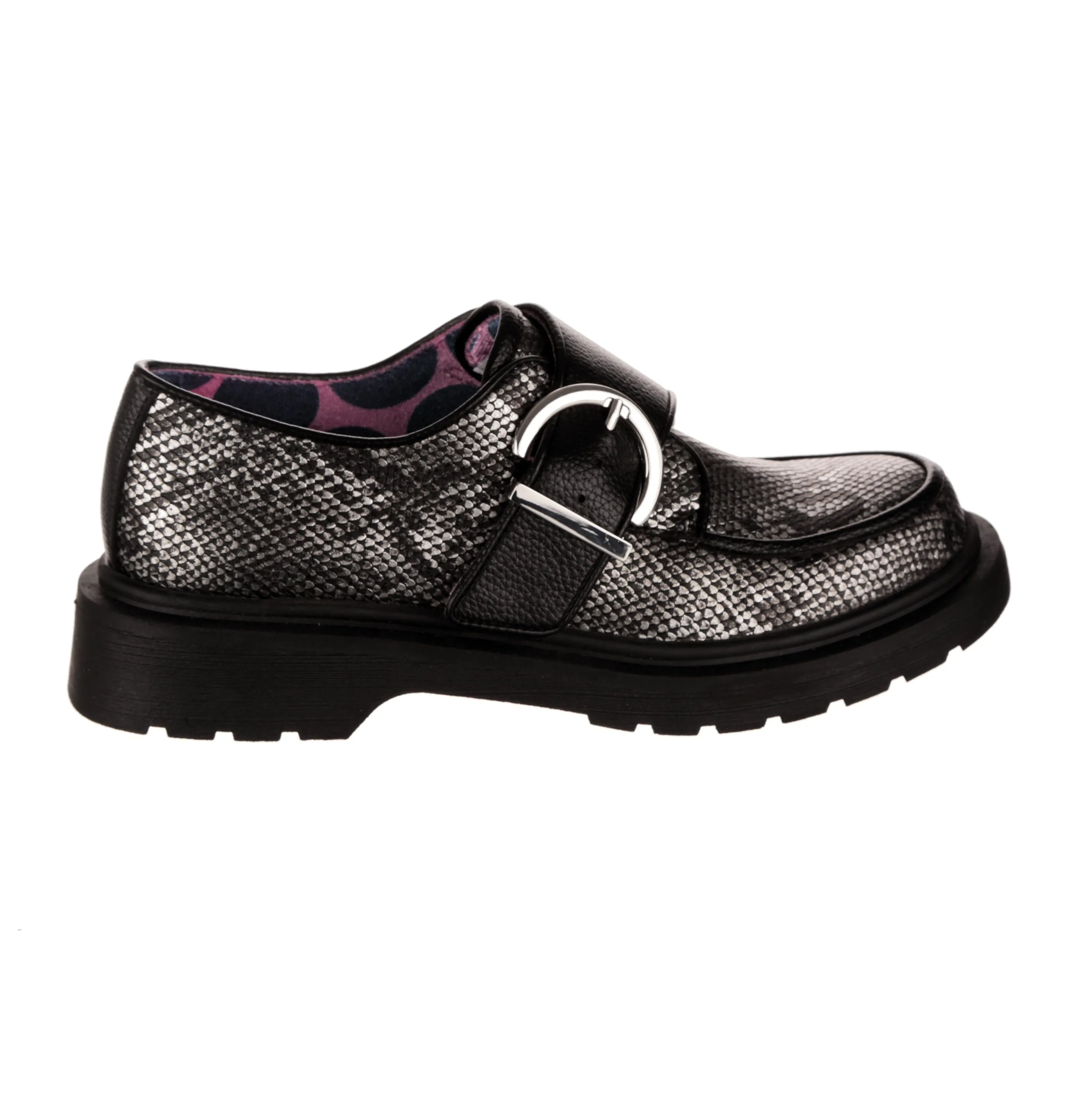 Cool and casual, these vintage-style brogues feature iridescent silver and black snakeskin accented by a reflective, rainbow quality that you'll want to wear day and night. The single black monk strap has an adjustable oversized buckle for that statement feel, the perfect finishing touch to your look!