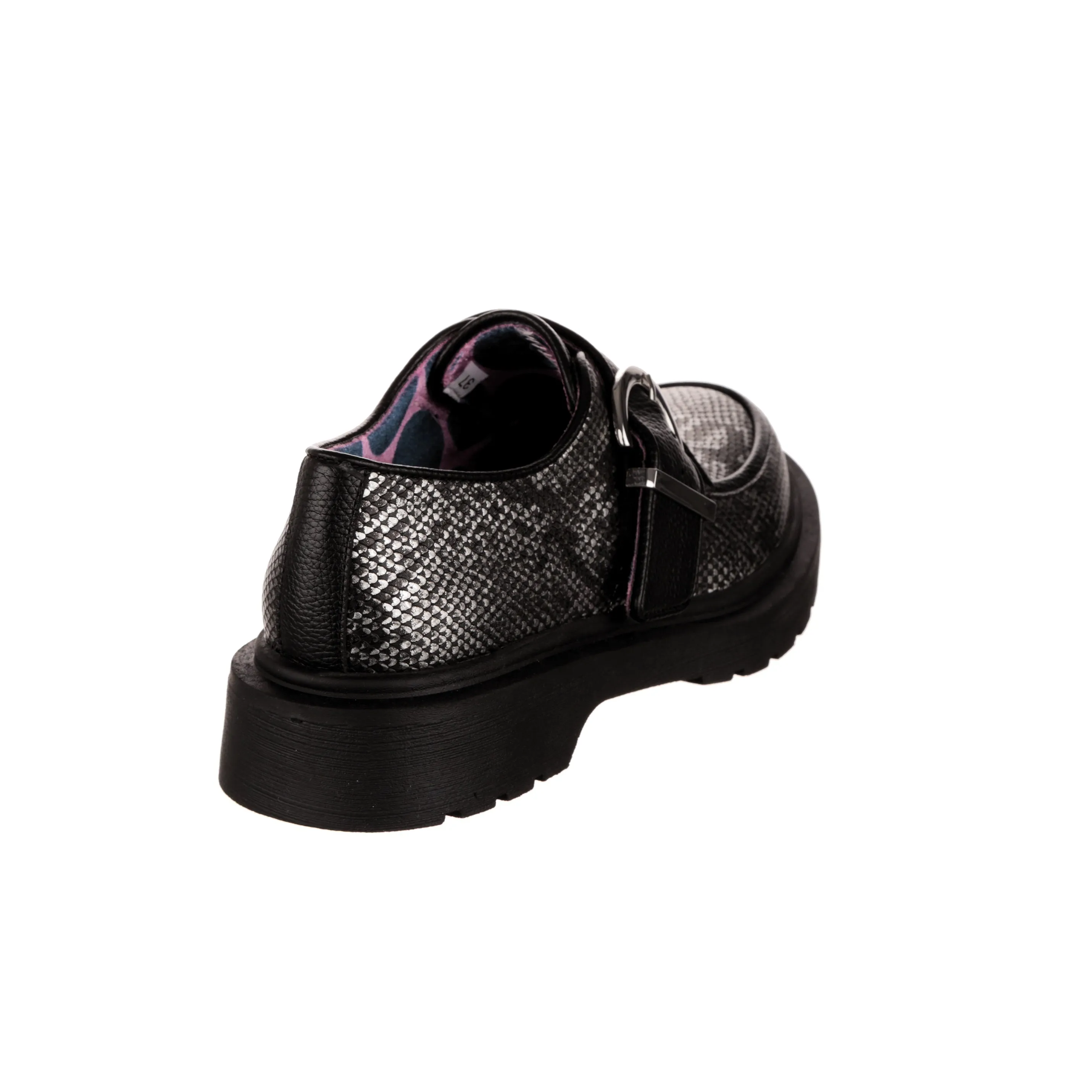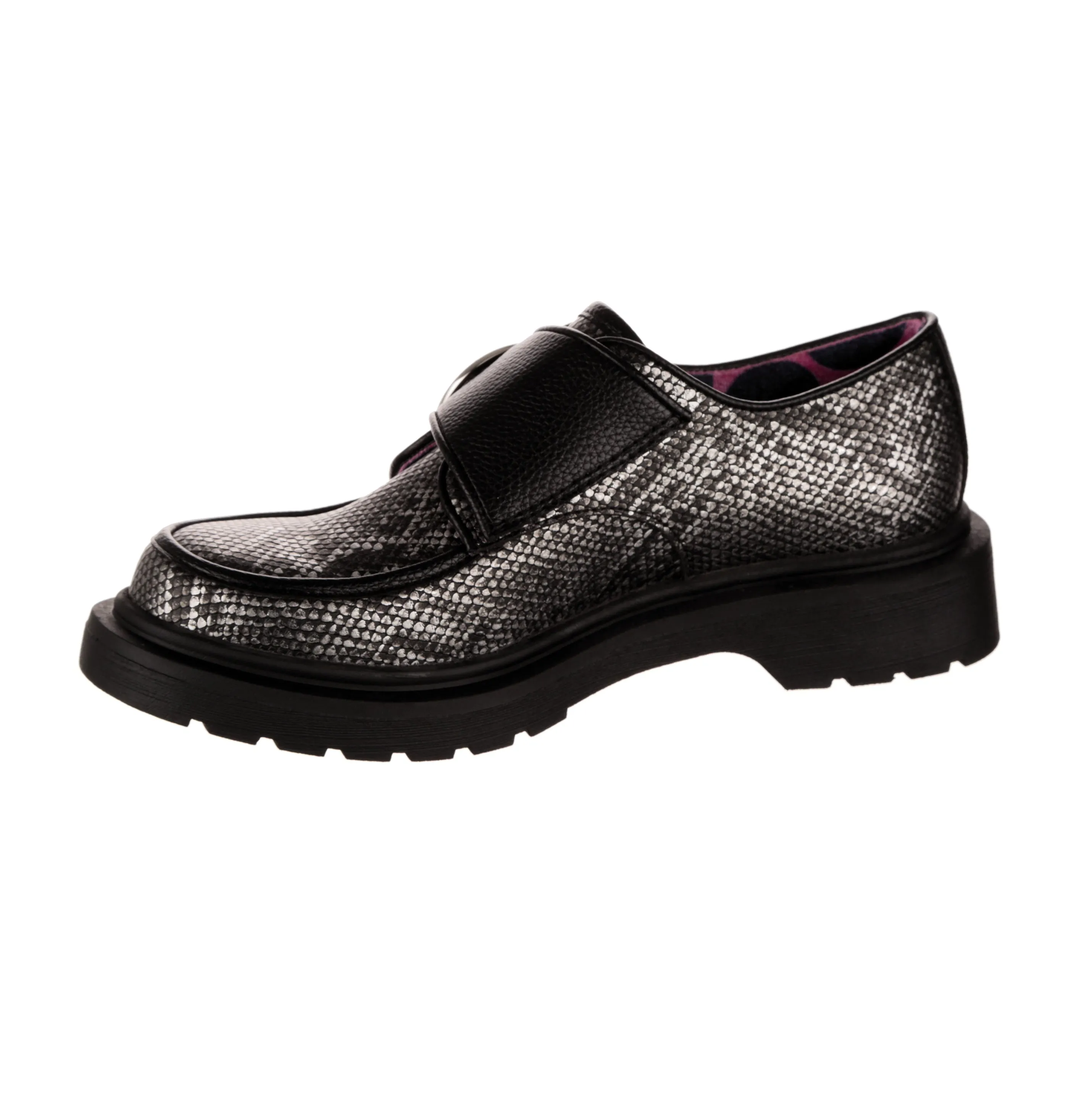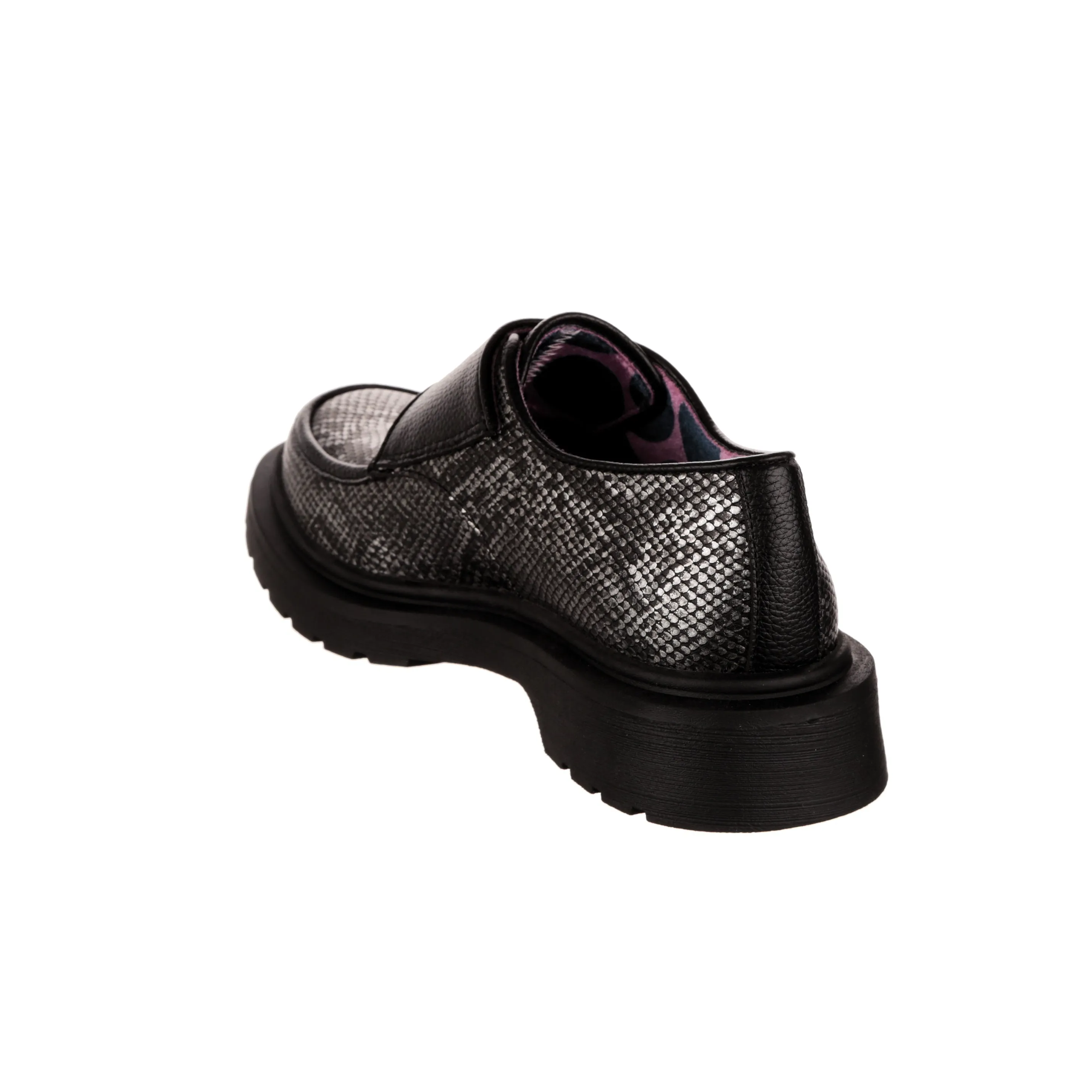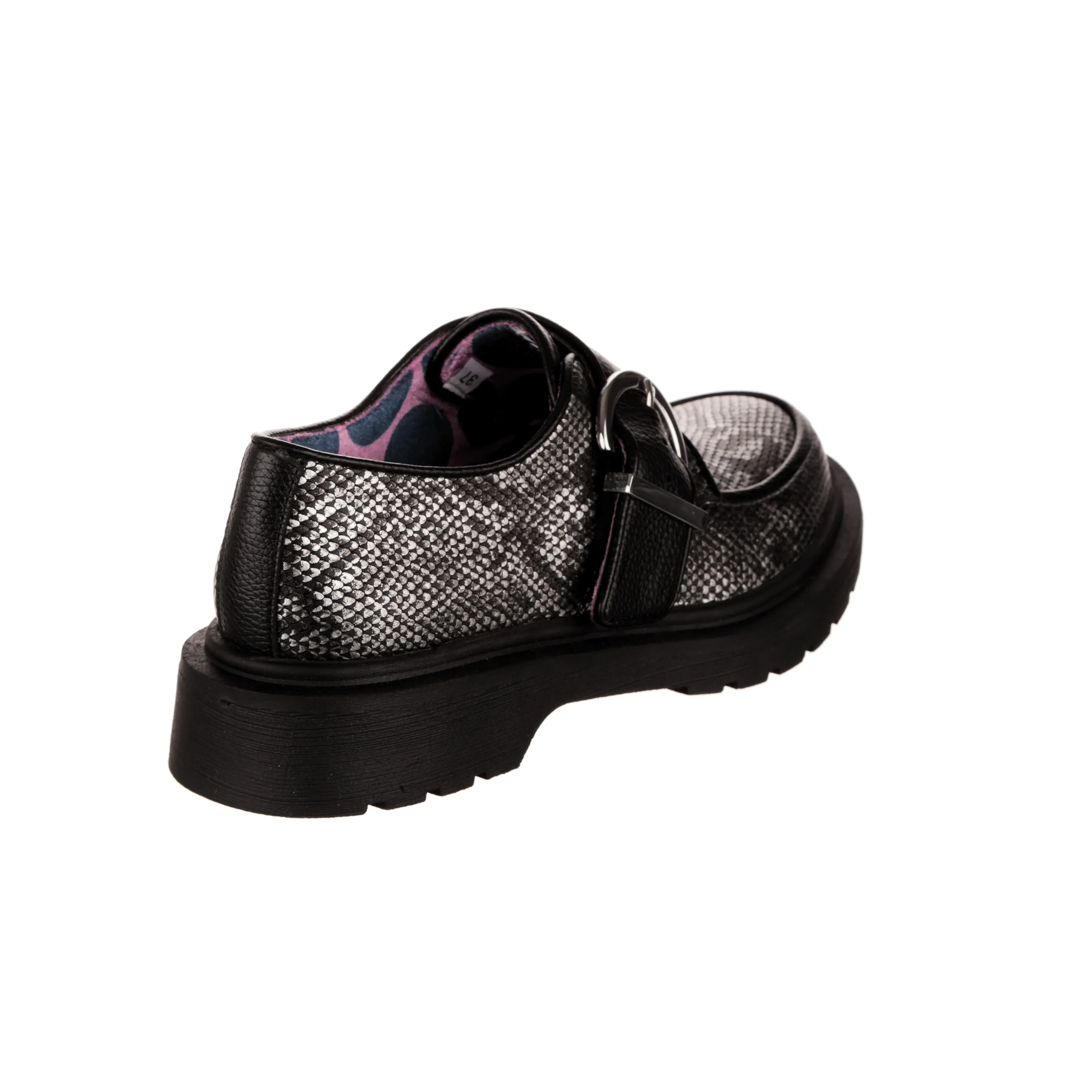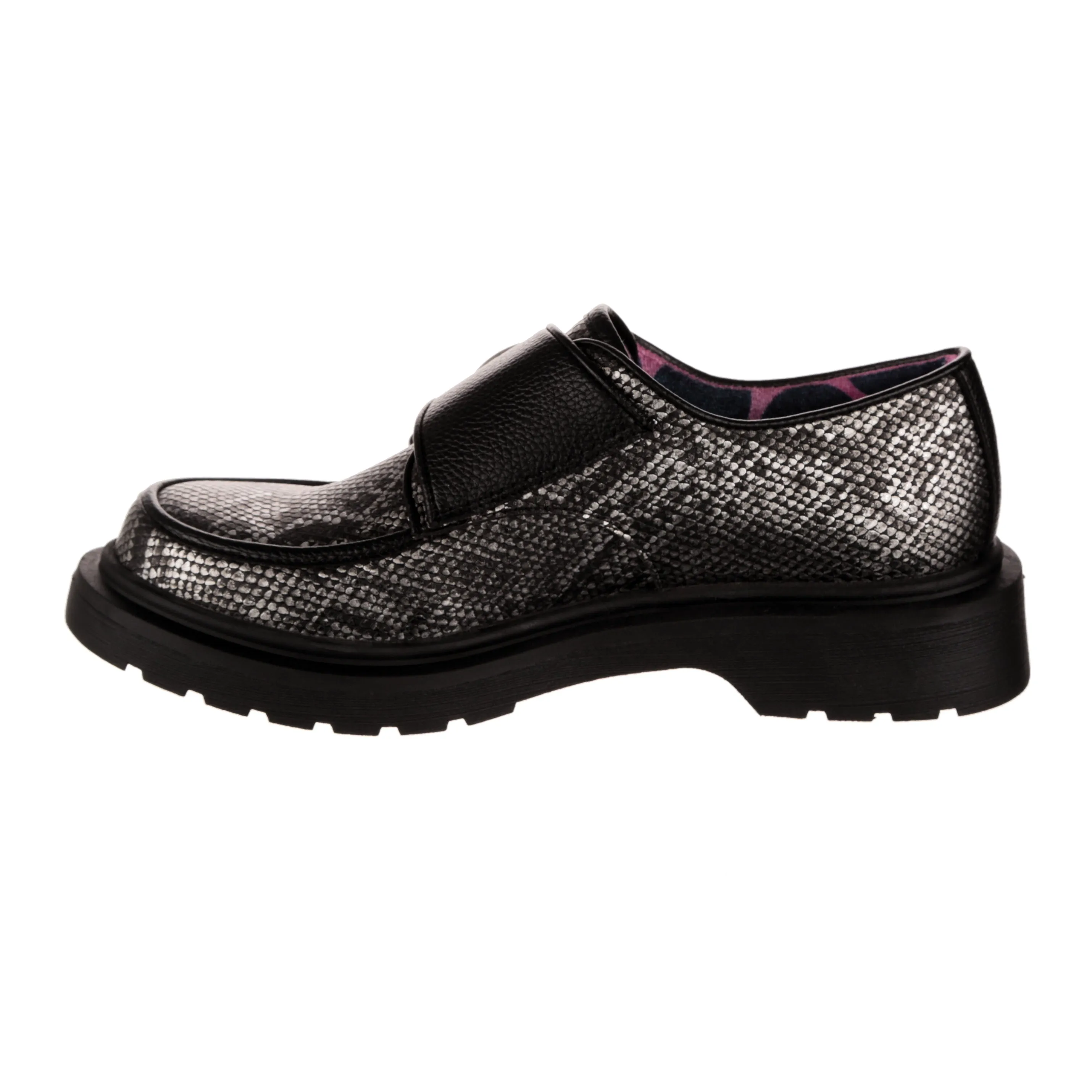 Cool and casual, these vintage-style brogues feature iridescent silver and black snakeskin accented by a reflective, rainbow quality that you'll want to wear day and night. The single black monk strap has an adjustable oversized buckle for that statement feel, the perfect finishing touch to your look!