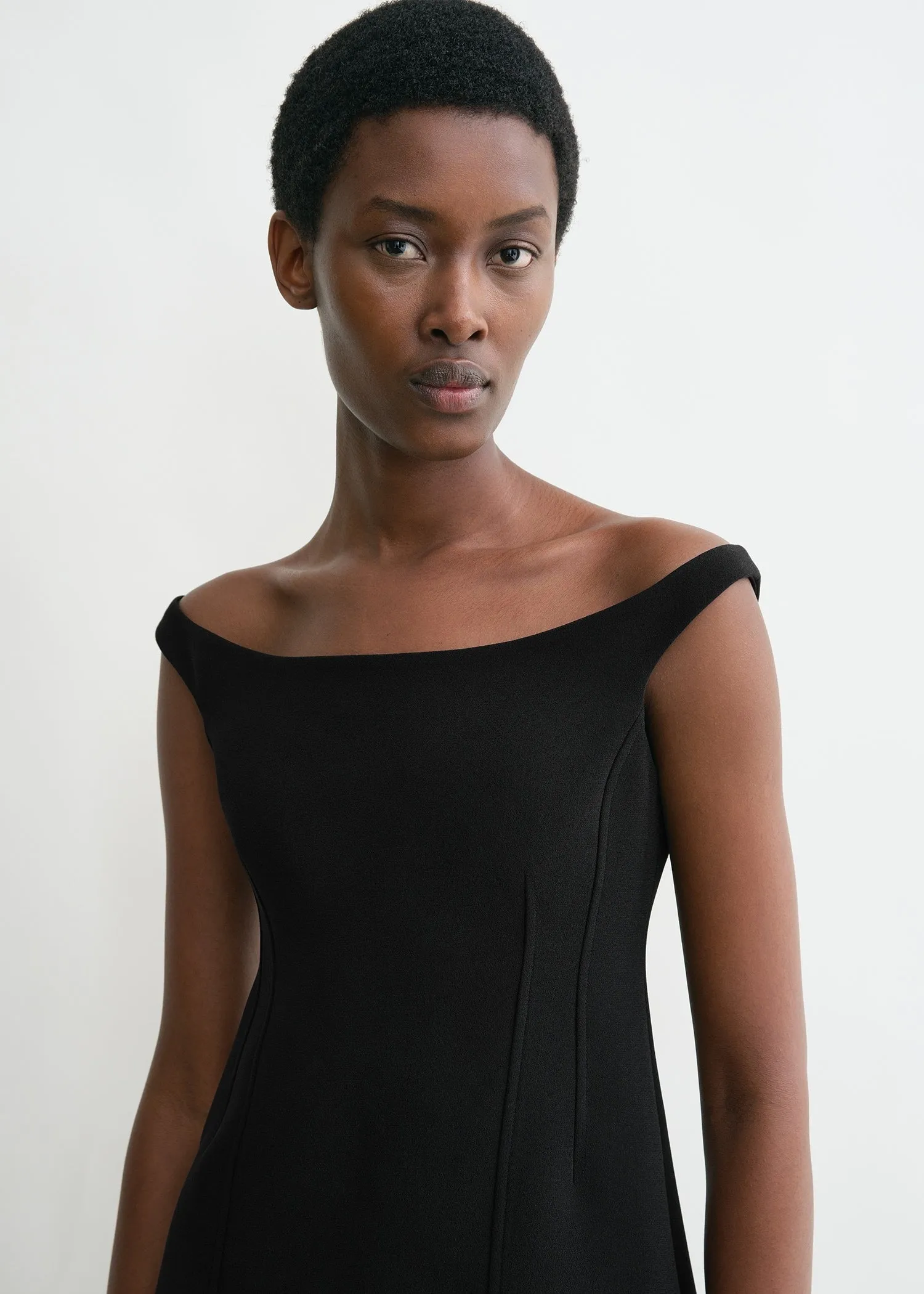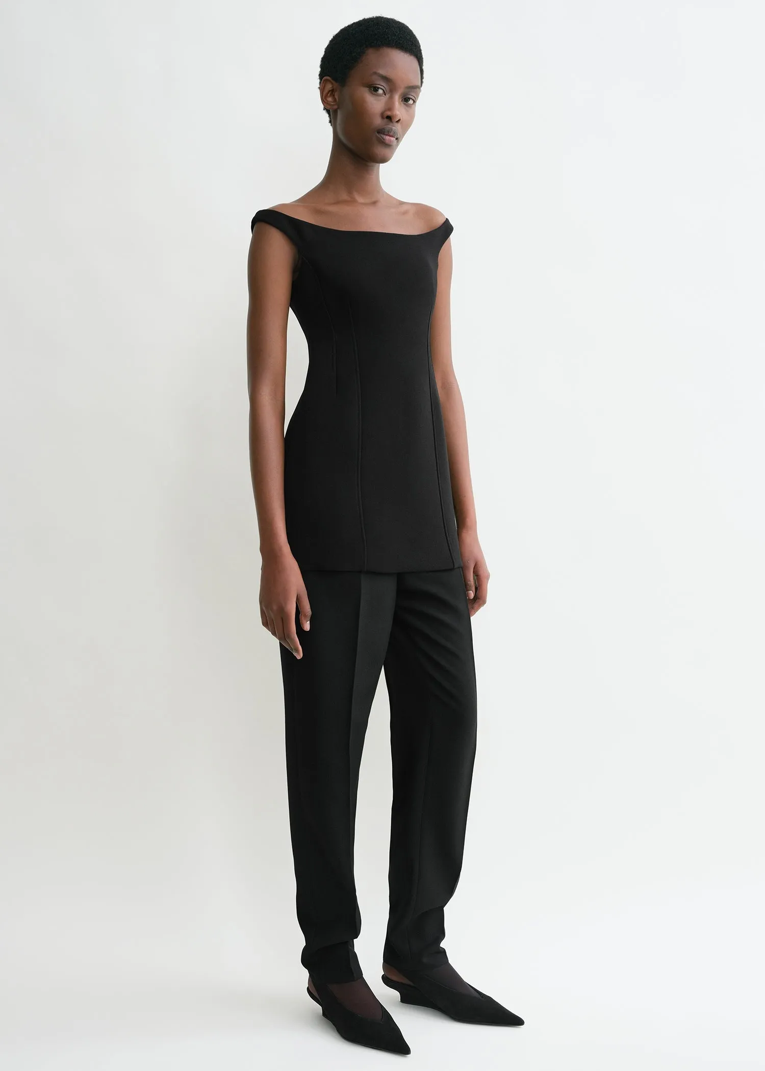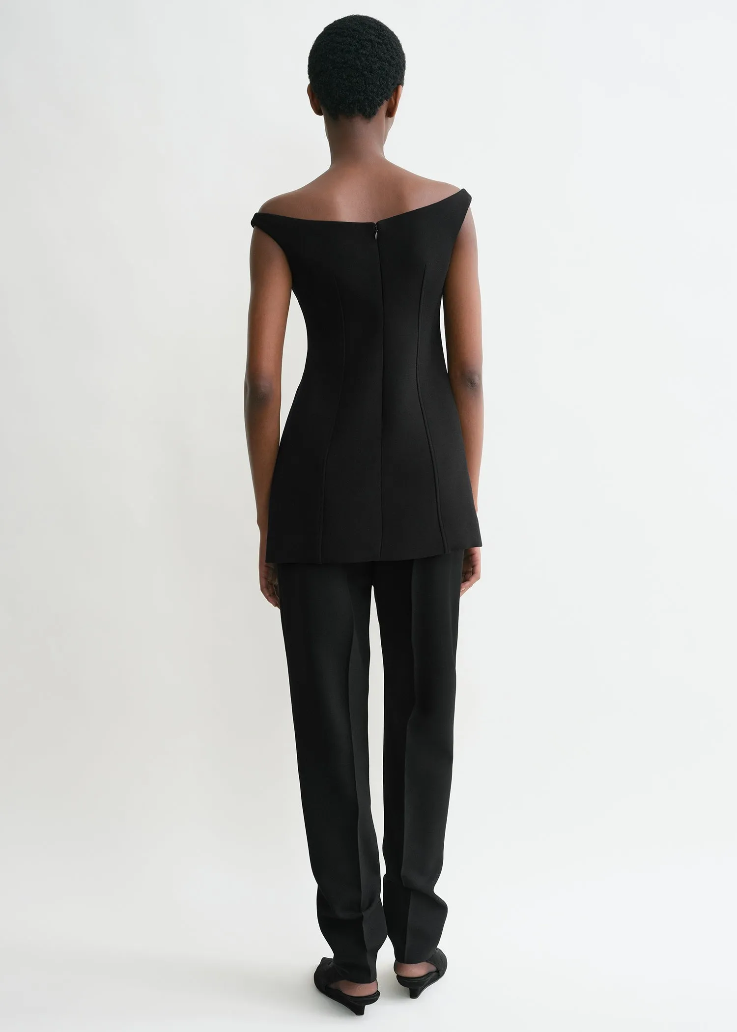 TOTEME top with a curved off-the-shoulder neckline that is reminiscent of vintage couture. It features double darts creating a flattering hourglass silhouette that is fully lined and fastens with a concealed back zipper. Note how the straps hug the shoulders gently.