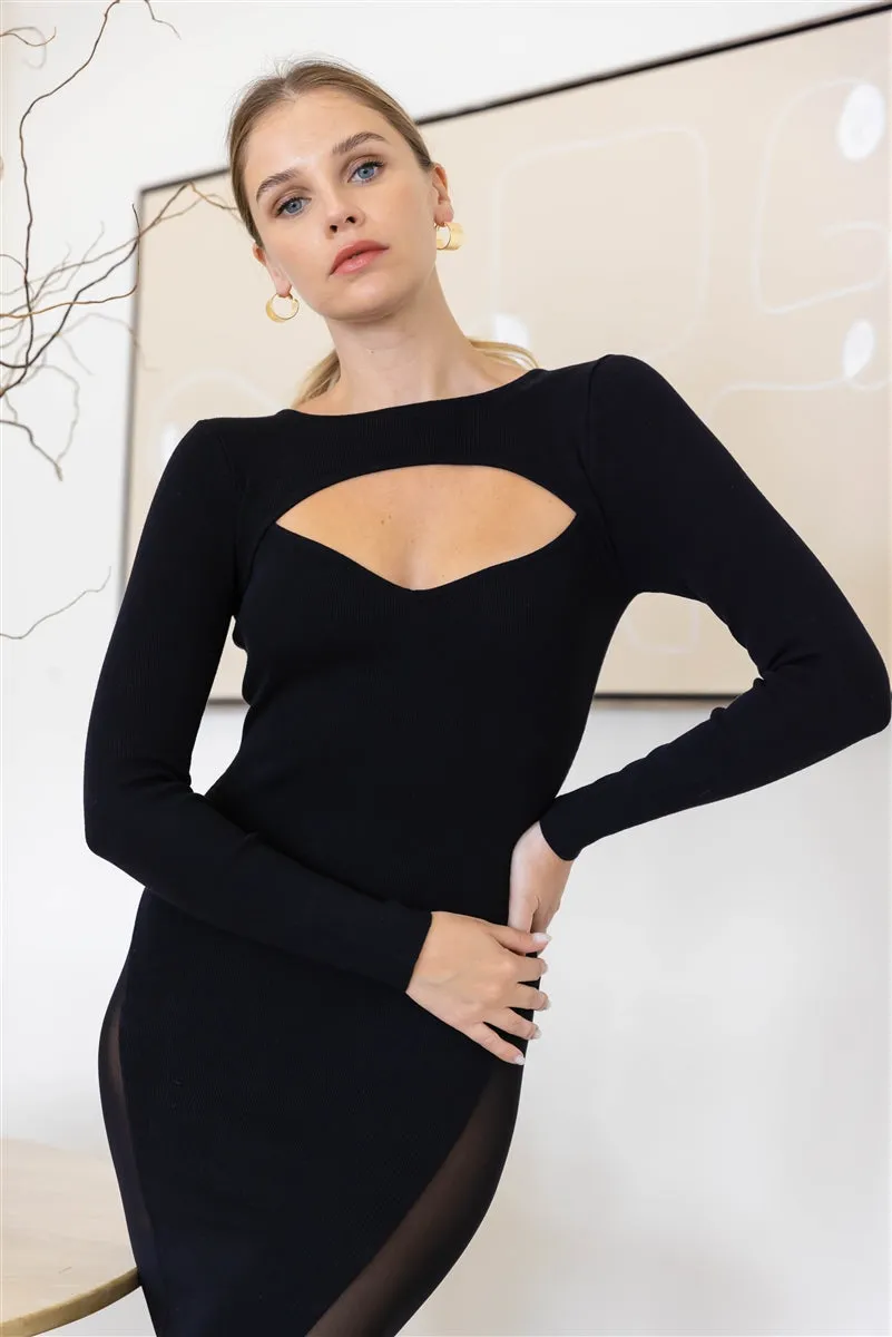 knit material, solid color, mesh side details & cutout bust detail, long sleeves, round neckline, maxi length, slim fit, unlined, stretchy, partially-sheer, stylish, trendy, night-out, sexy, hot, must-have, trendy