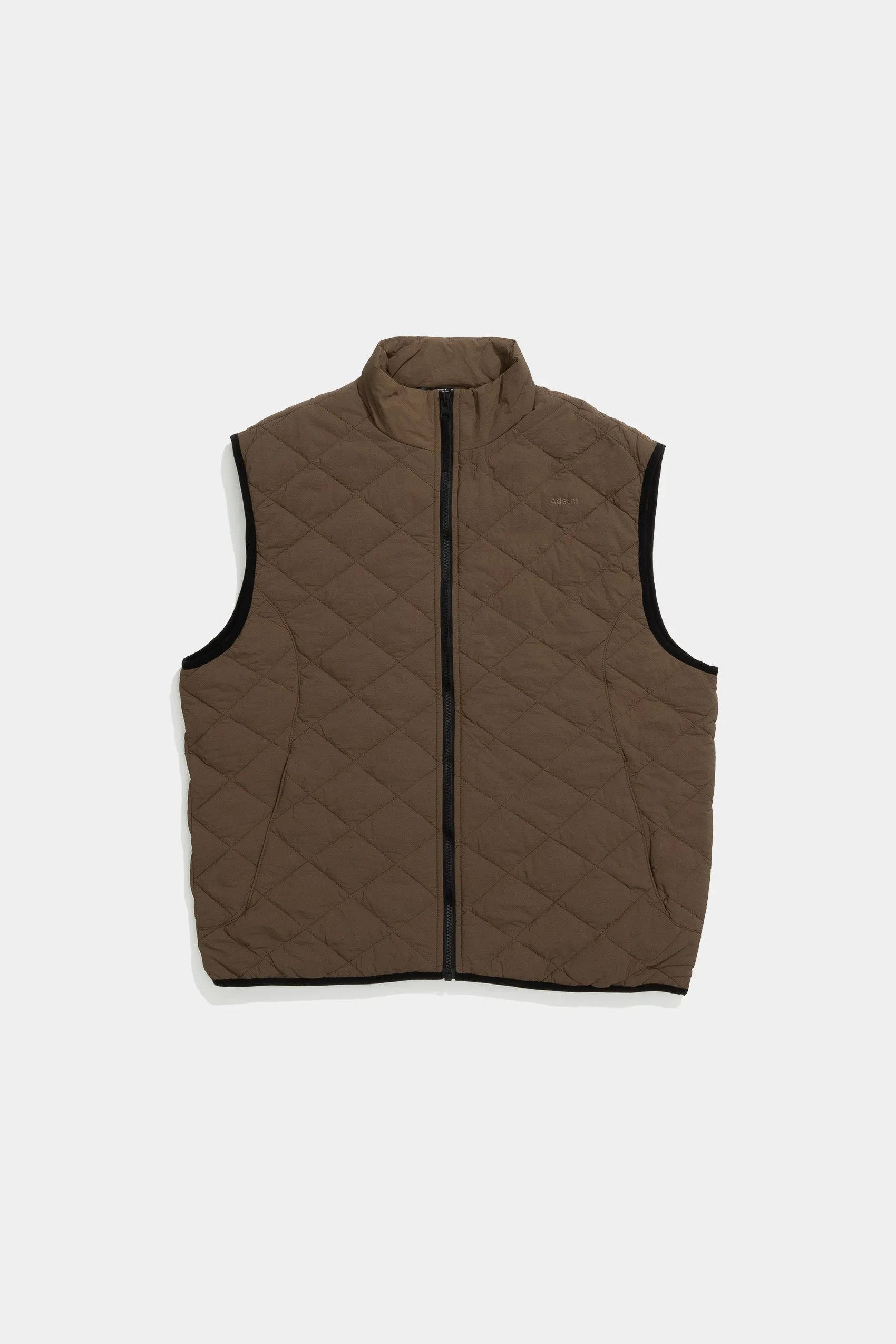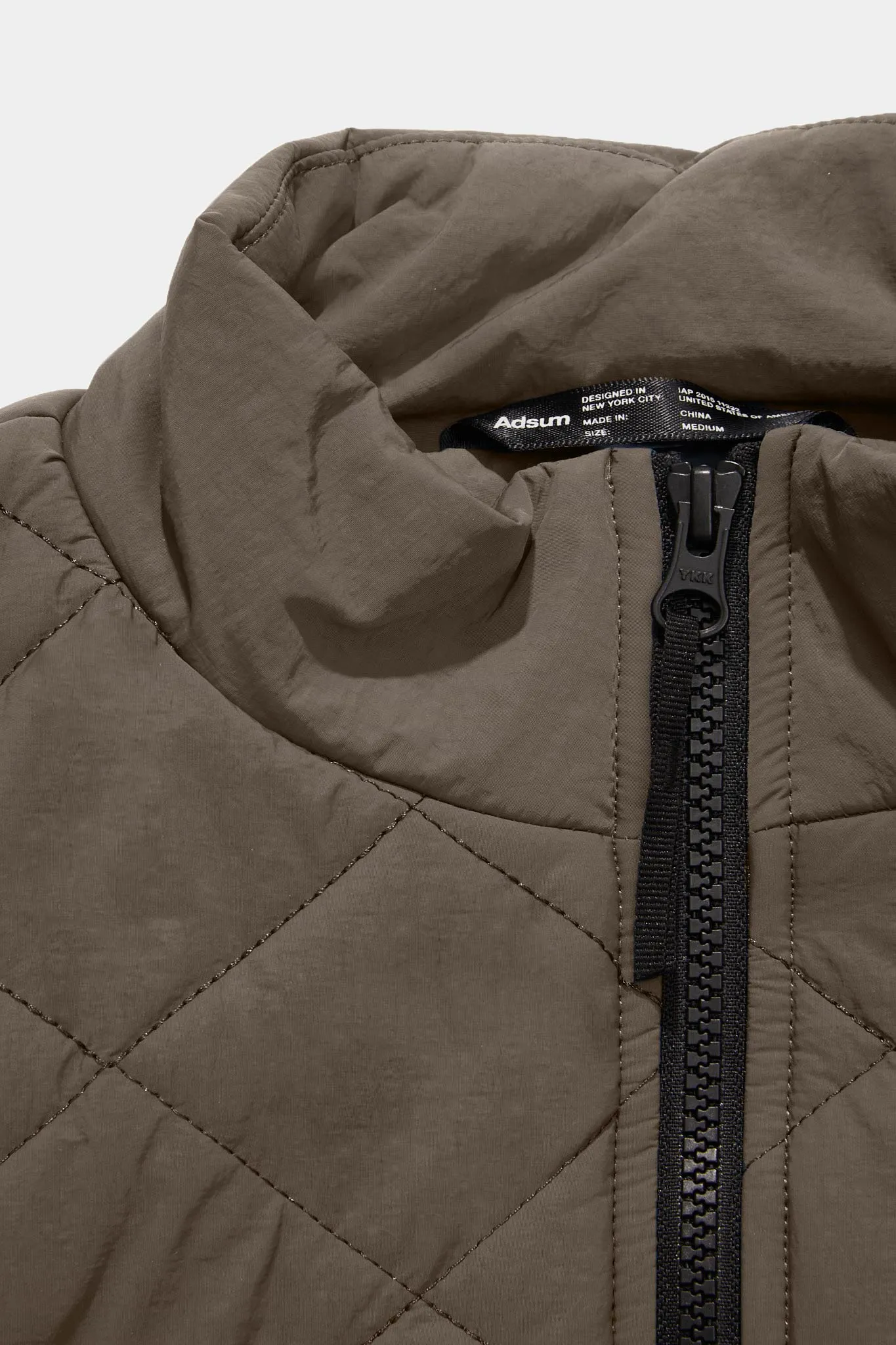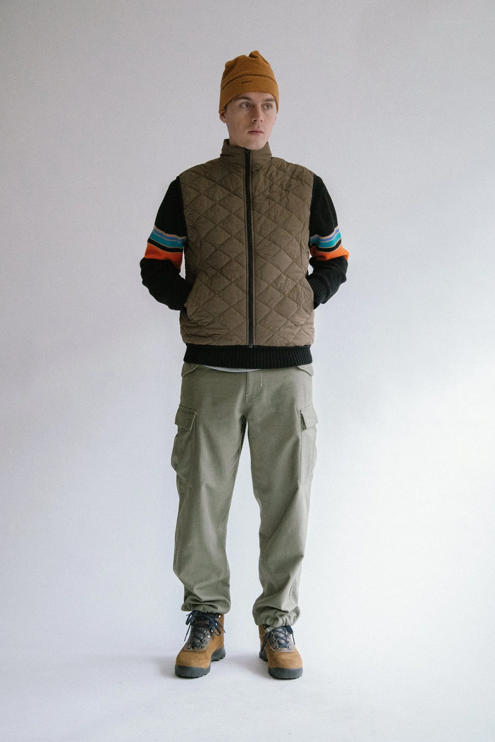 Taking subtle design cues from OG workwear found on construction sites, the Diamond Vest has zippered hand pockets that hide under curved side panel detailing. The rear section of the jacket features a utility stow pocket for small accessories. Armhole and waist openings are cleanly finished with stretch binding for a snug draft free fit. Drizzle proof exterior is machine quilted to a 80 gram insulation and can handle the raw fall weather of the Northeast.