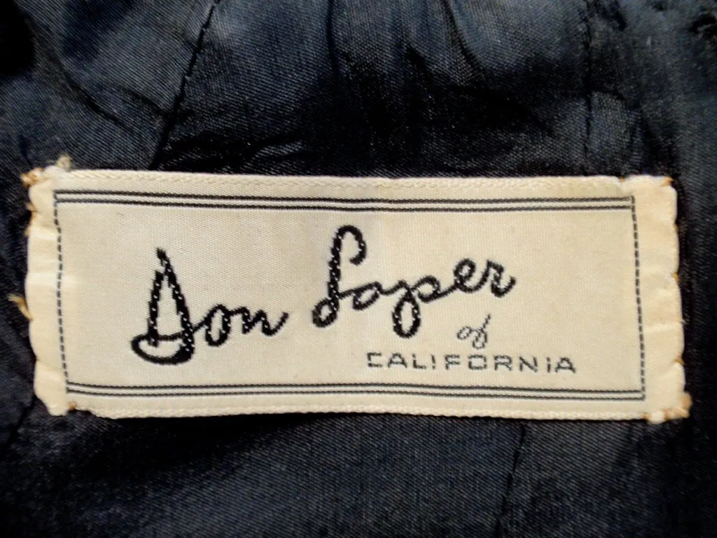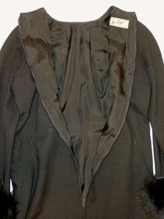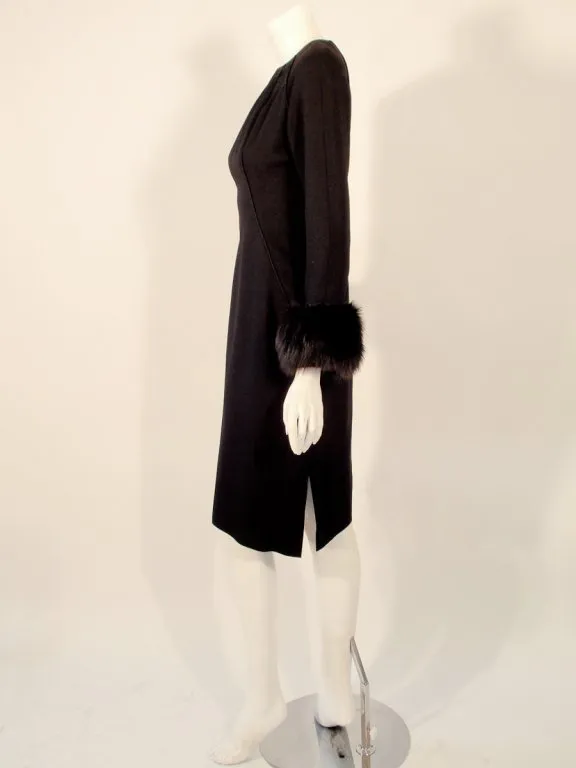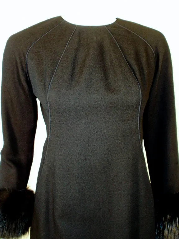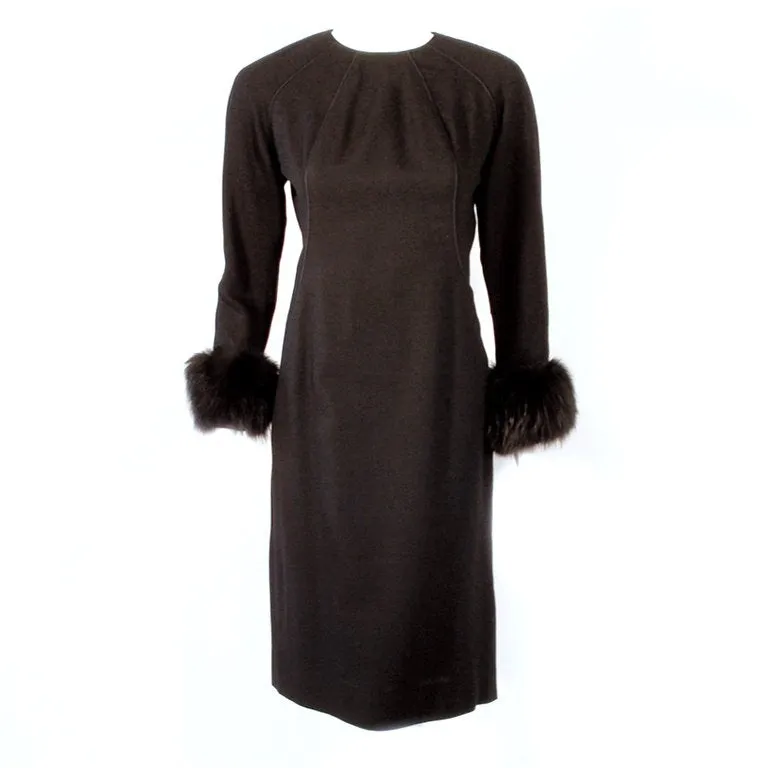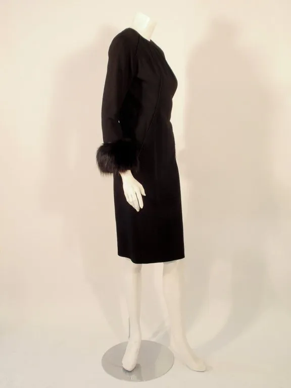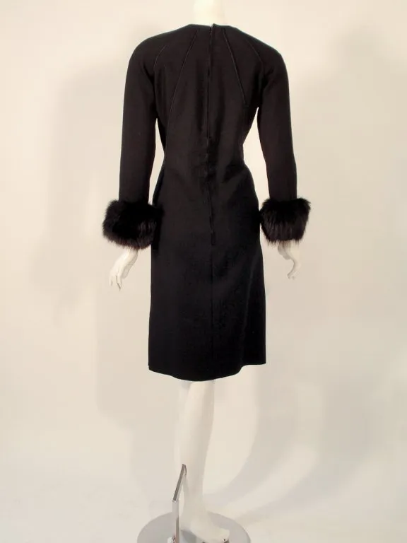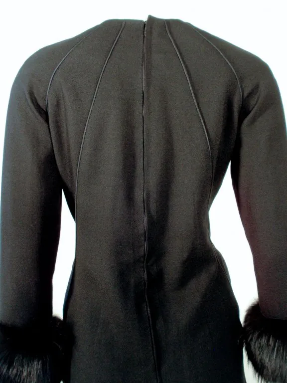 This is a very charming 1960's vintage cocktail dress from Don Loper. It is a sheath silhouette with long sleeves and real fur at the cuffs. There is piping on the princess seams. This dress is fully lined and there is a side slit on the left side of the skirt.