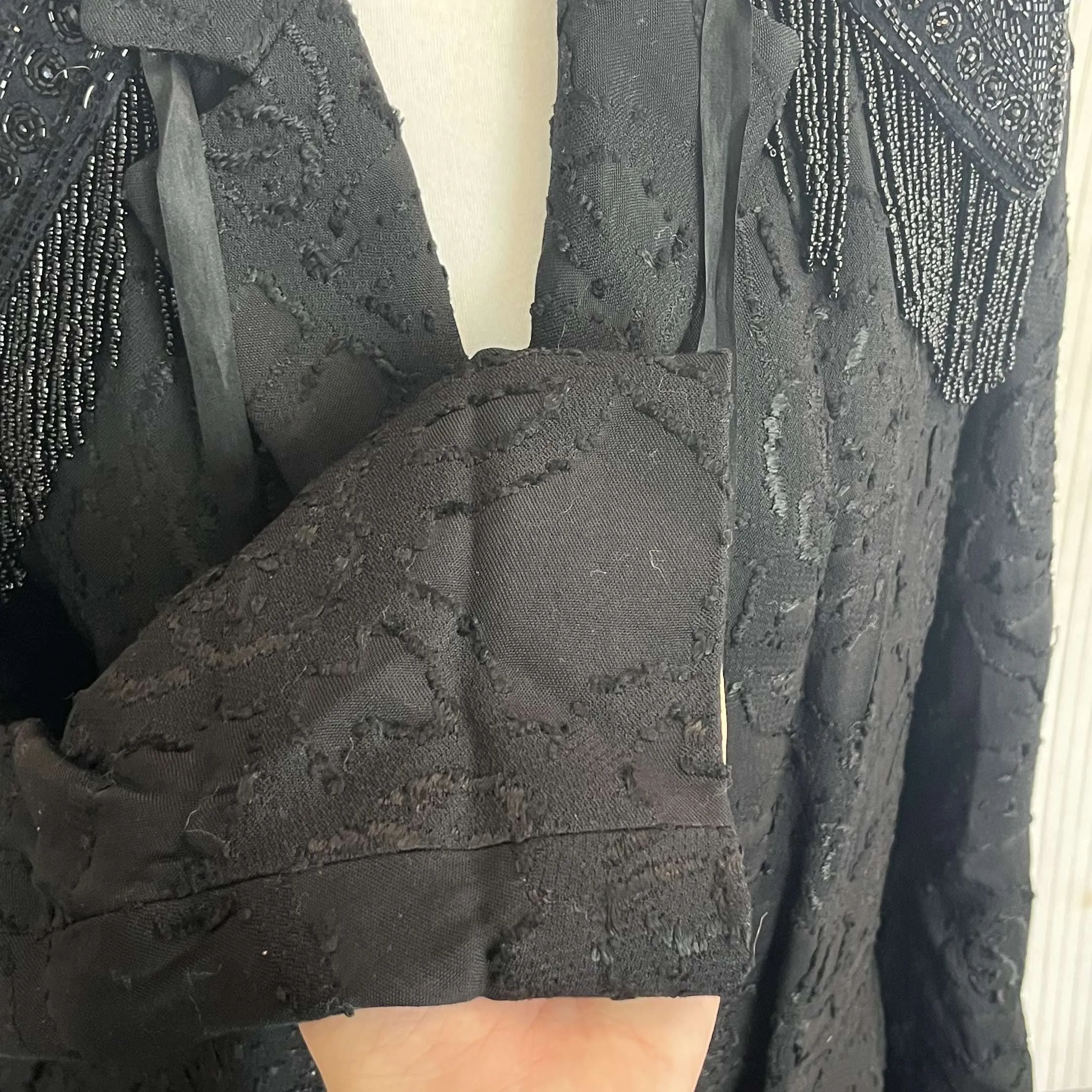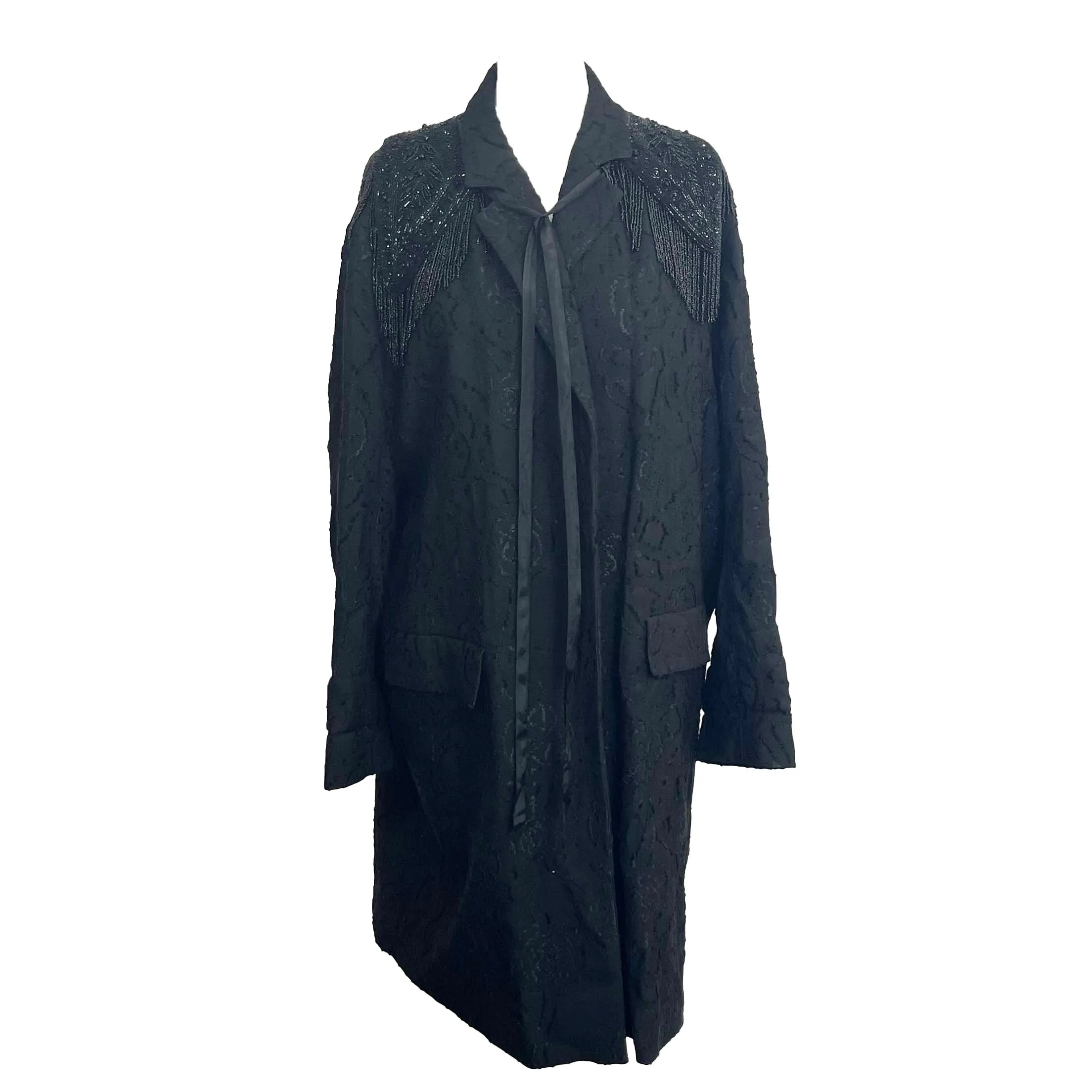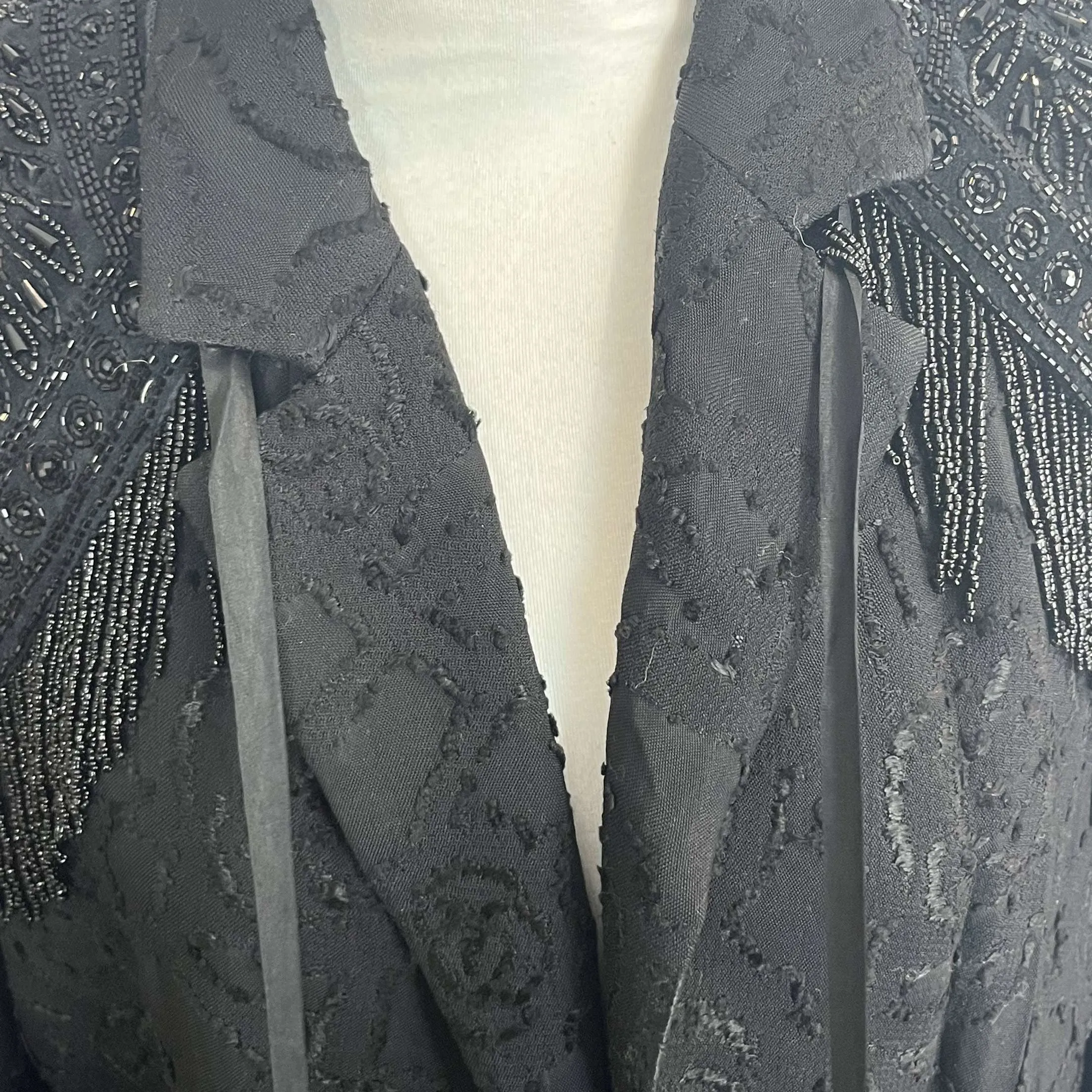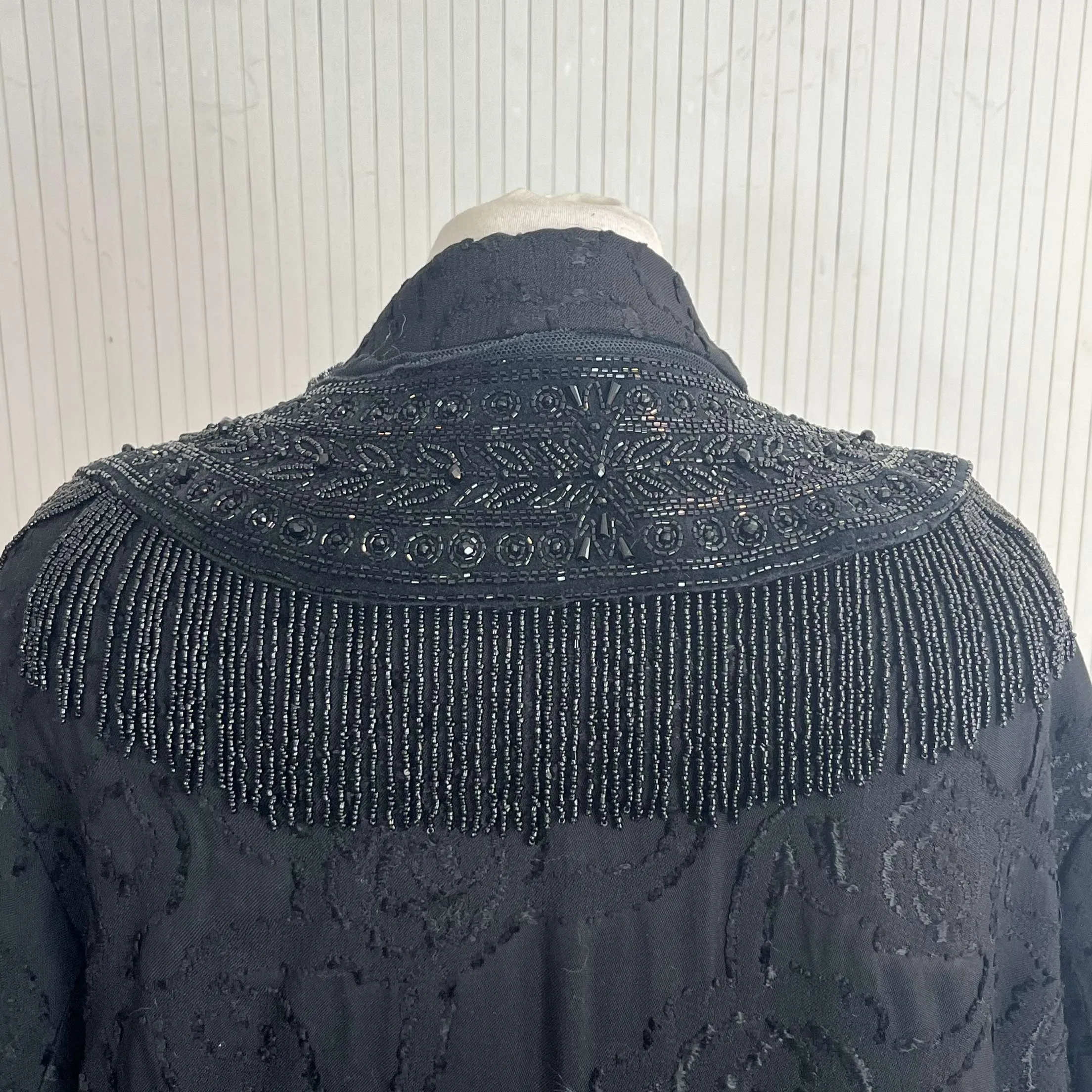 The fabulous intricate beadwork on this coat is something to behold. With a hassle effect and subtle floral embroidered design, this is a fabulous way to dress up any outfit.