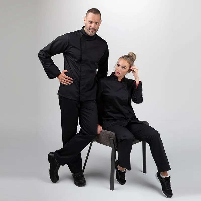 Also available in a short-sleeved version for summer, Manelli's black chef coat is also offered in long sleeves. Made from lightweight and easy-to-care-for material, it's perfect for daily use in the kitchen. Its collar and pen pocket add a touch of elegance and practicality to this classic black blouse.