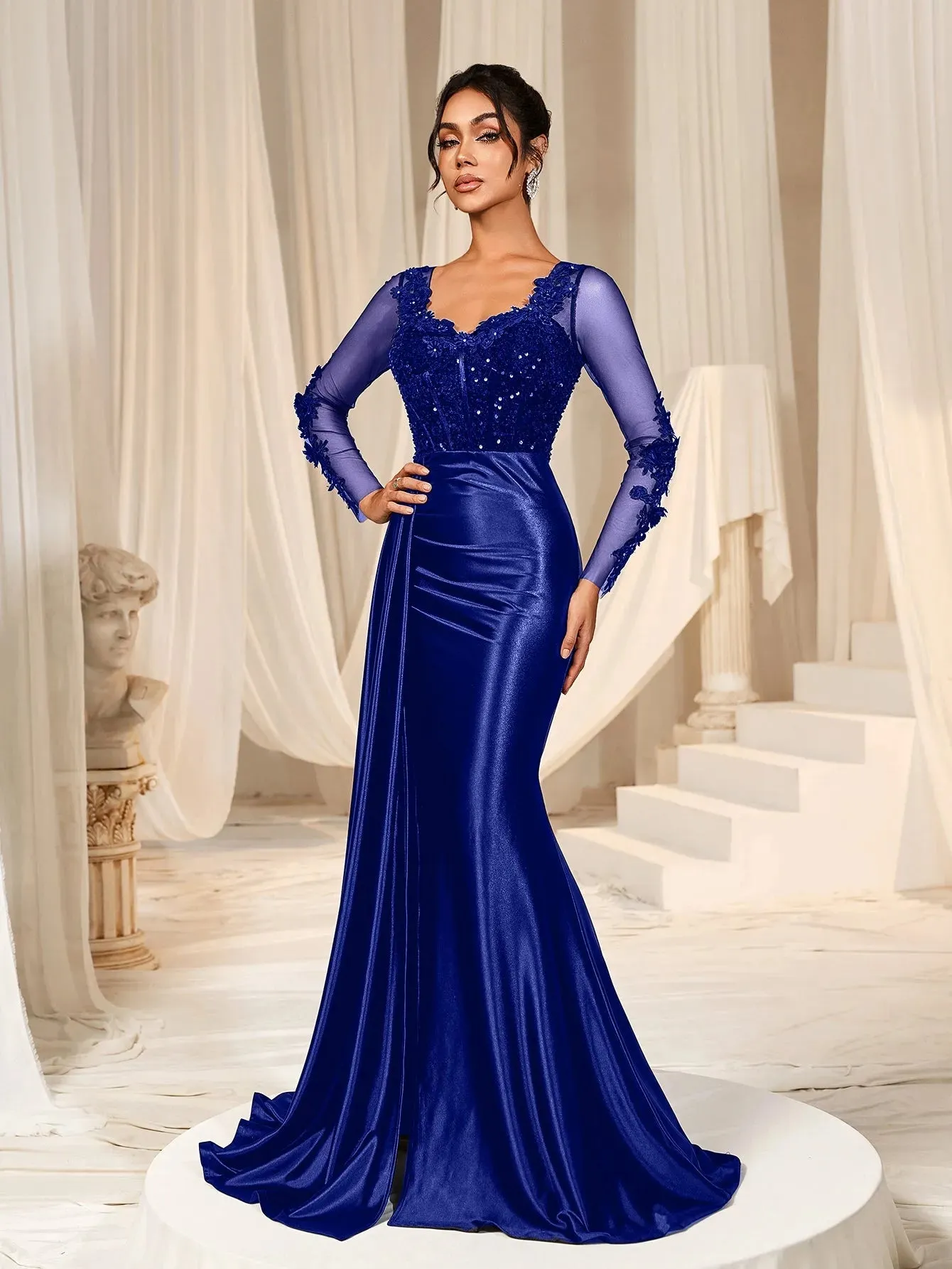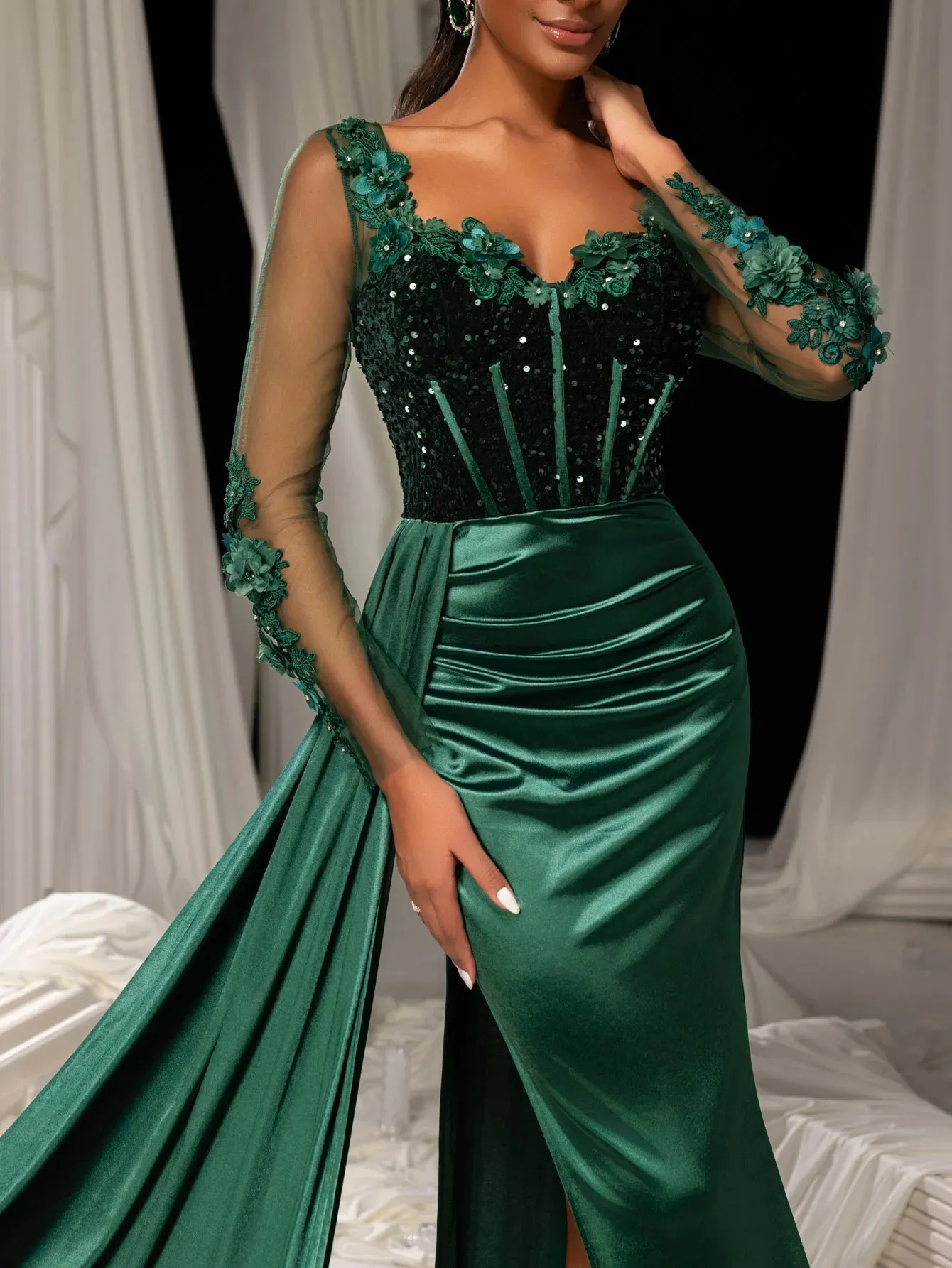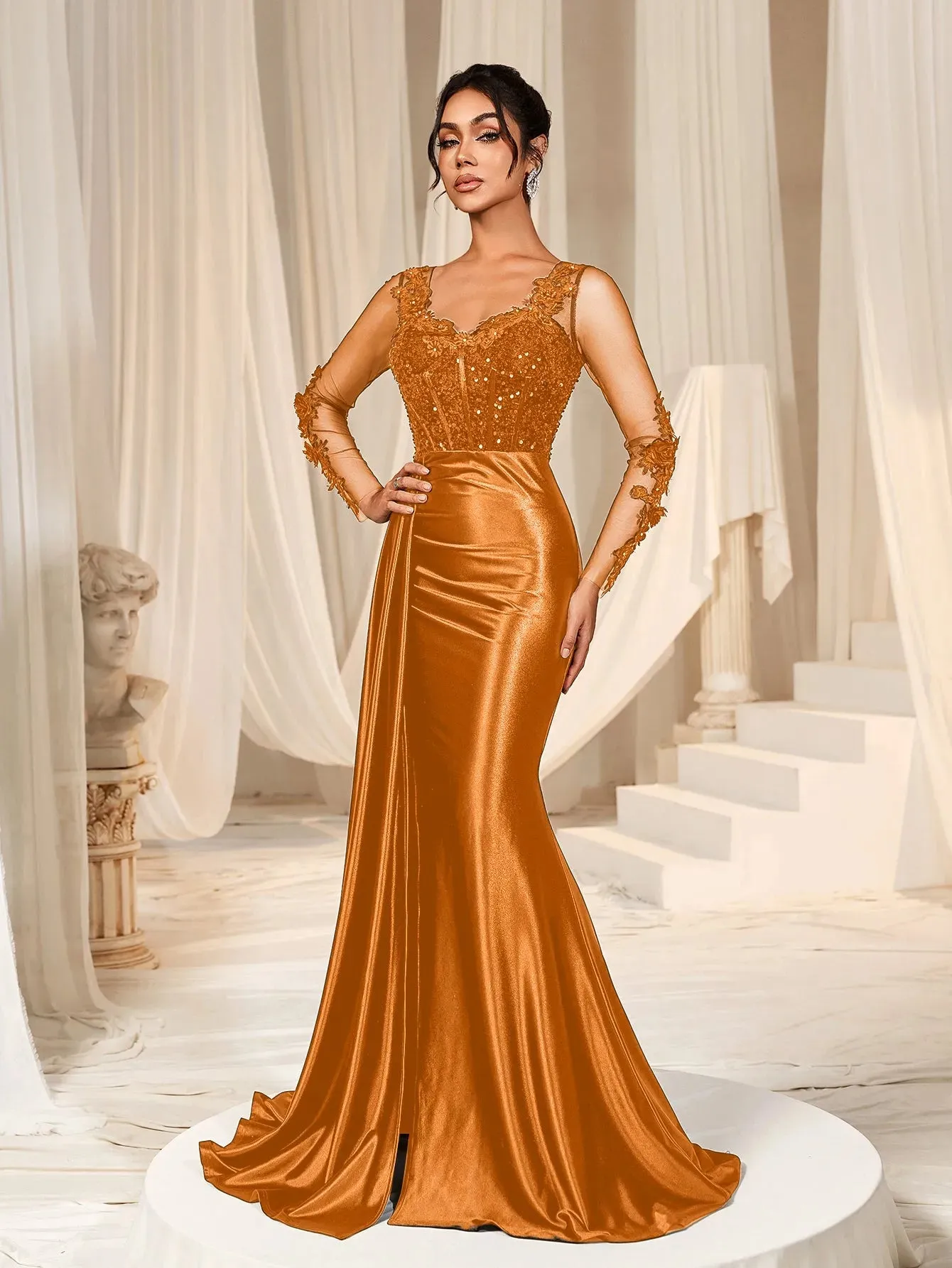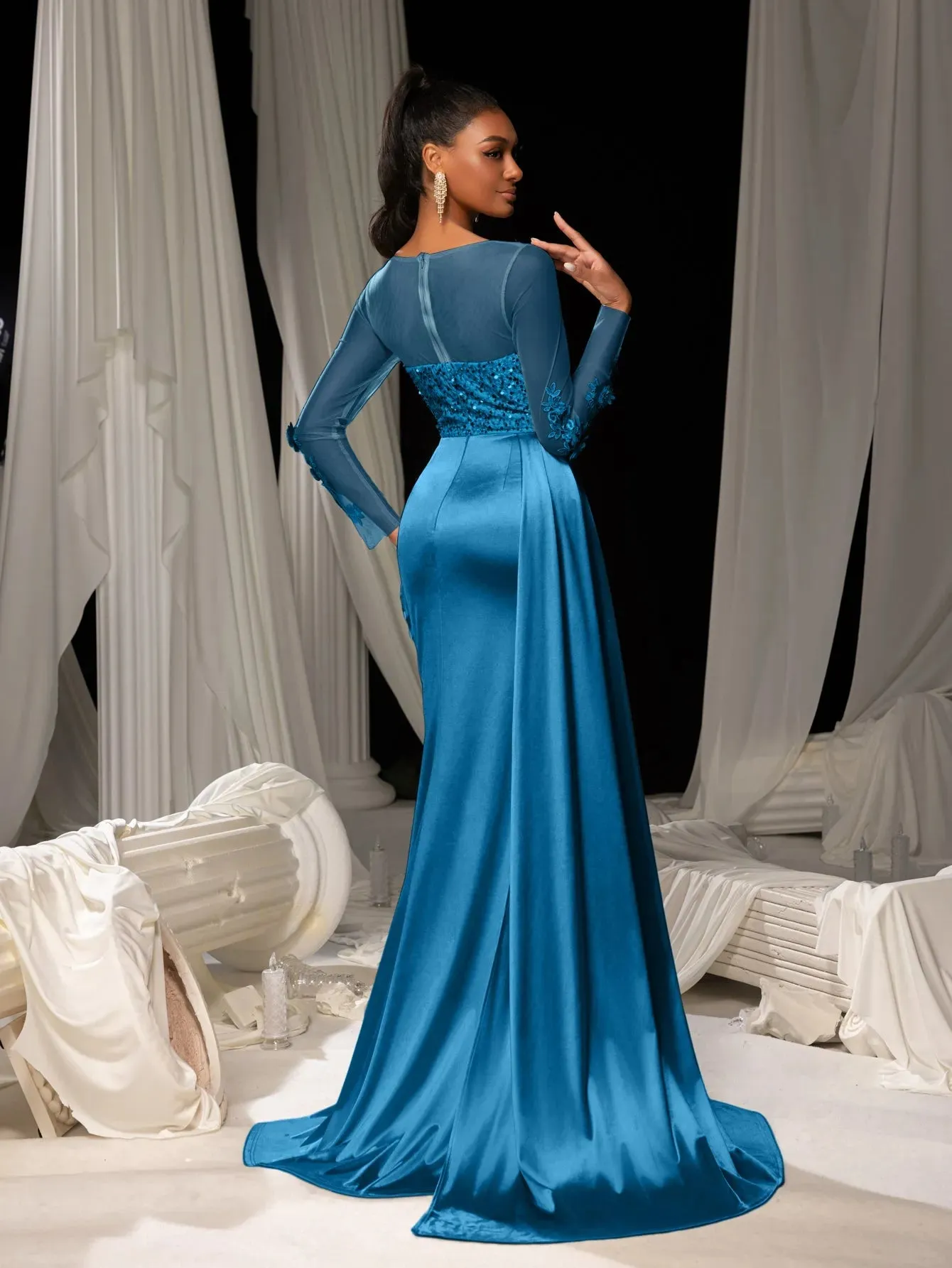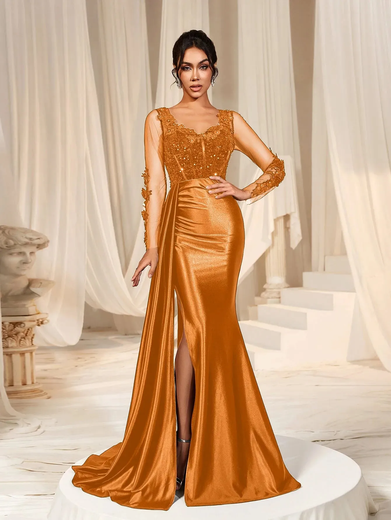 Make a grand entrance in our show-stopping satin mermaid gown, designed to exude sophistication and allure. This gown features a figure-hugging silhouette with a daring thigh-high slit and a luxurious satin finish that flows into an elegant train. The bodice is adorned with delicate lace appliqués and shimmering sequins, complemented by sheer long sleeves for a romantic touch. The back showcases a sophisticated sheer panel that adds a modern edge to this timeless design.