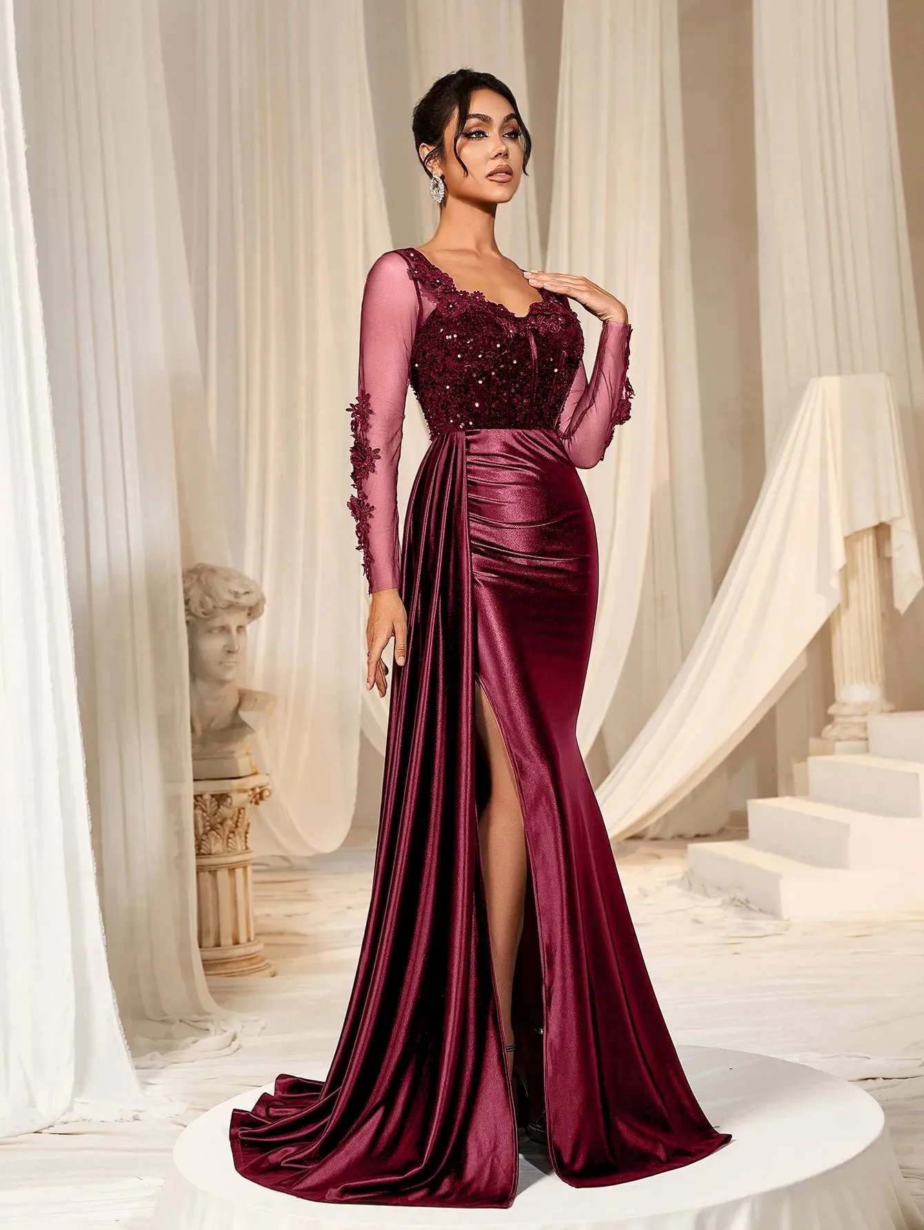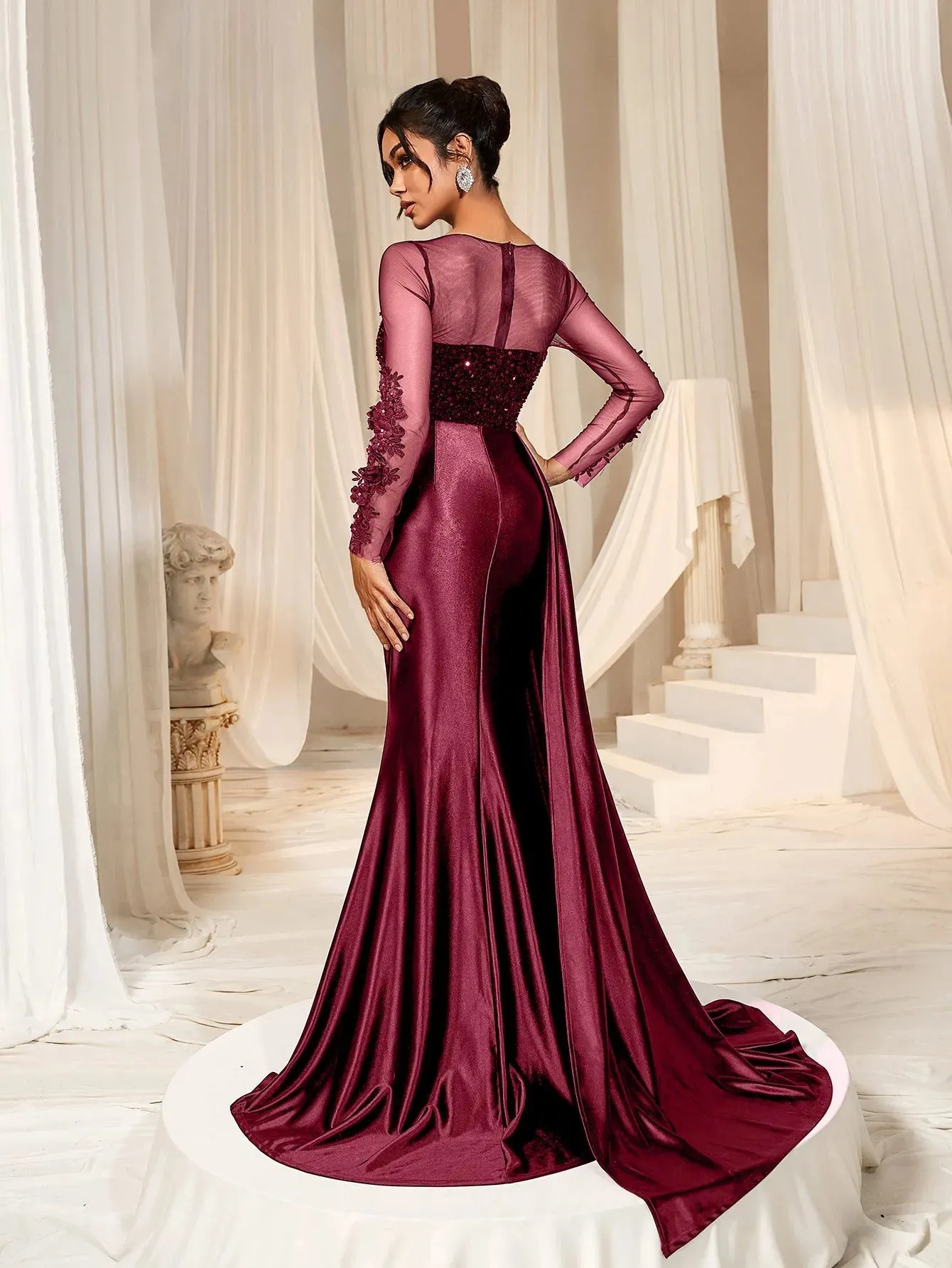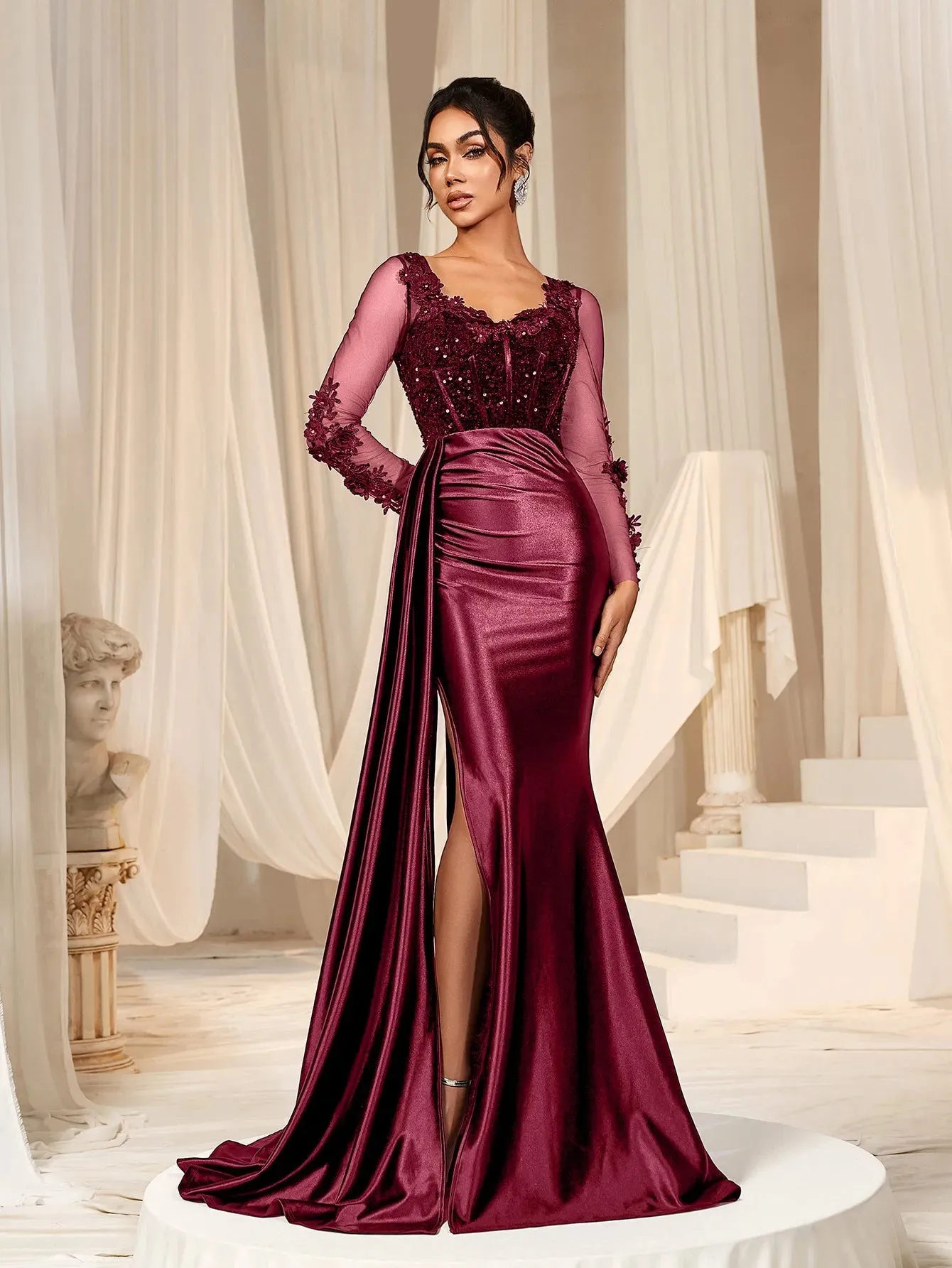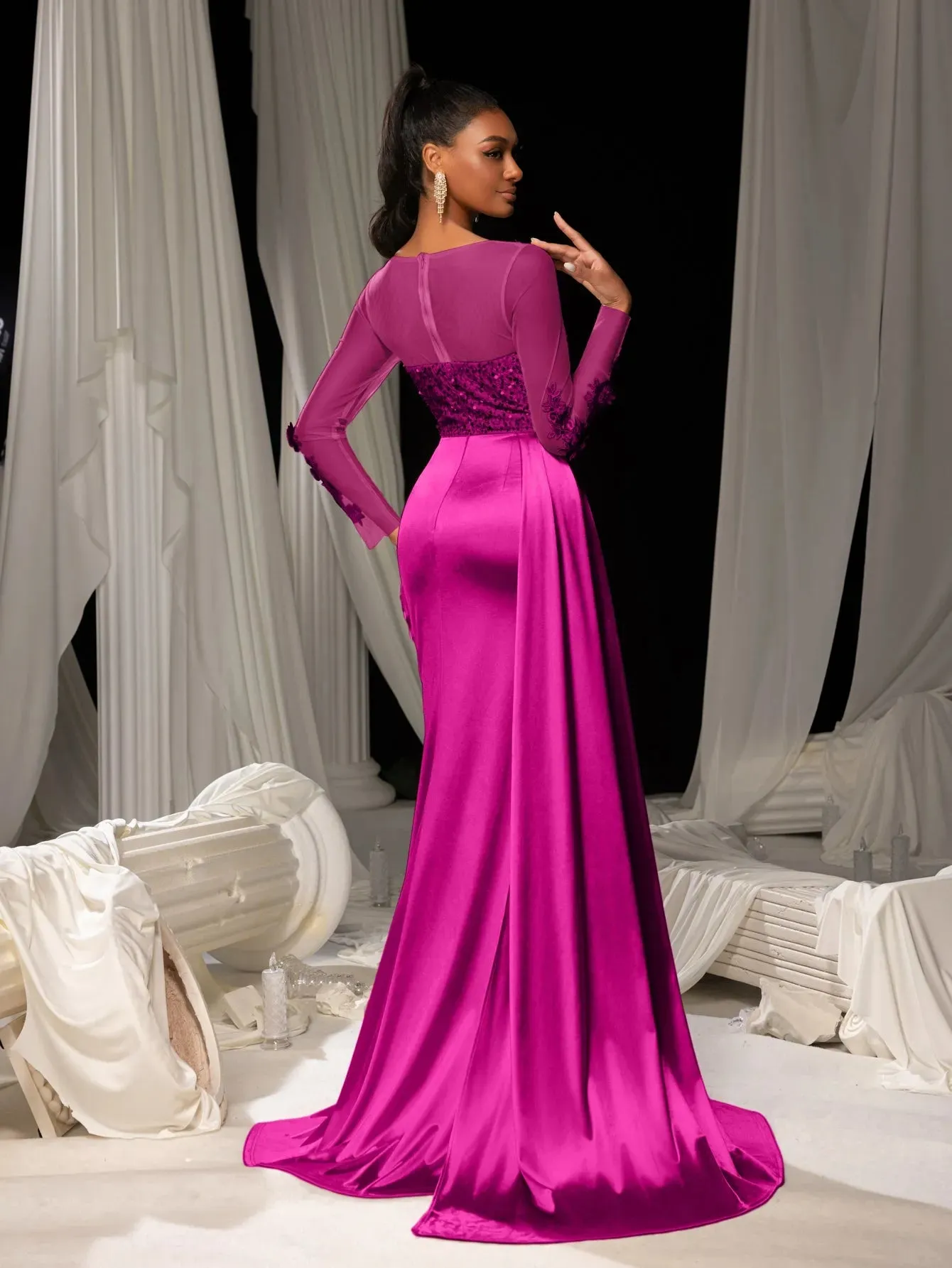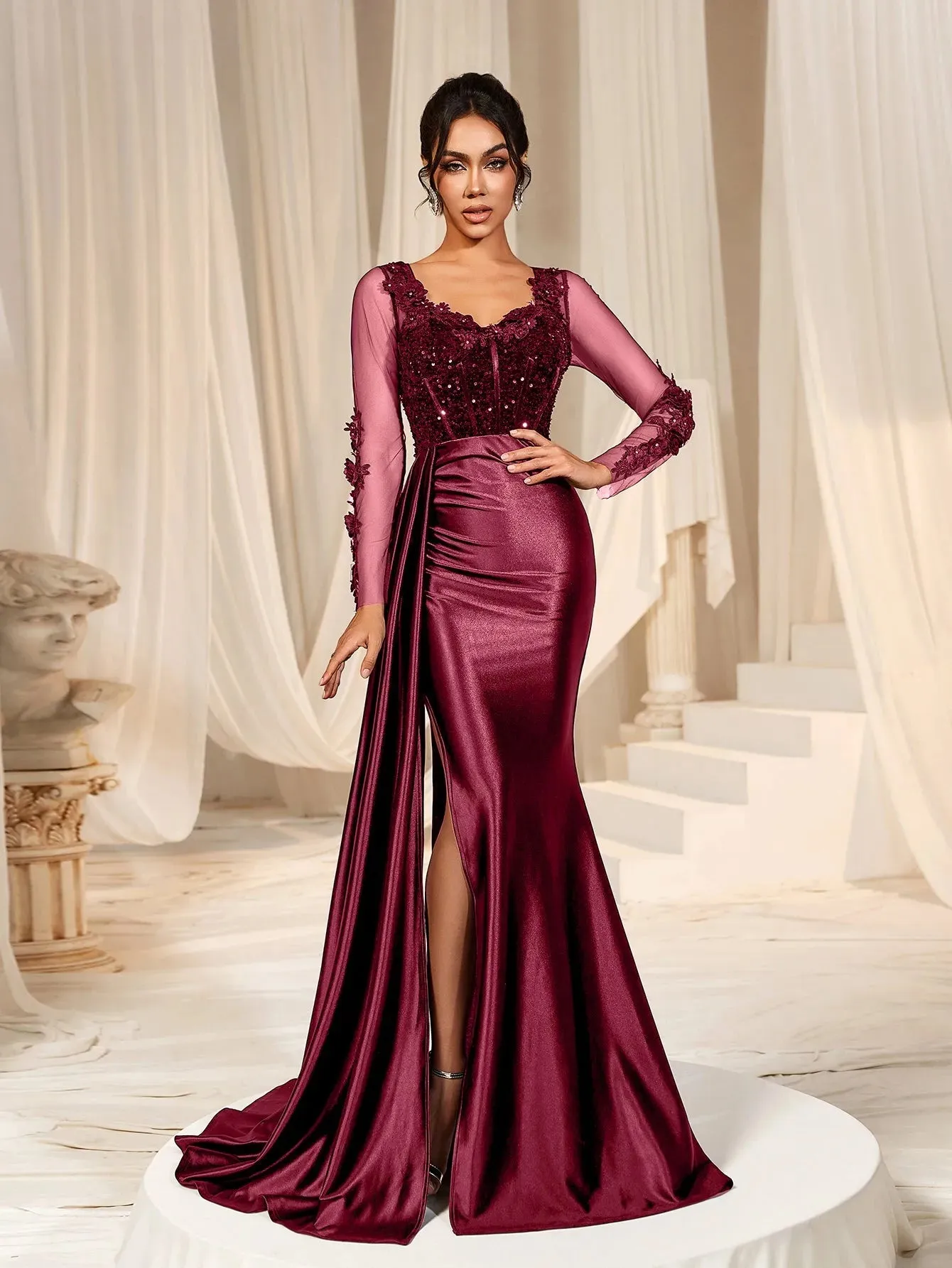 Make a grand entrance in our show-stopping satin mermaid gown, designed to exude sophistication and allure. This gown features a figure-hugging silhouette with a daring thigh-high slit and a luxurious satin finish that flows into an elegant train. The bodice is adorned with delicate lace appliqués and shimmering sequins, complemented by sheer long sleeves for a romantic touch. The back showcases a sophisticated sheer panel that adds a modern edge to this timeless design.