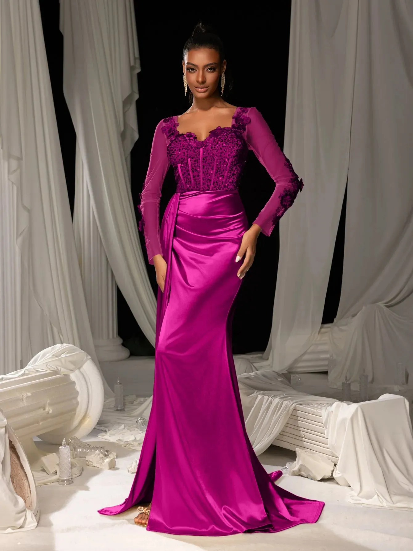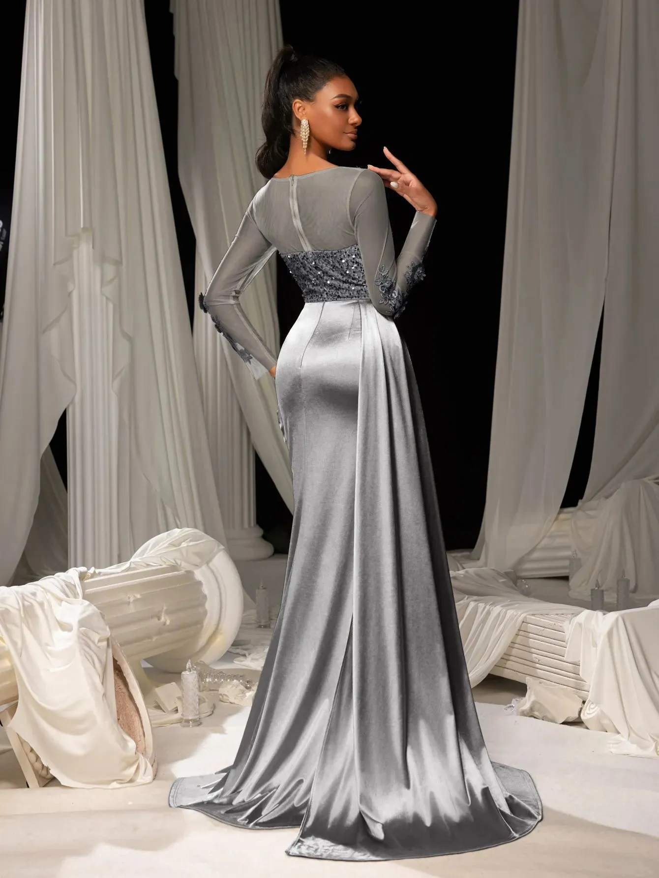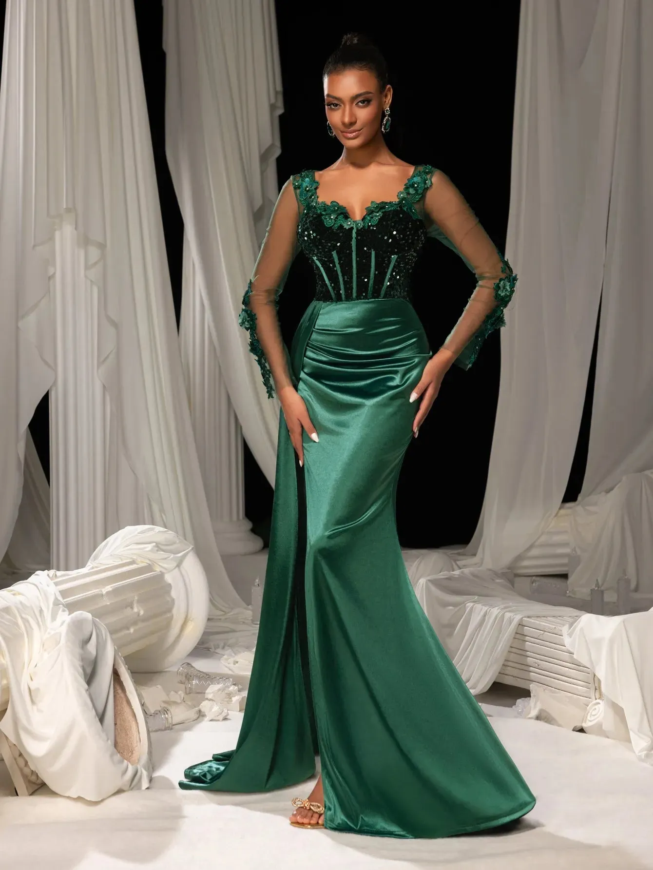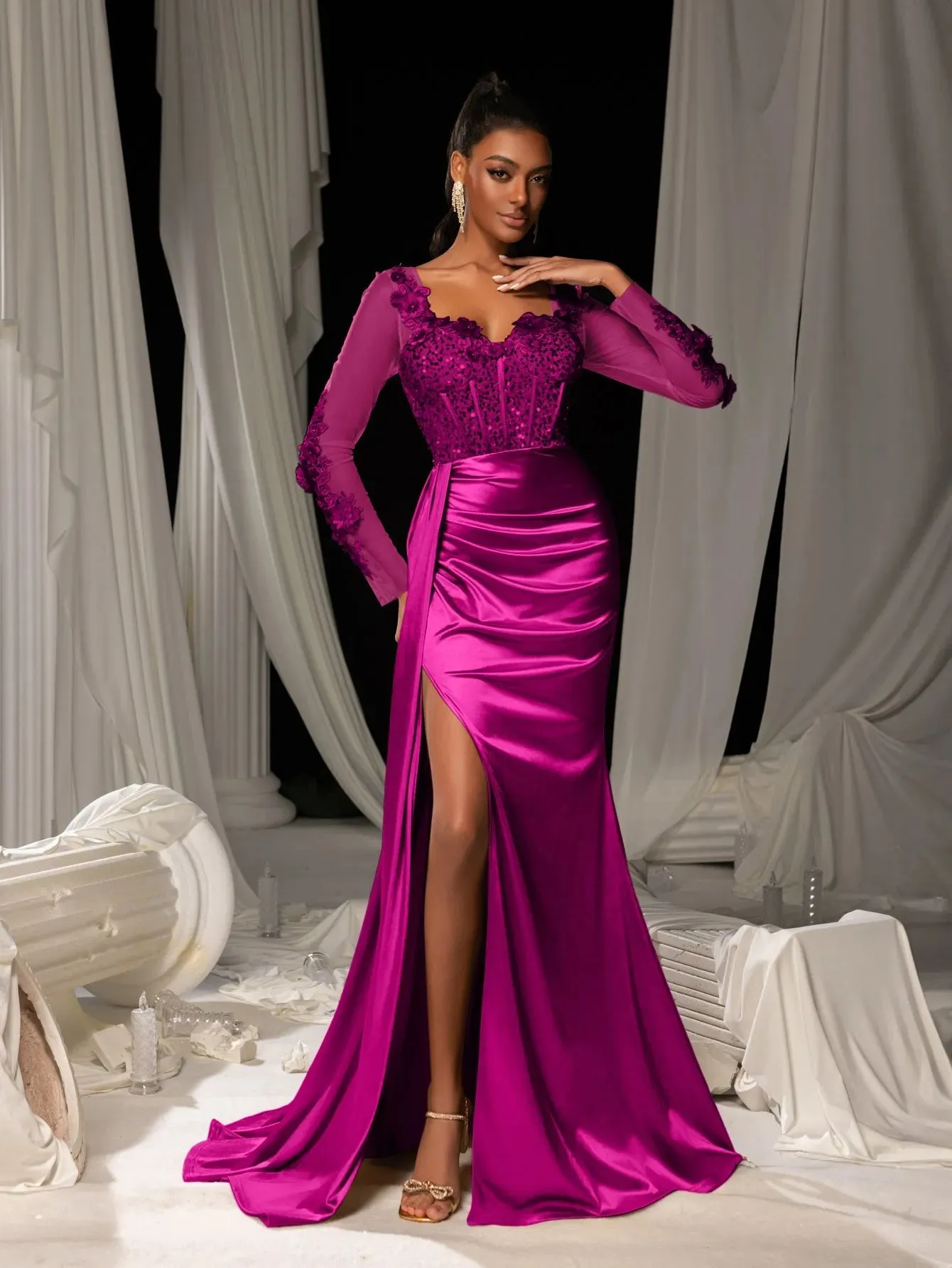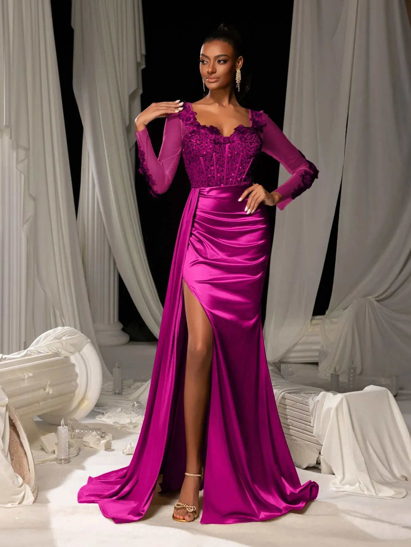 Make a grand entrance in our show-stopping satin mermaid gown, designed to exude sophistication and allure. This gown features a figure-hugging silhouette with a daring thigh-high slit and a luxurious satin finish that flows into an elegant train. The bodice is adorned with delicate lace appliqués and shimmering sequins, complemented by sheer long sleeves for a romantic touch. The back showcases a sophisticated sheer panel that adds a modern edge to this timeless design.