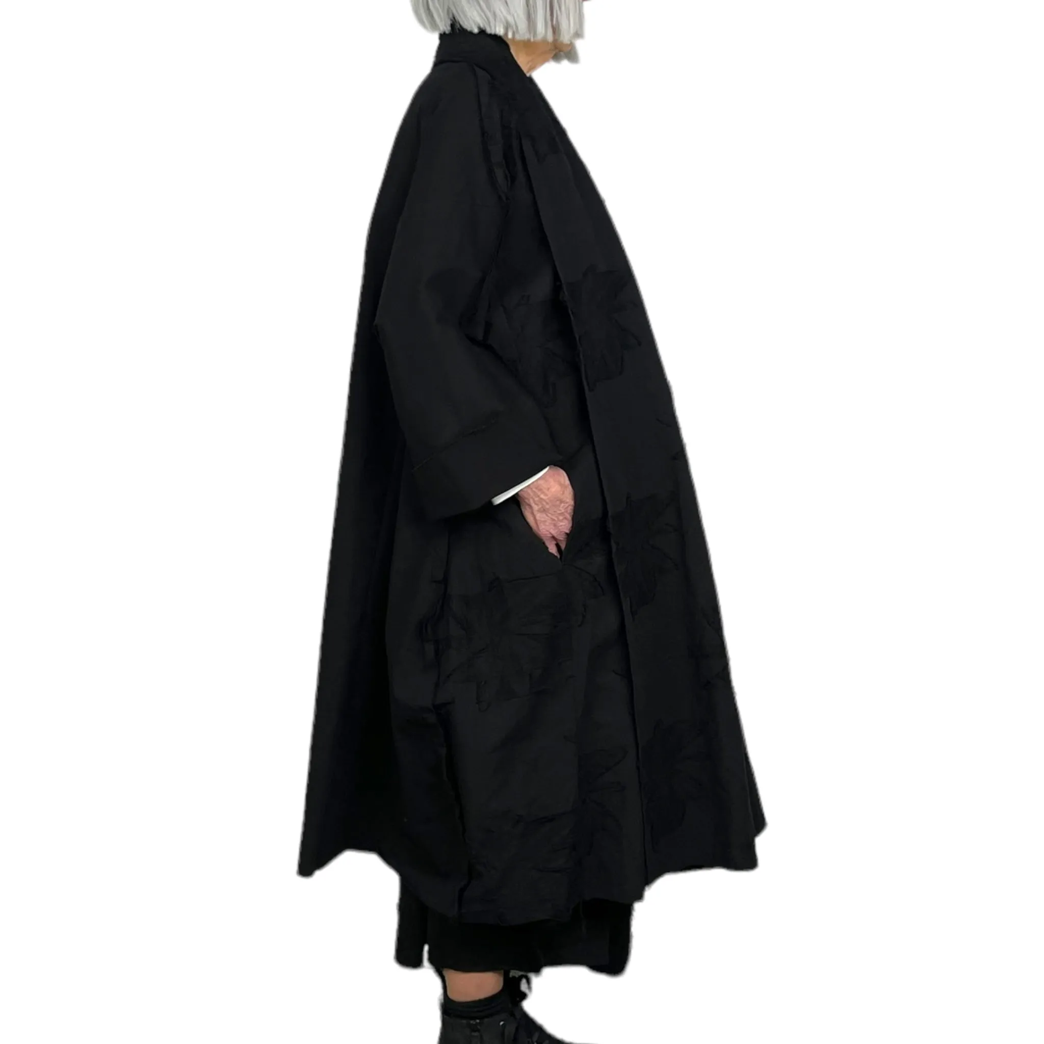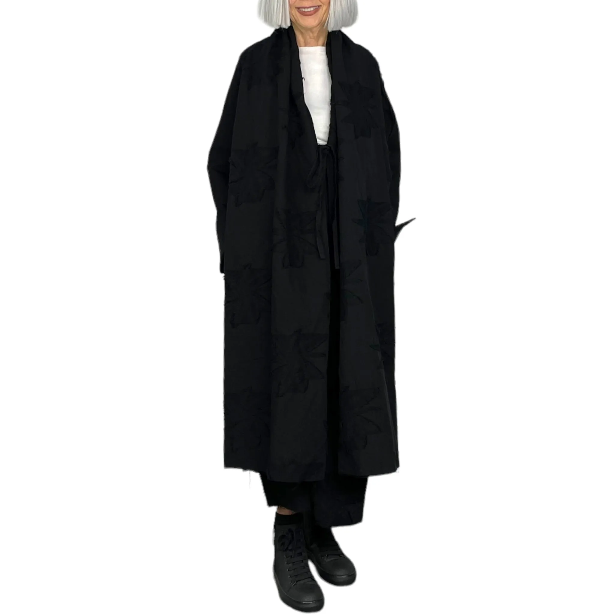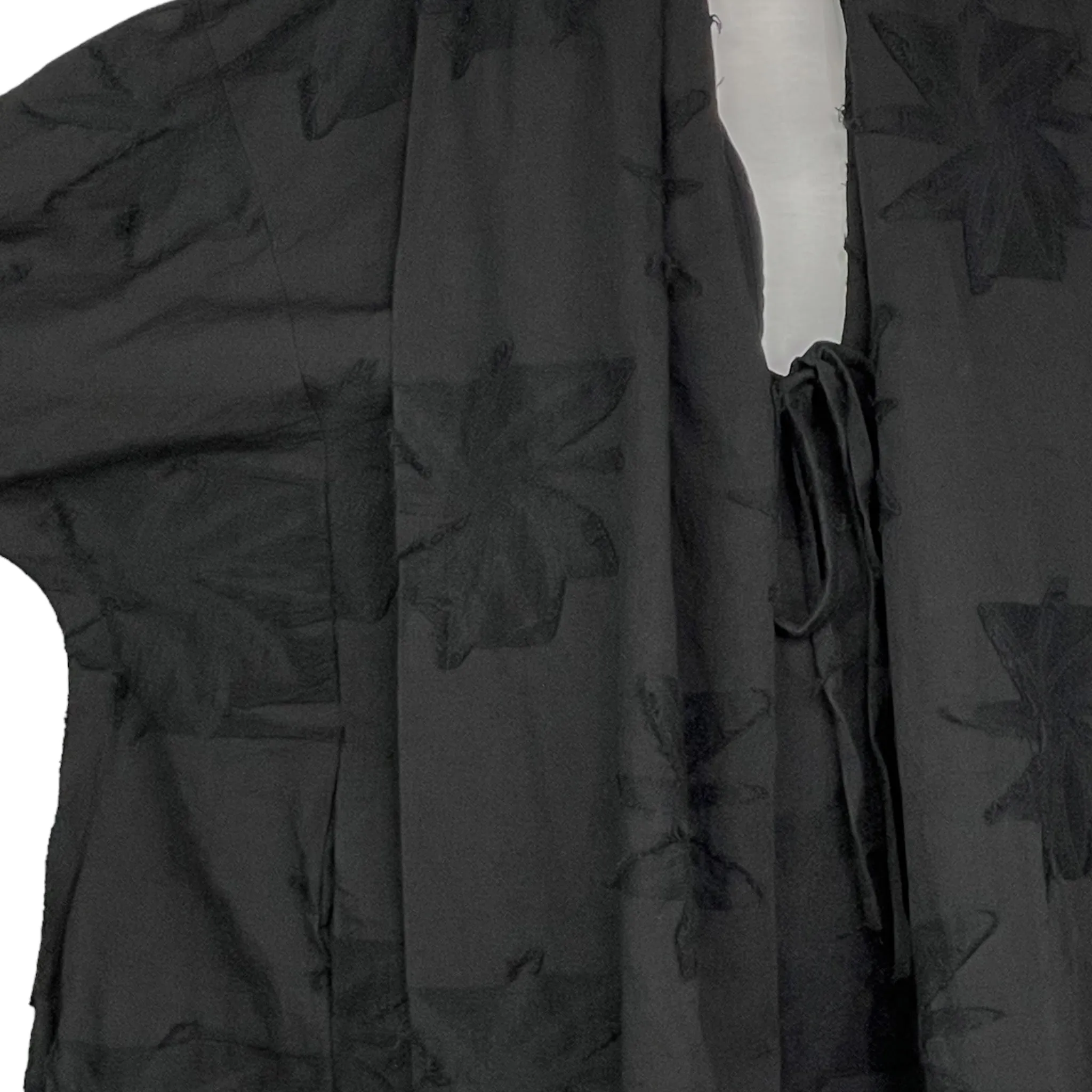 Shawl collar coat with tie closure and two front pockets. Turn-up cuffs and raw edges throughout. Front side has embroidered floral pattern with destroyed edges. Generous fit.