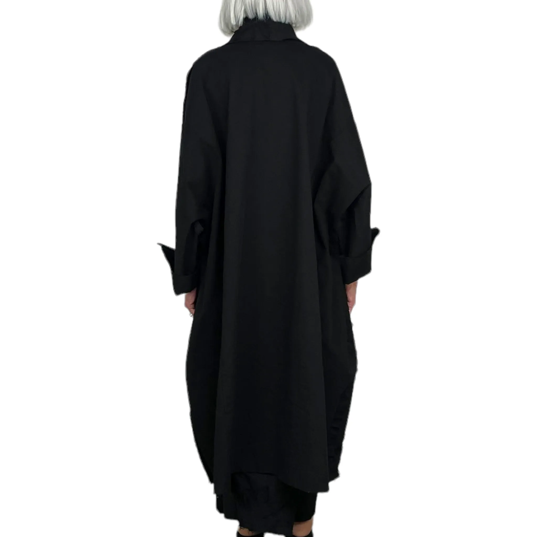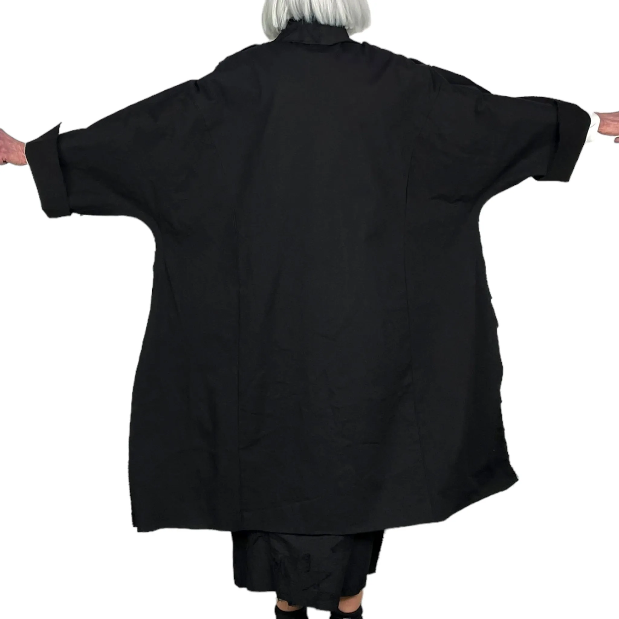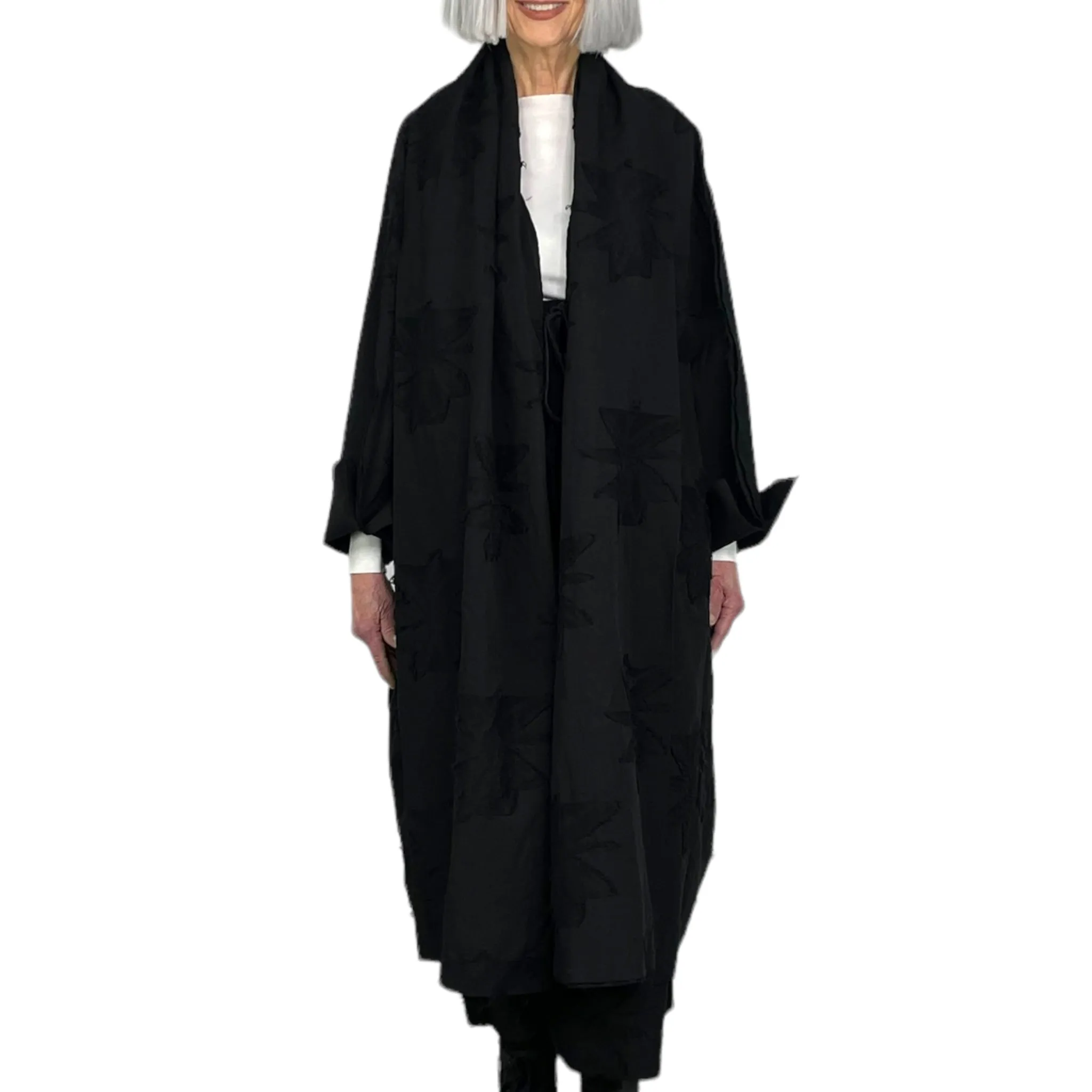 Shawl collar coat with tie closure and two front pockets. Turn-up cuffs and raw edges throughout. Front side has embroidered floral pattern with destroyed edges. Generous fit.