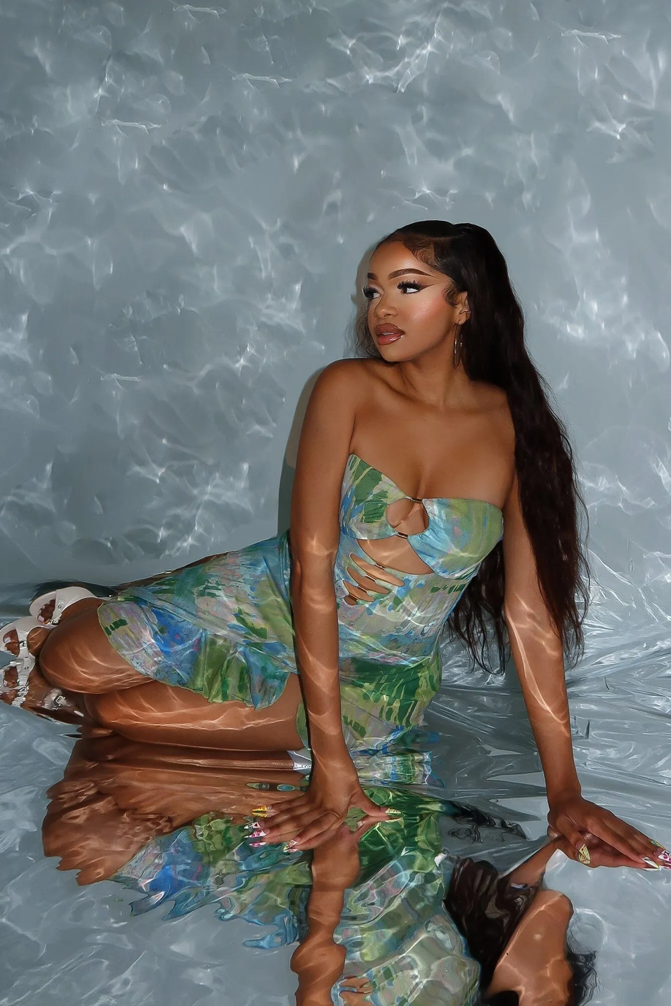 Print midi tube dress featuring asymmetrical ruffle hem split
