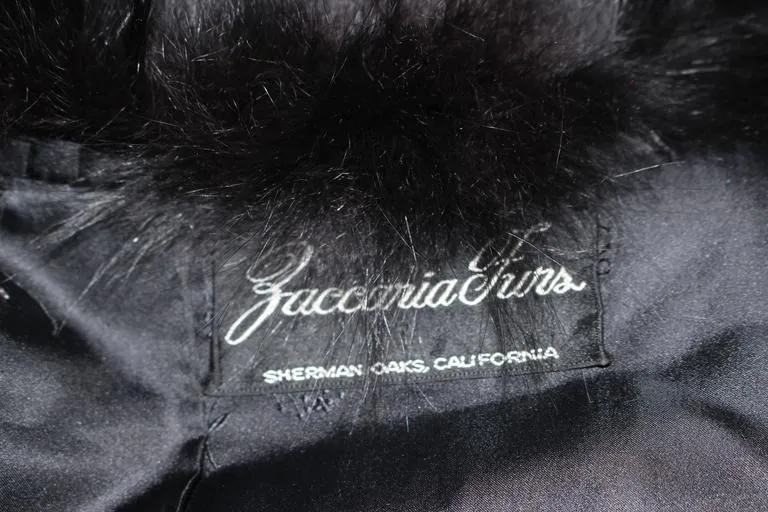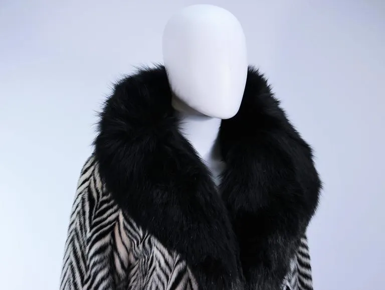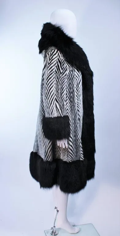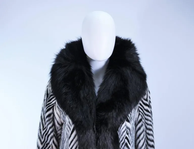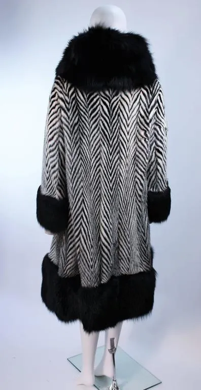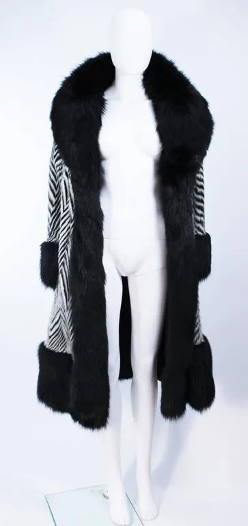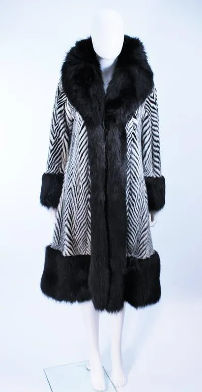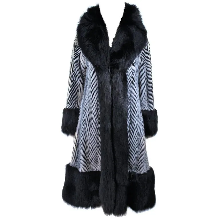 This coat is composed of a black and sheared mink with a stunning chevron pattern. Features a large fox collar with cuffs. There are side pockets as well as (3) center front hook and eye closures. Silk lining and velvet lined pockets. In excellent vintage condition.
