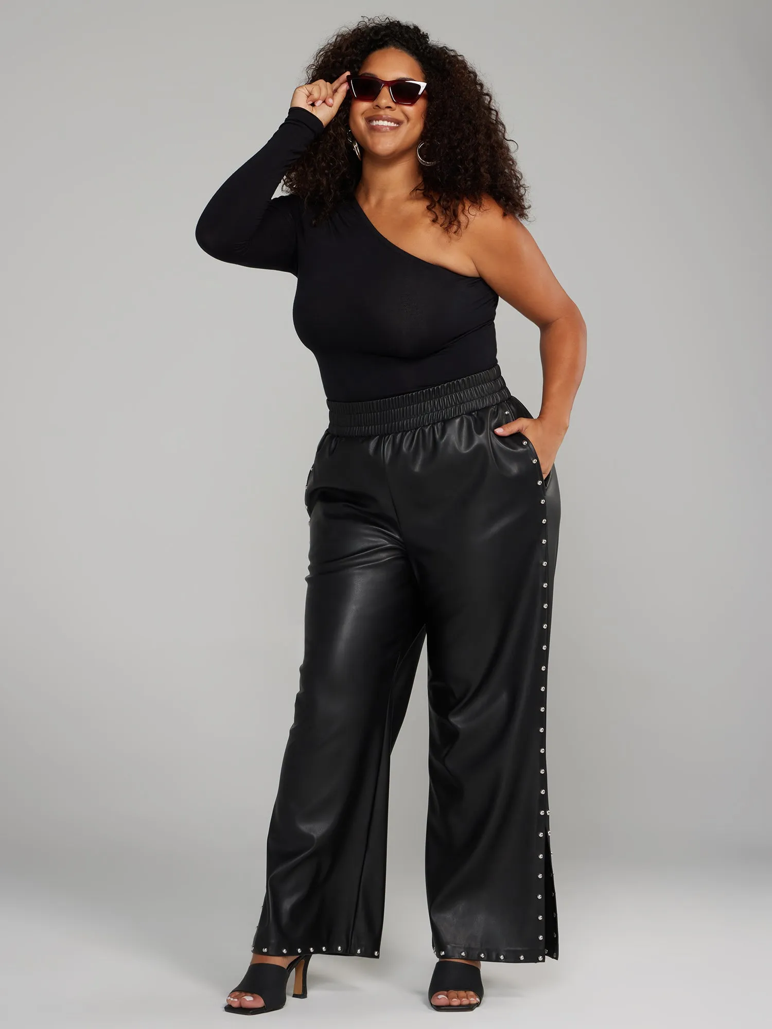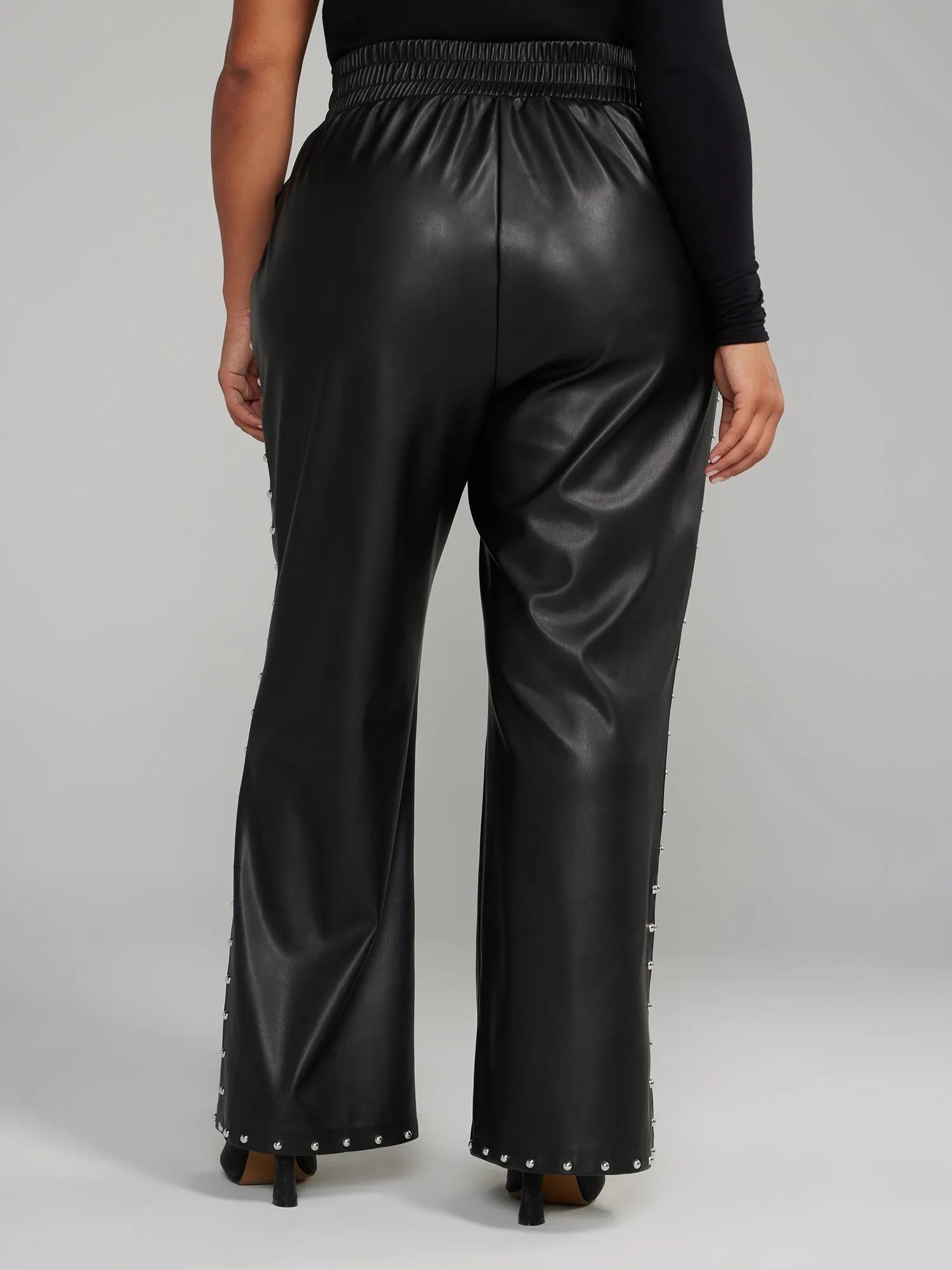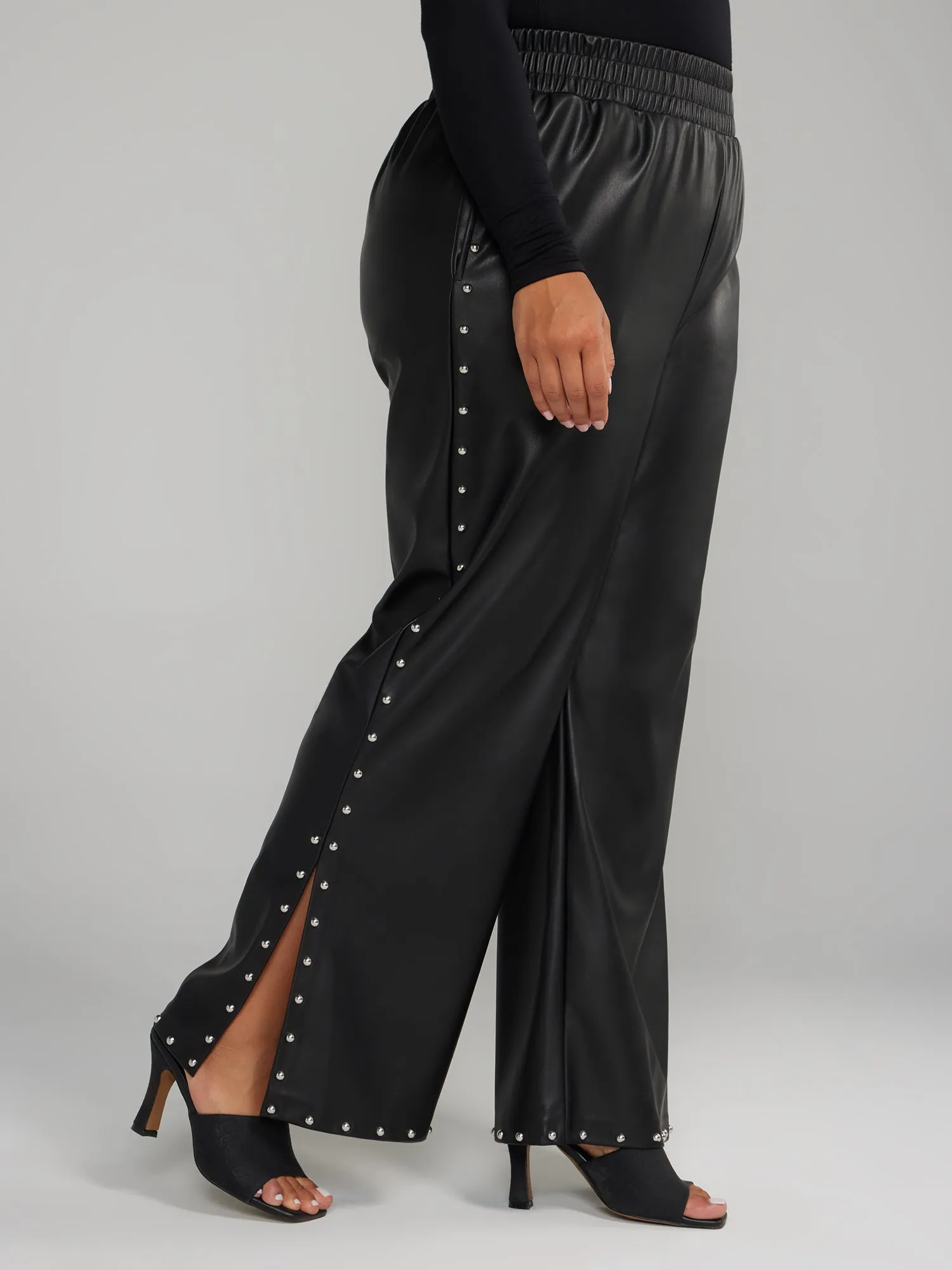 Look sleek and edgy in these luxe, faux leather stud detailed wide leg pants. With a wide elastic waistband, side pockets, and slits at the ankle, you'll be chic and comfortable all day. Ready for some seriously fashionable fall fun? Let's goooo!