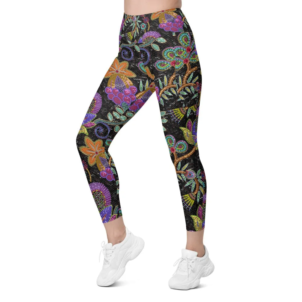 Do you love actual paillette? Then you will fall in love with the Gearbunch Faux Paillette Flower Leggings with Pockets. A bight green, orange, pink and purple floral design on dark grey background, and hints of silver through out the design, from a far away people will really think you are wearing actual paillette! Featuring a classic, high-waisted cut, exceptional comfort, and two practical side pockets, these leggings will support you during yoga sessions, gym workouts and all your favorite sports and hobbies; or to simply chill out on the couch! Be Happy, Be Bright, Be You with Gearbunch