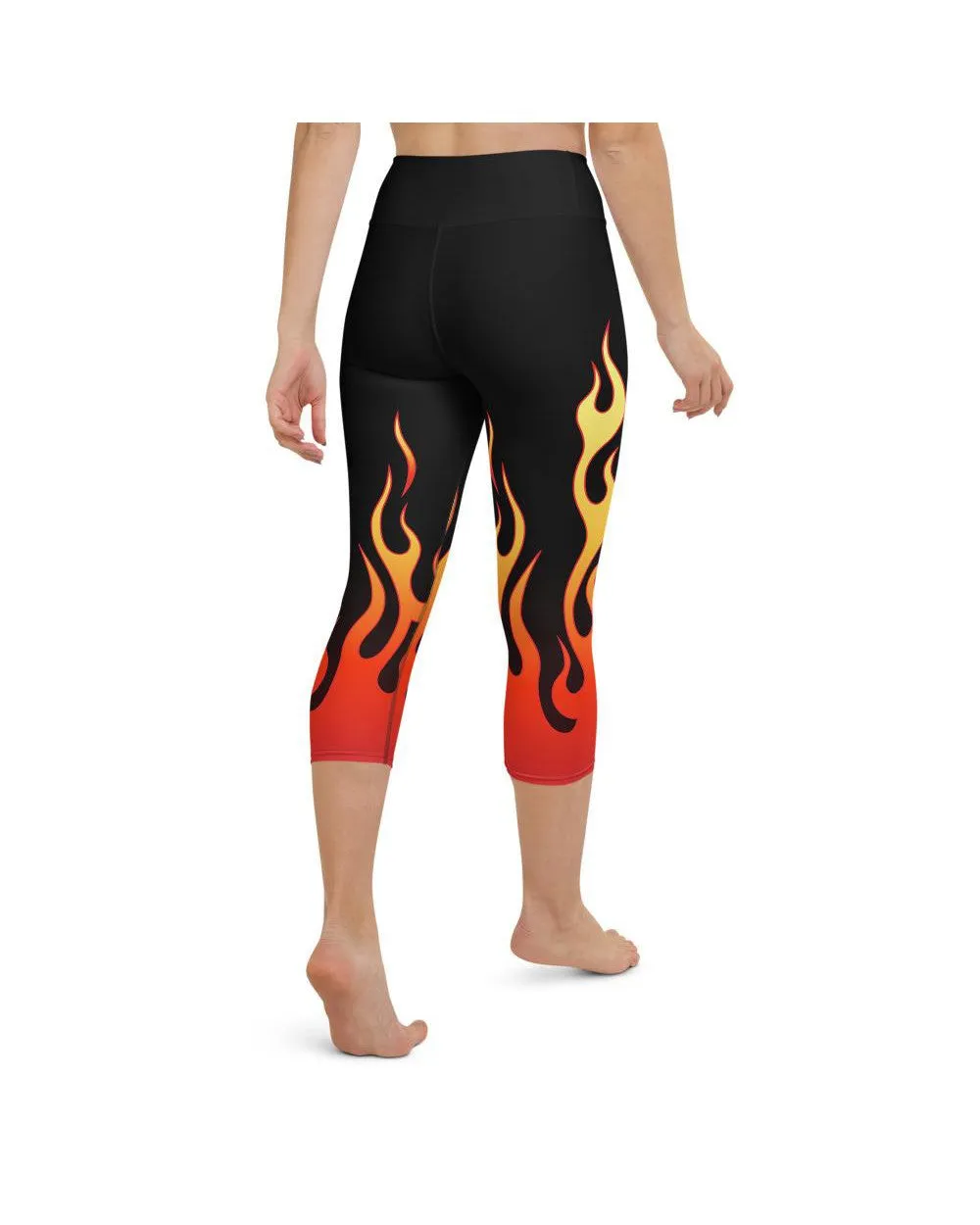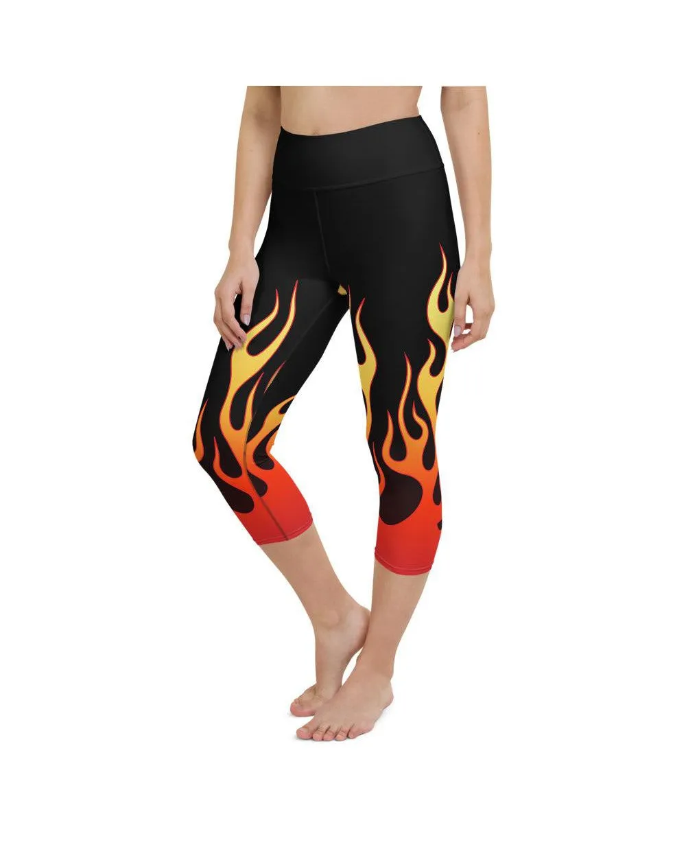 Make a statement & maybe move a little faster in these bold black capri leggings with rising red, orange and yellow flames