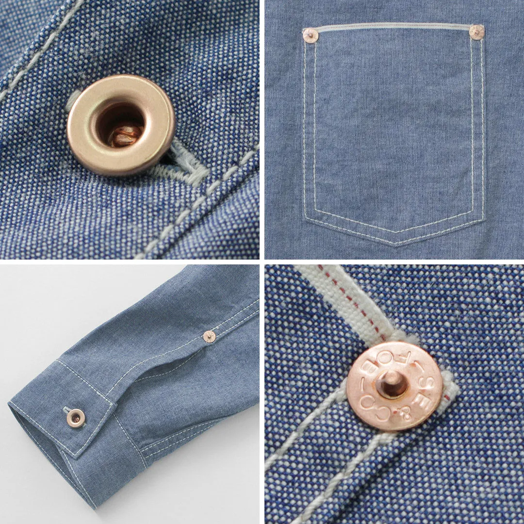 The 9-ounce original chambray fabric is woven slowly and carefully on an old-style power loom at a tension as close to hand-woven as possible.