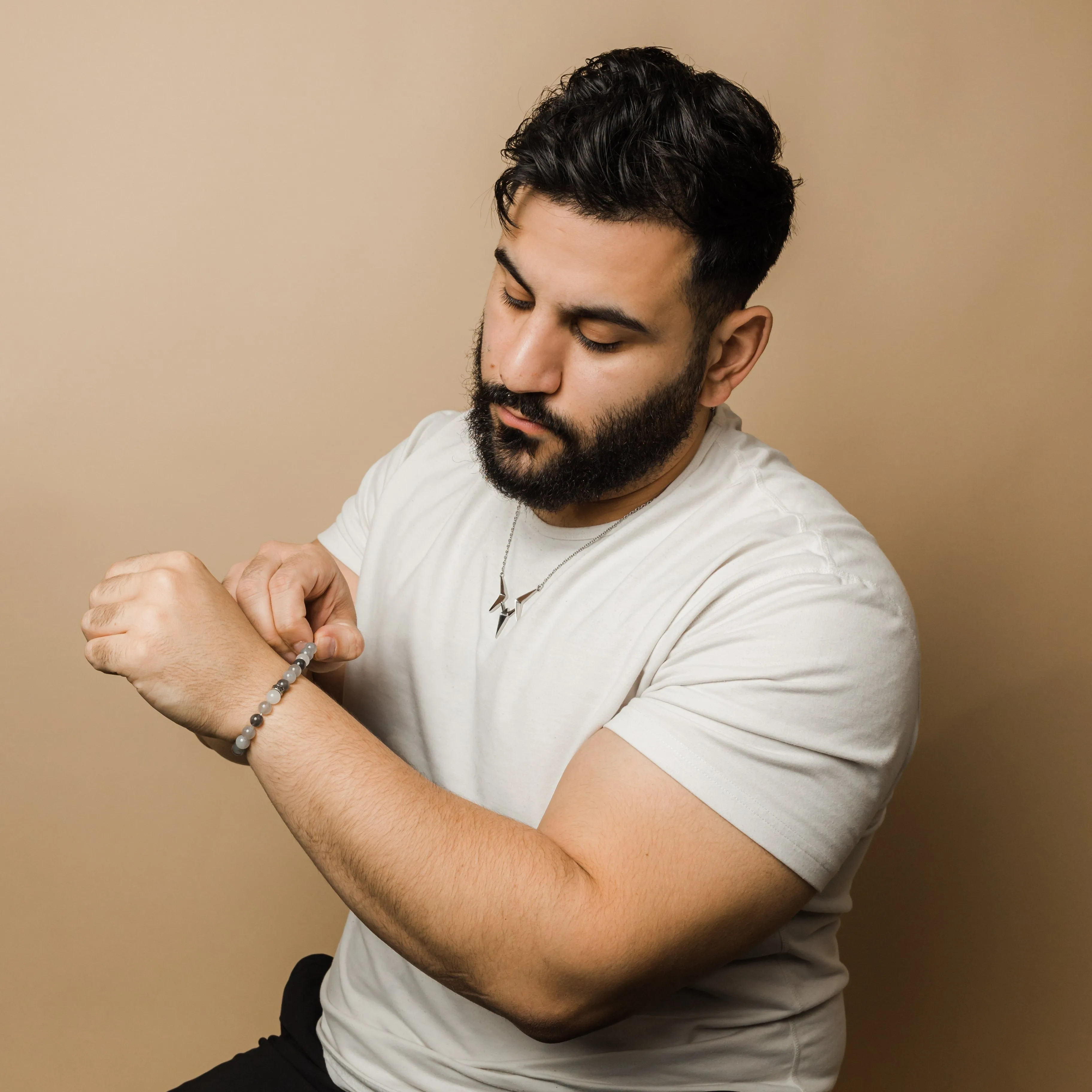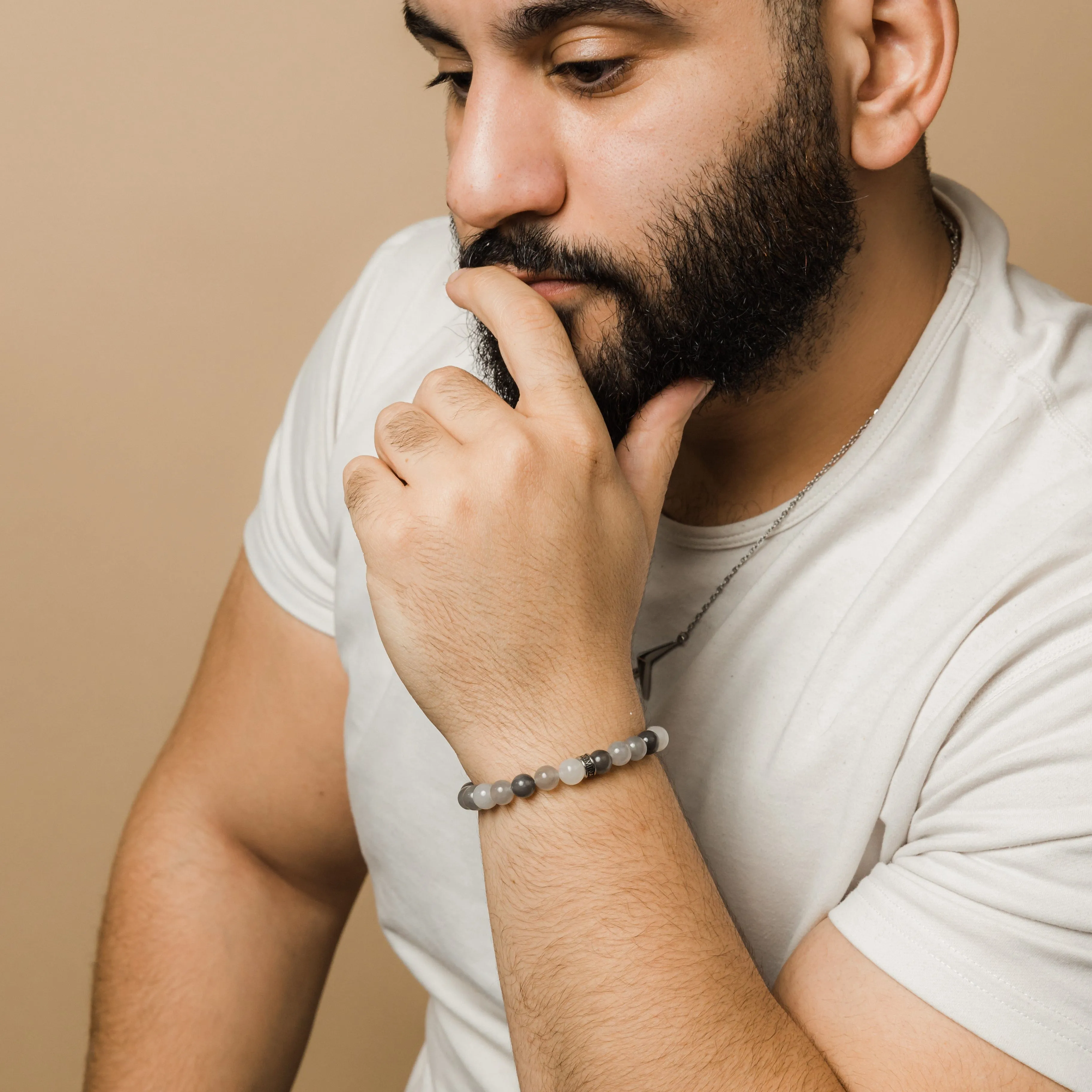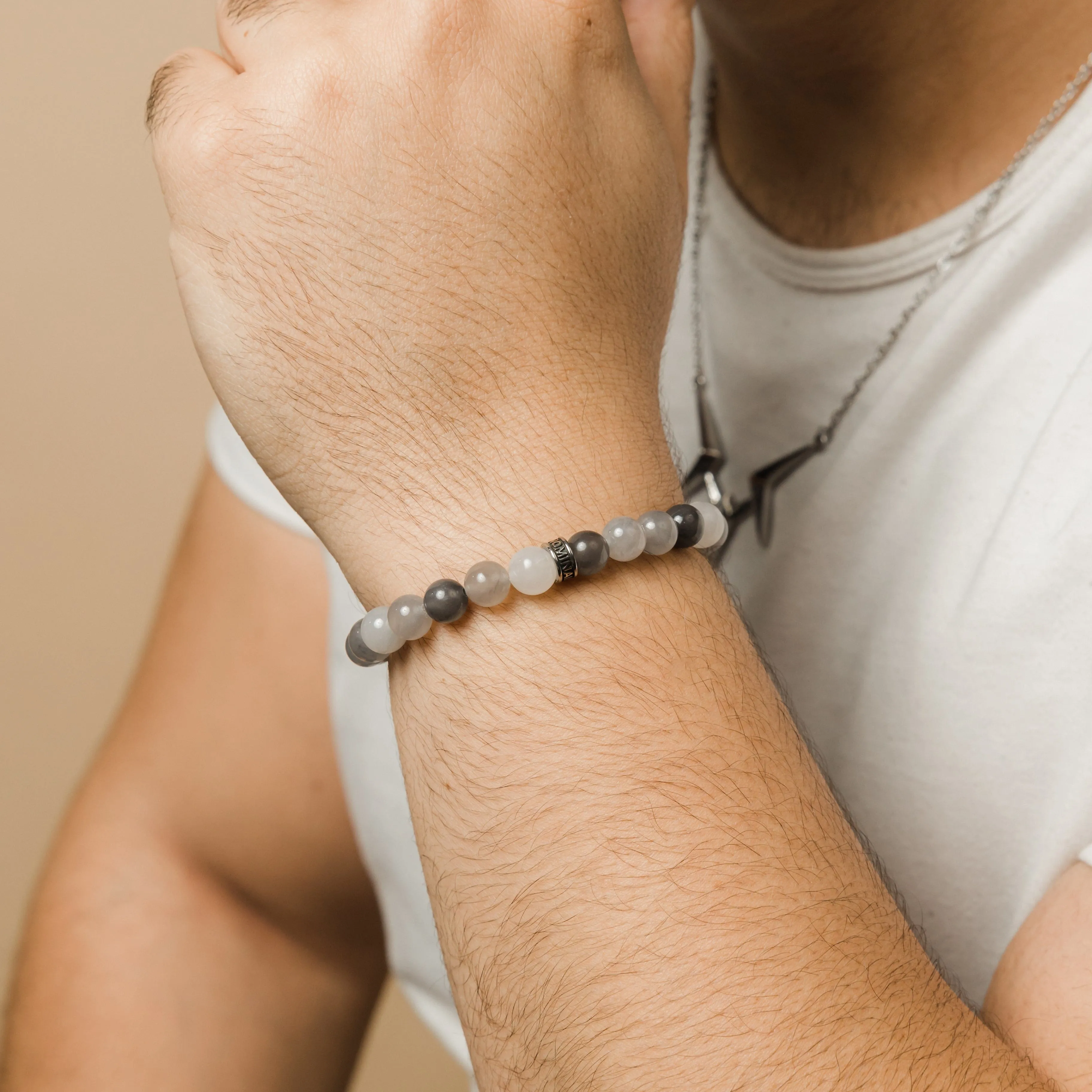 Made from entirely natural stones, our Kosmos Collection - inspired by the Greek word that translates to "world" - is sure to be one of your favorite stone bracelets, inspired by different elements of our beautiful Earth. Our Fog colorway is made with natural translucent stones that gives a smokey look to a light color that's meant to go with any outfit, casual or dressy.