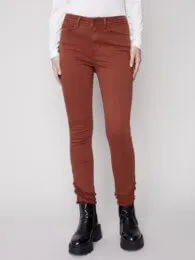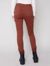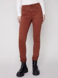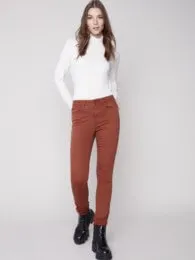 Add some spice to your style with these denim pants in Cinnamon. A little stretch, five pockets, regular rise waist, and an eye-catching frayed hem will make you want to wear them again and again. Plus, Cinnamon is the perfect warm fall color!