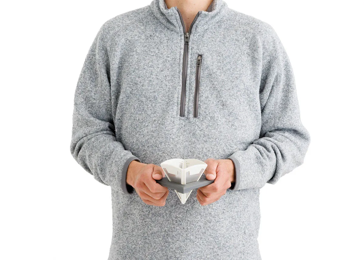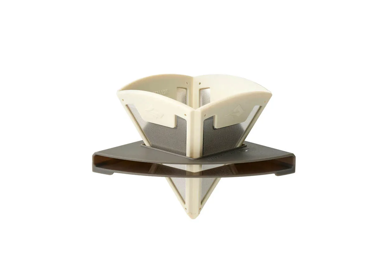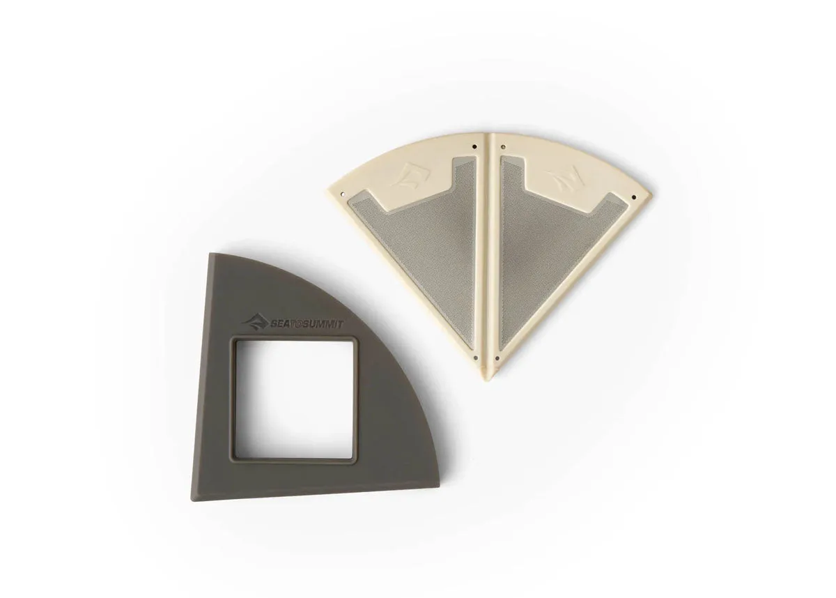 The Frontier Ultralight Collapsible Pour Over folds flat for storage in its polypropylene mount base, then pops out when needed to make a perfect pour-over brew. The easy-to-clean stainless steel mesh filter is sized just right for one serving (approx. 30g) of ground coffee and formed to hold the grounds but filter the coffee oils for a rich, satisfying cup of coffee. The mount base fits most mugs and wide-mouth bottle rims, and the EU food-grade silicone rubber and stainless steel filter unit slides inside the base for easy transport. It even stows nicely in a Frontier Collapsible Kettle.