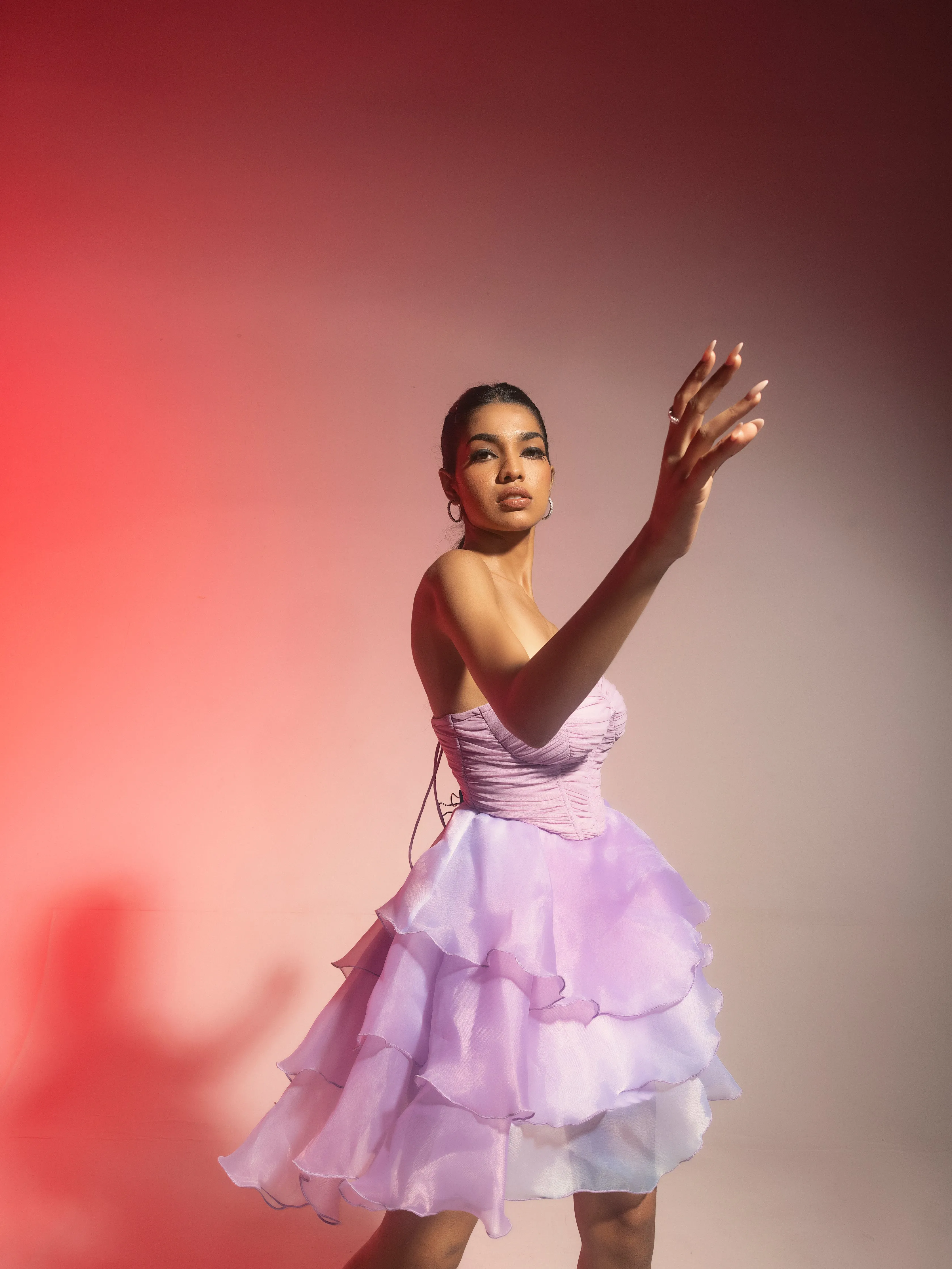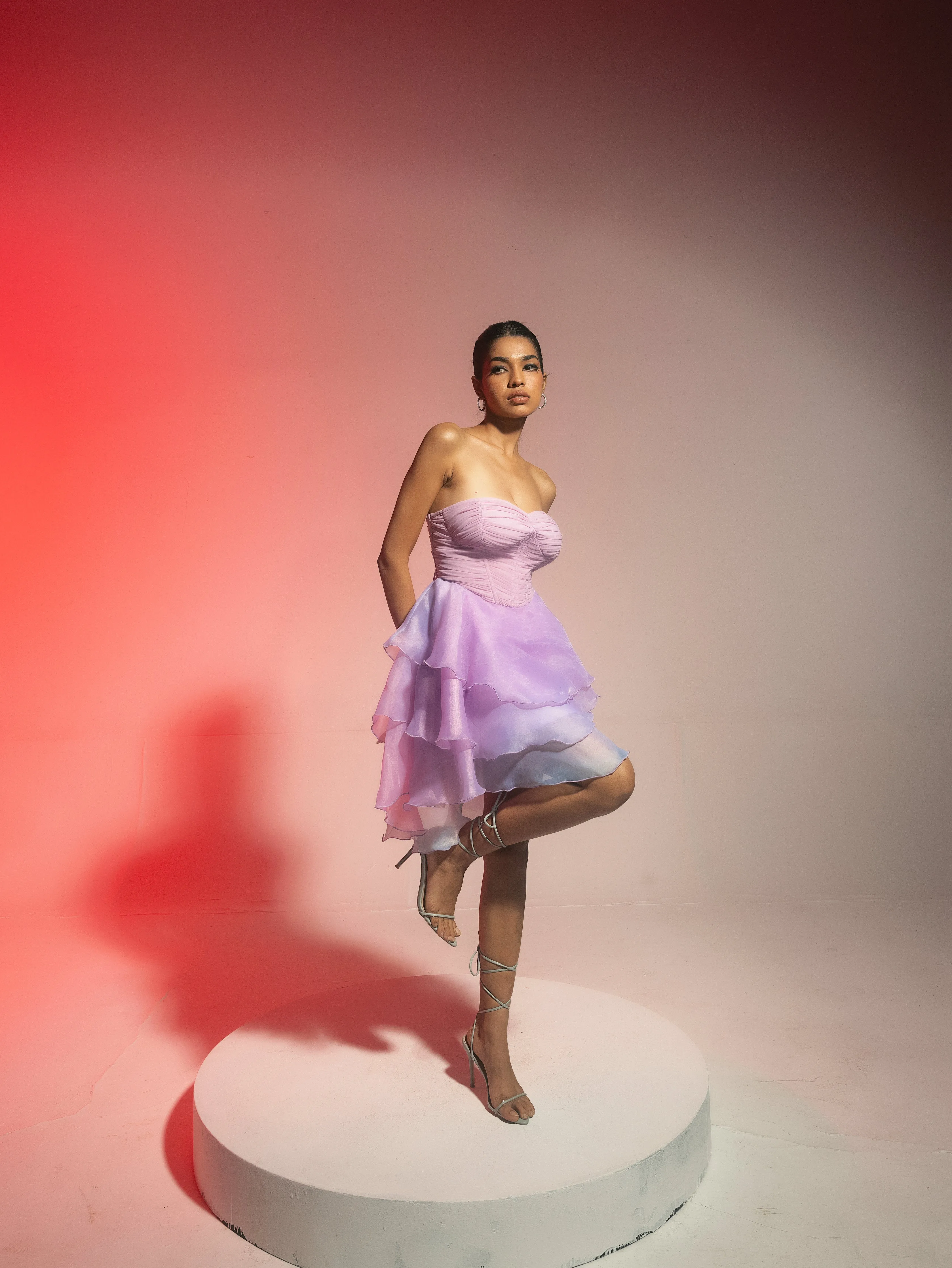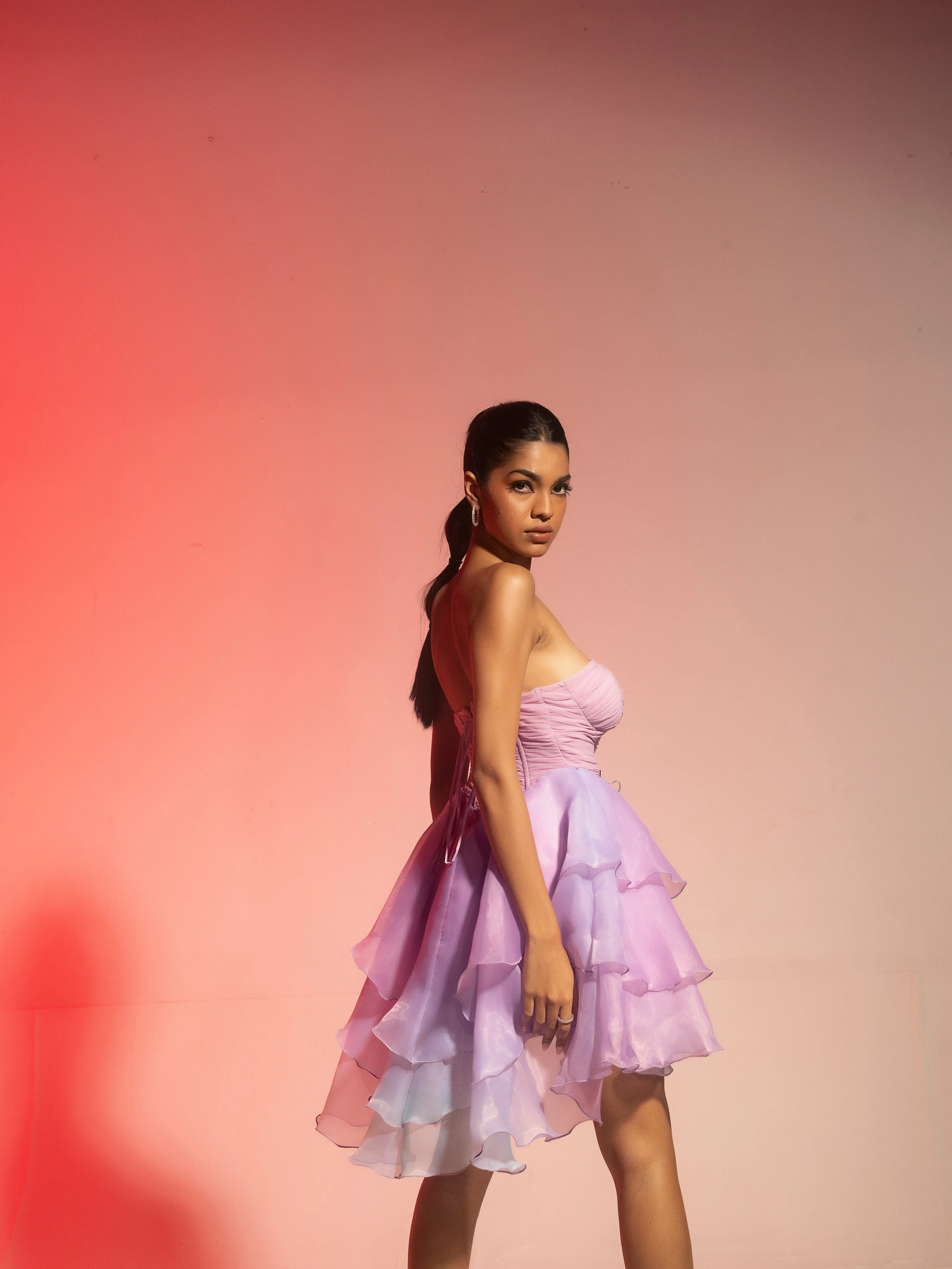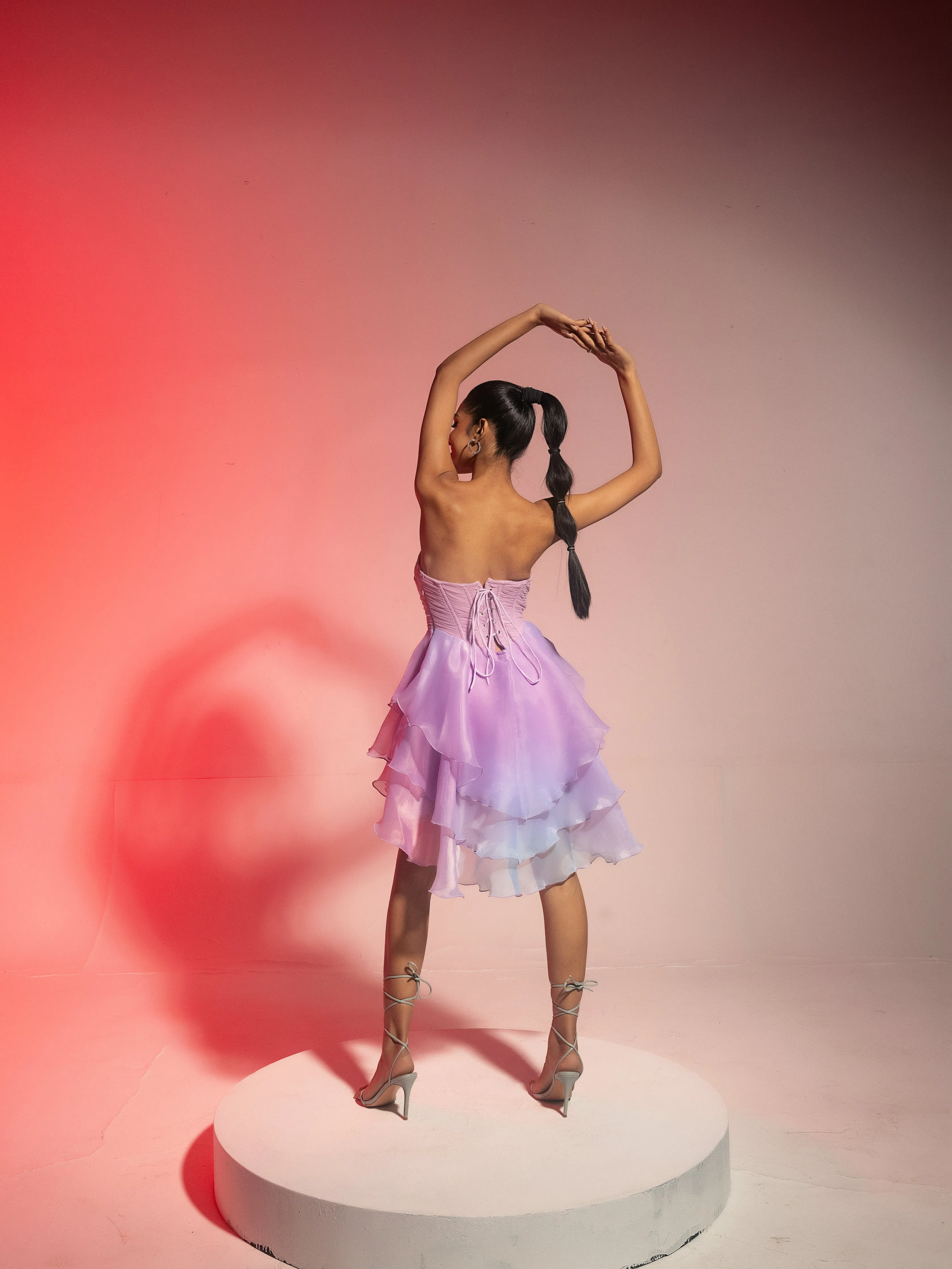 Fall in love with the effortlessly romantic Gemma Lavender Ombre Ruched Mesh Corset Dress. Made with our famed power mesh and ombre organza fabric, our Gemma comes with a bodice featuring our signature boned corsetry with all-over ruching that shapes and sculpts while being oh-so-comfortable. A voluminous mini skirt comprising asymmetrical layers of our gorgeous lavender-to-blue ombre organza fabric completes the stunning look!