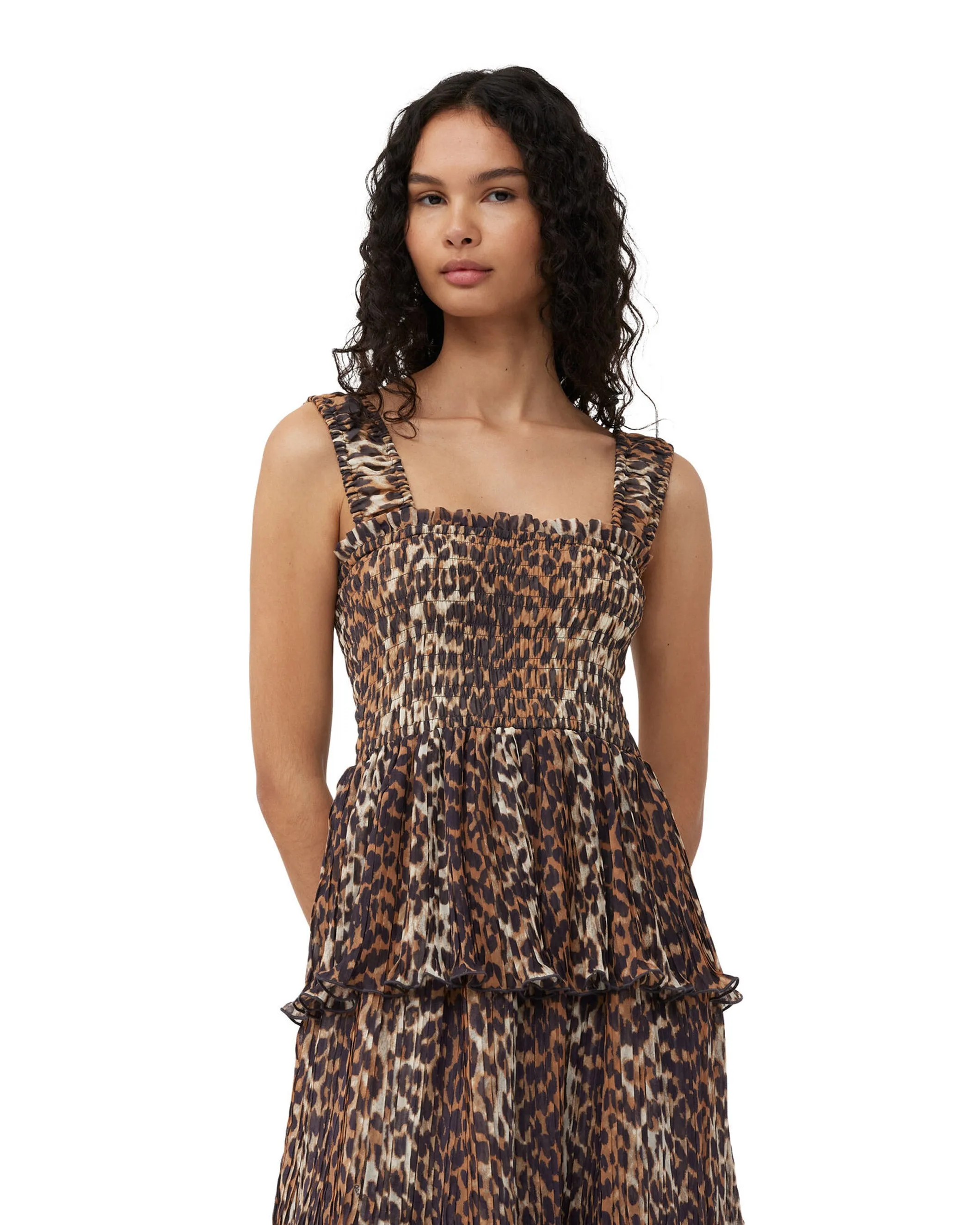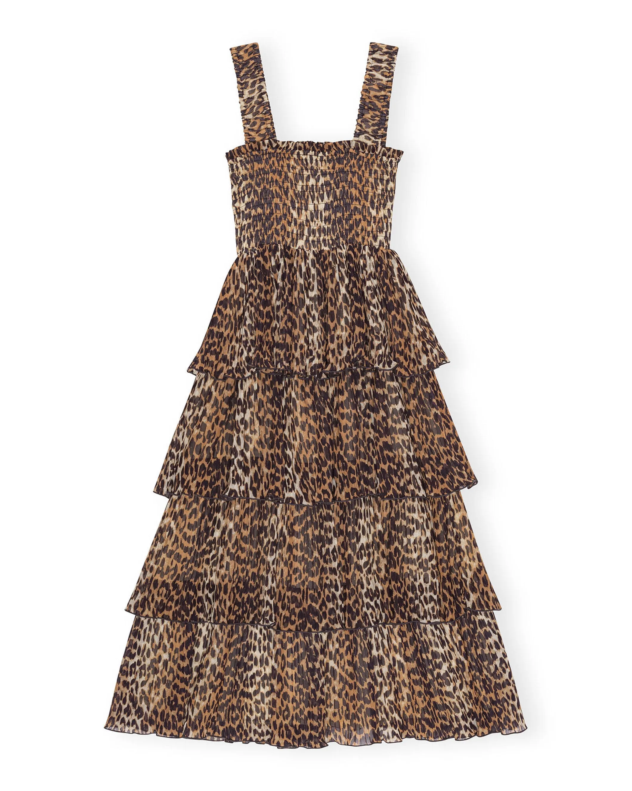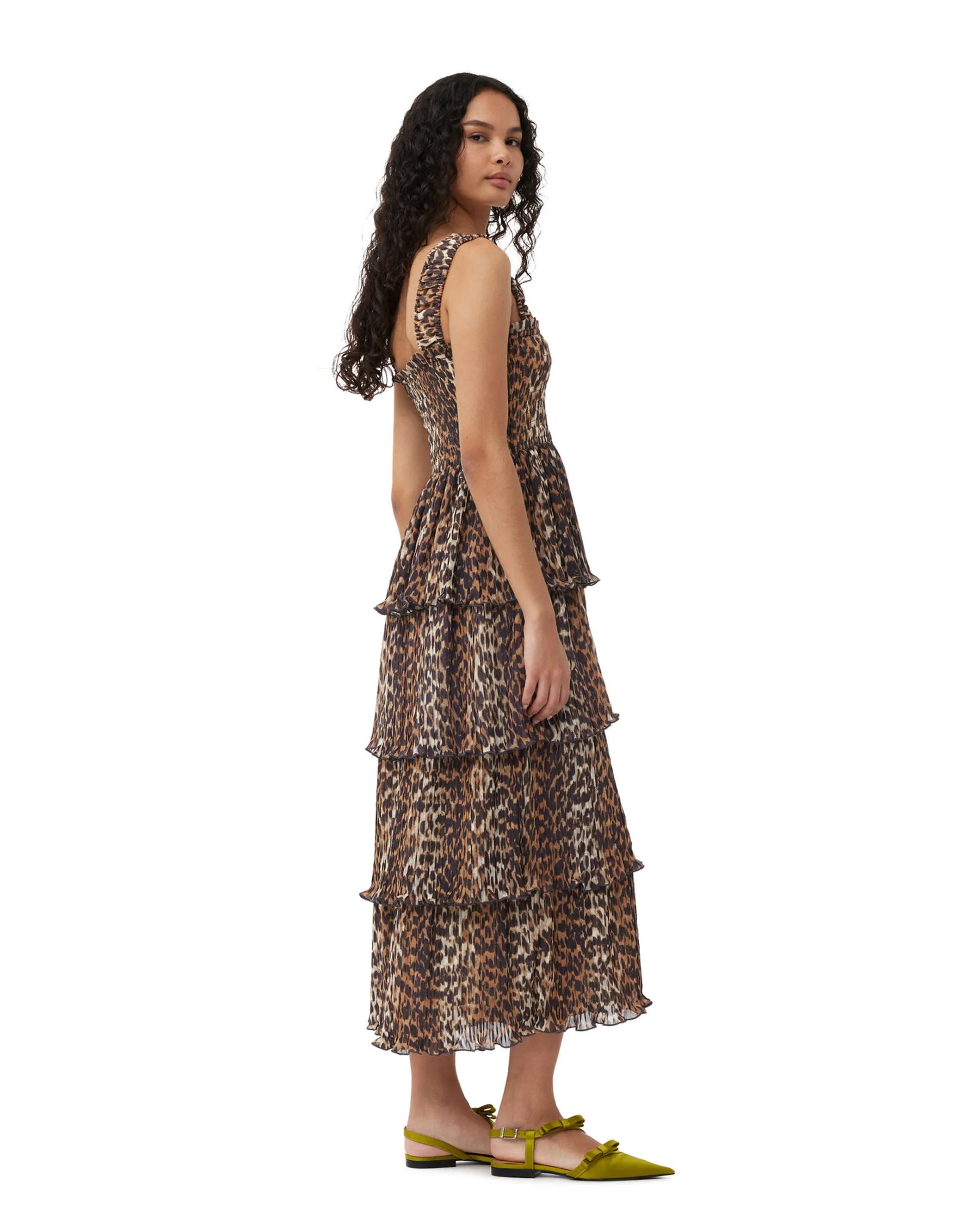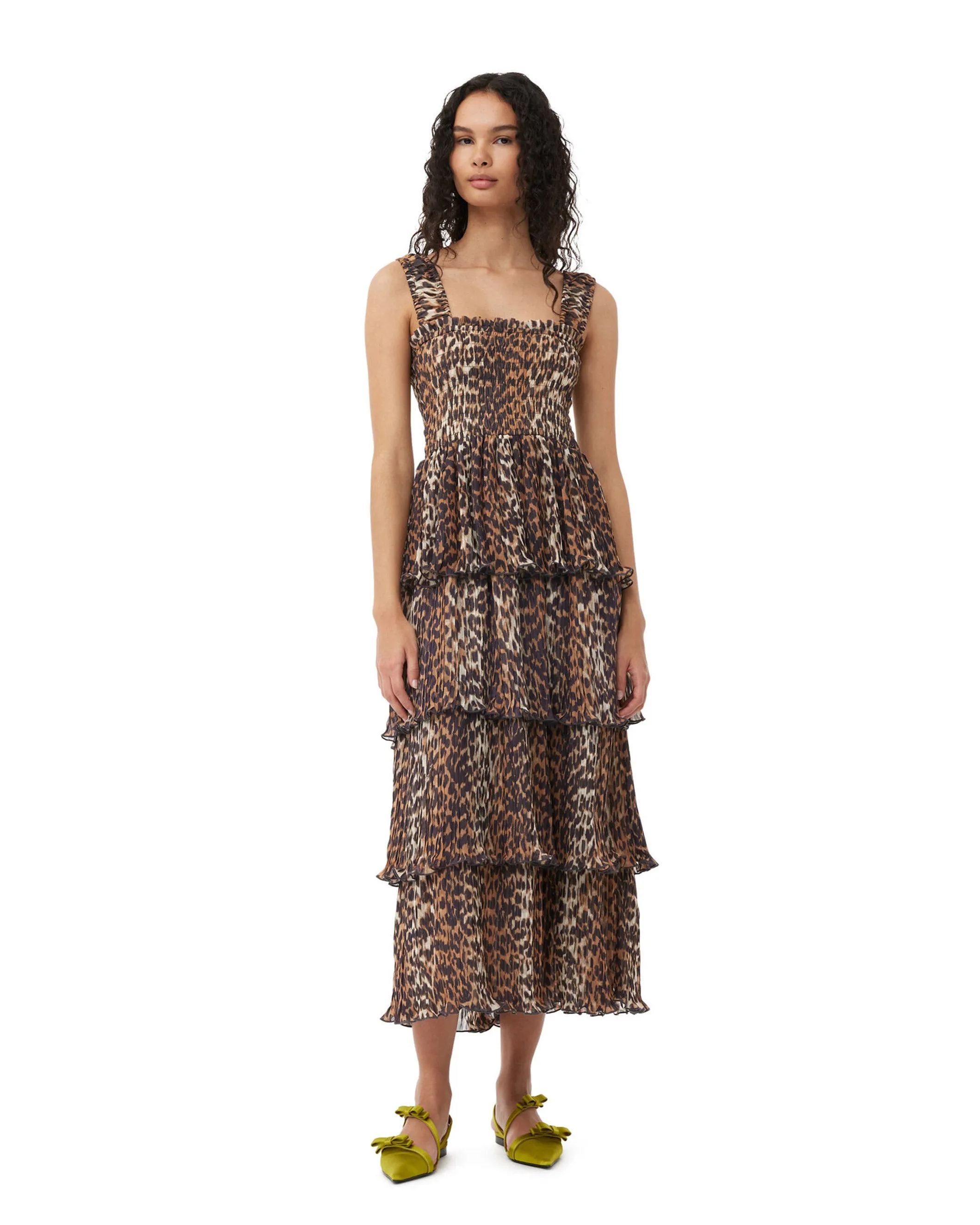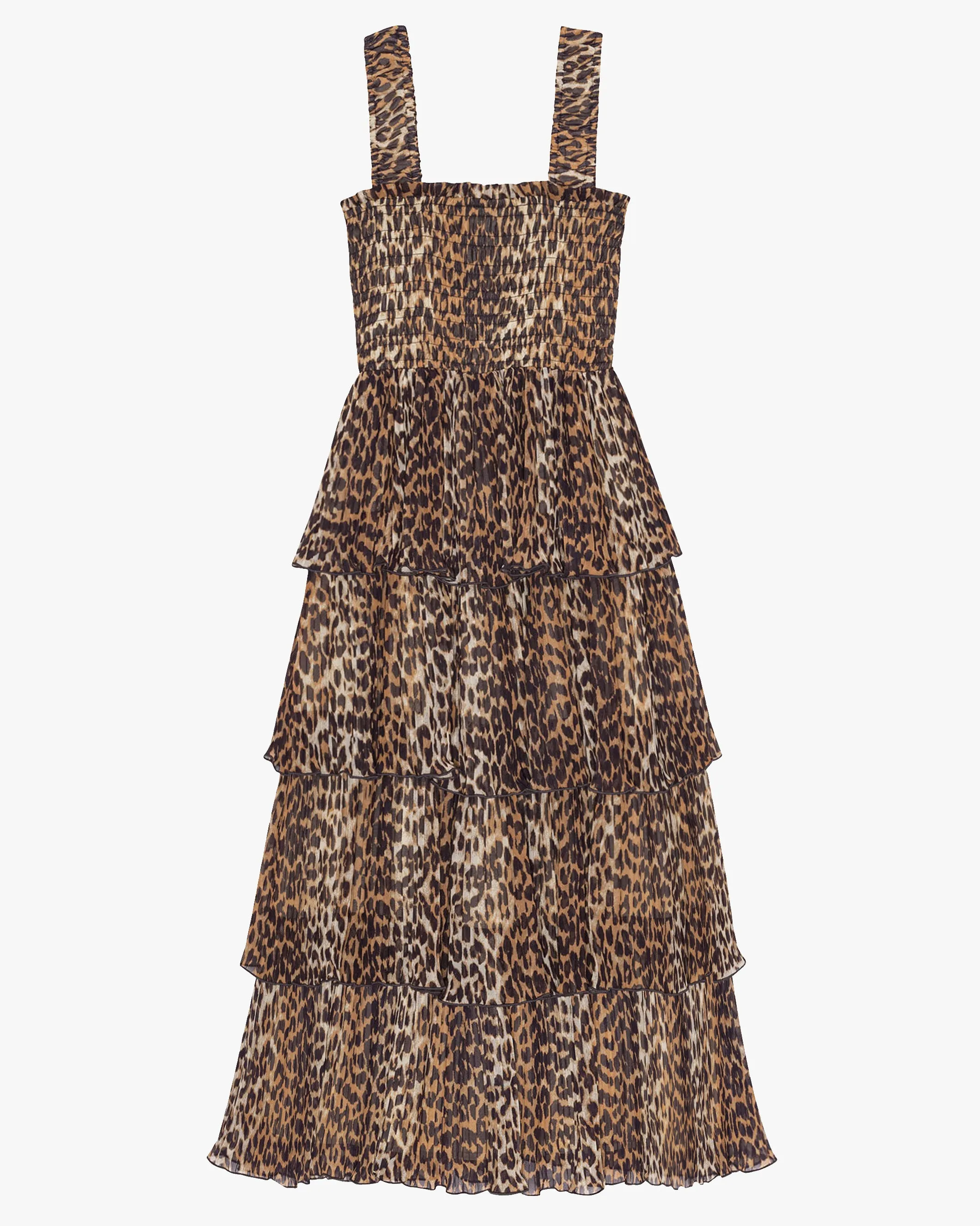 Slim fit midi dress, cut from a leopard printed pleated georgette. A form-fitting silhouette, featuring a square neckline, thick elasticated straps, smock bodice and flouncy tiered skirt.