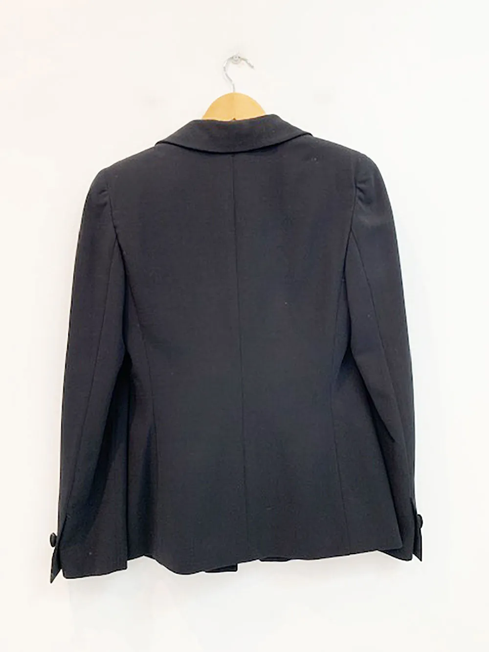 A simply stunning 1980s black wool crepe jacket from luxury designer label Giorgio Armani. A classic but featuring lapel collar, full length sleeves, single button fastening and fully lined. This is a perfect vintage piece, one owner and a piece of history for you for forever!!