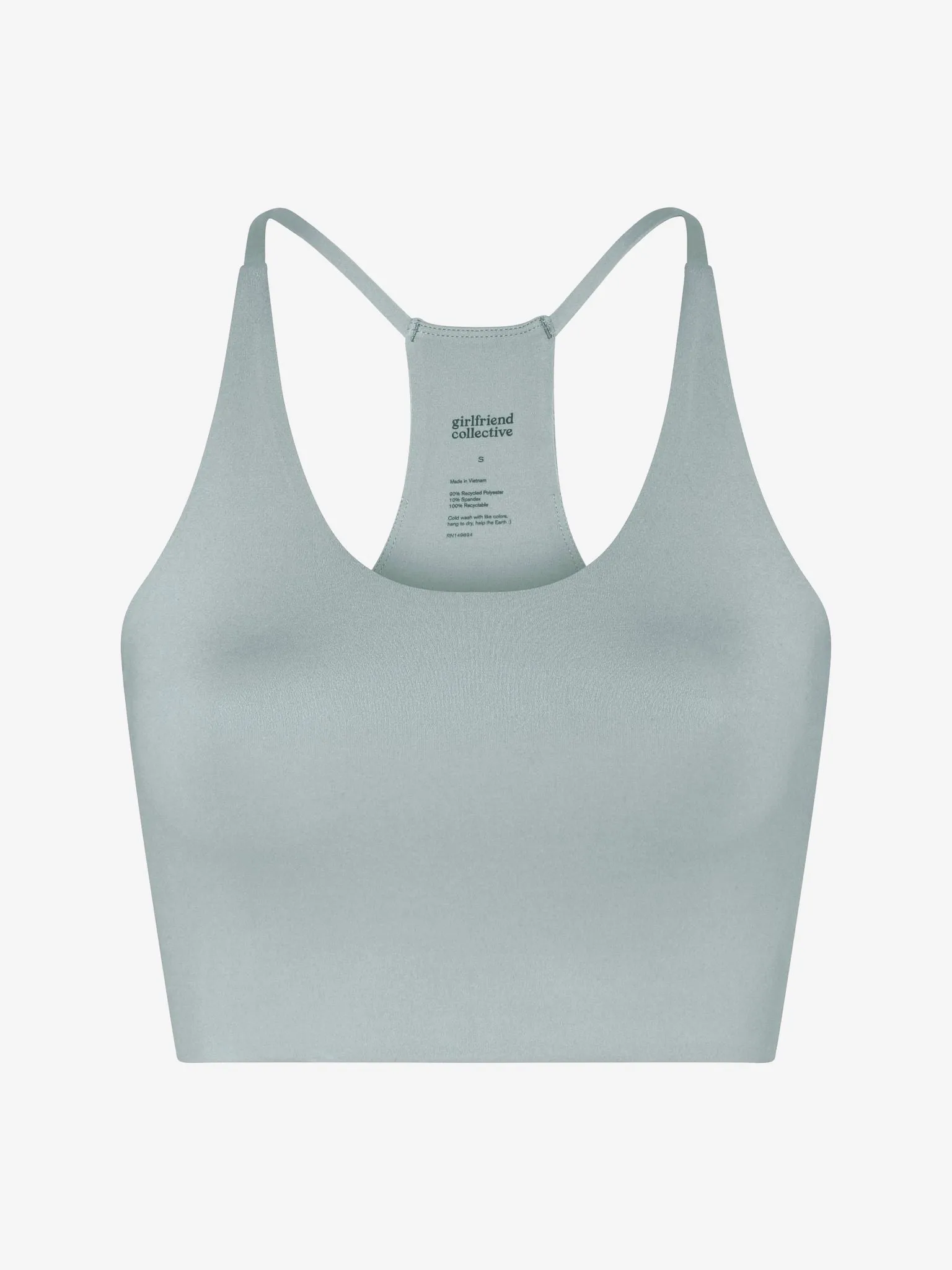 A U-neck bra with a racerback, thin straps and a soft-to-the-touch soft feel. Made with Girlfriend Collective's lighter weight and breathable FLOAT fabric, it's perfect for low-impact activities like hiking, biking or hand-washing all of your reusable water bottles.