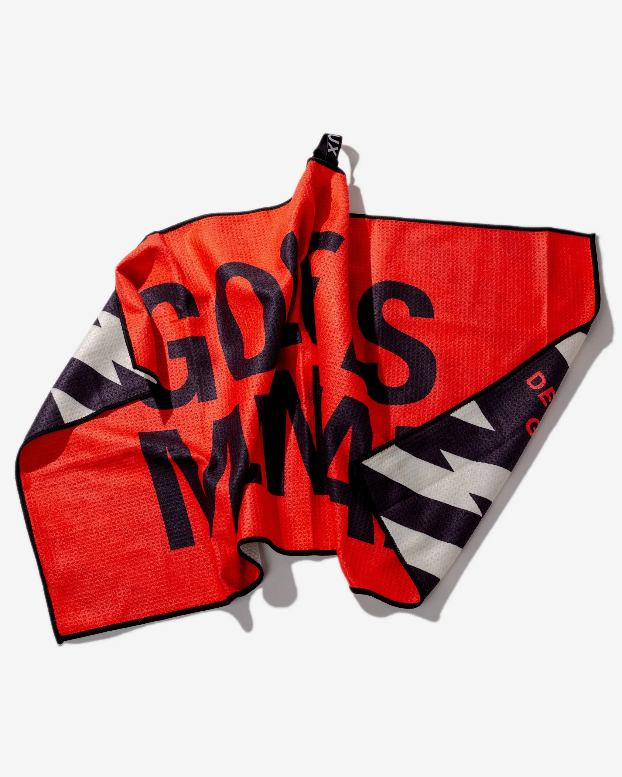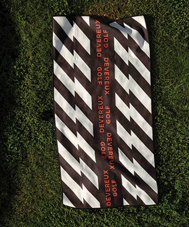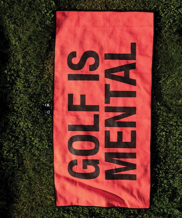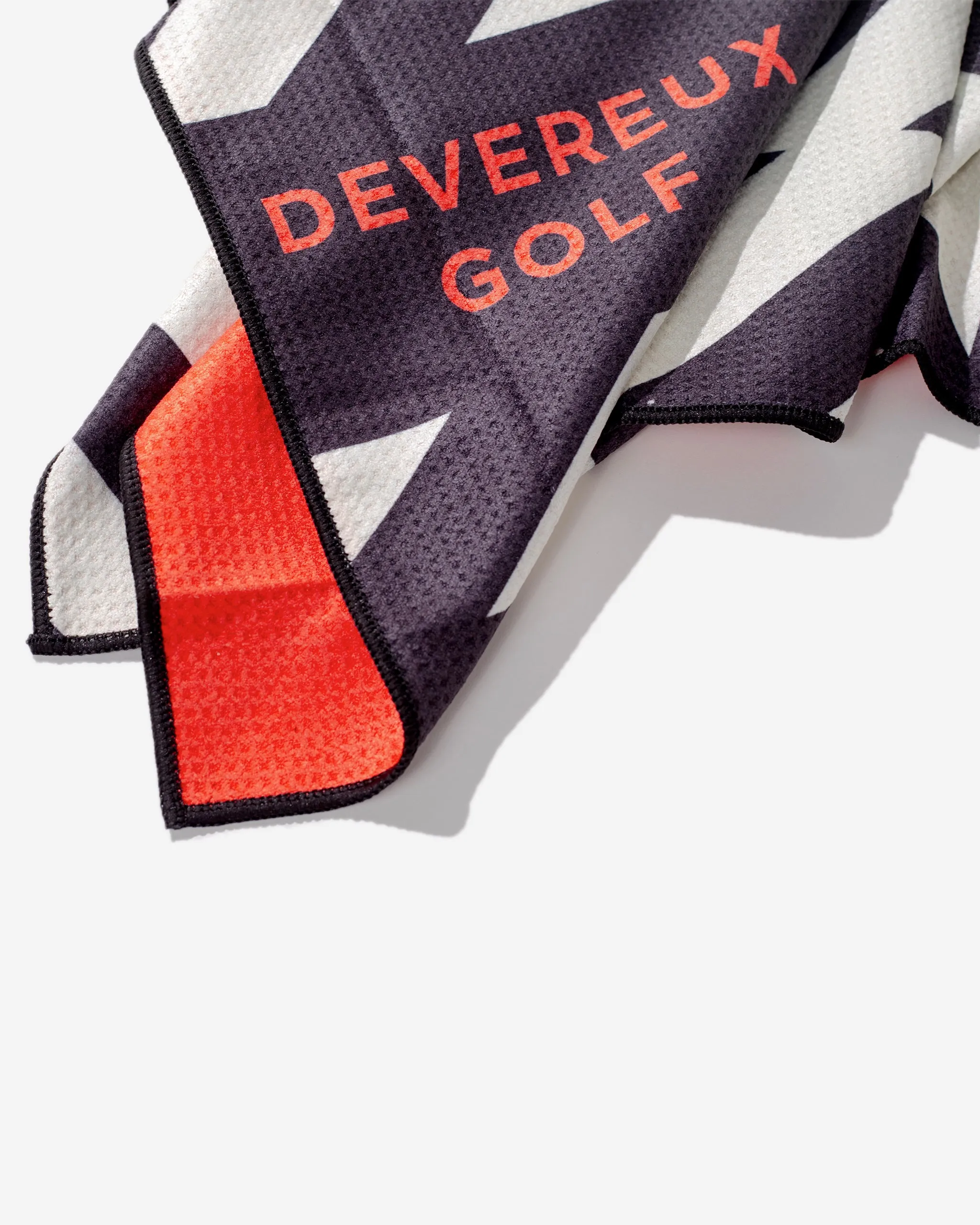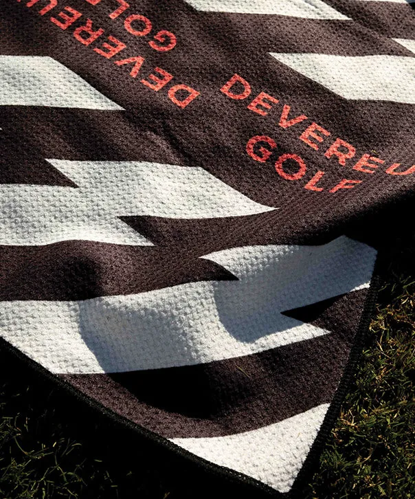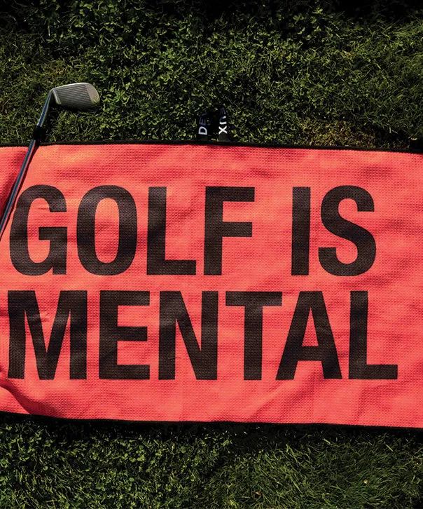 A waffle knit microfiber golf towel. One side features "Golf is Mental" on a red background and the other side features black and white bolt graphic print with repeating "Devereux Golf" text in red.