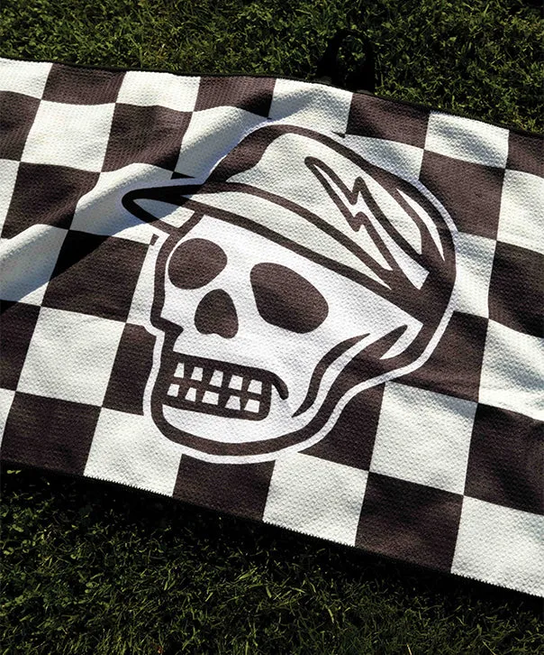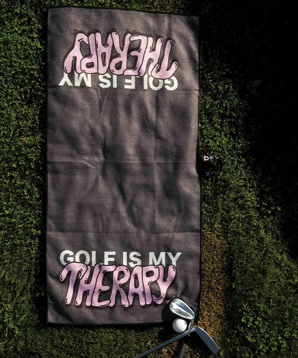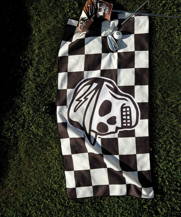 A waffle knit microfiber golf towel. One side features our "Golf is My Therapy" graphic on each end and the other side features our 'Skull Caddie' Icon on a black and white checked background.