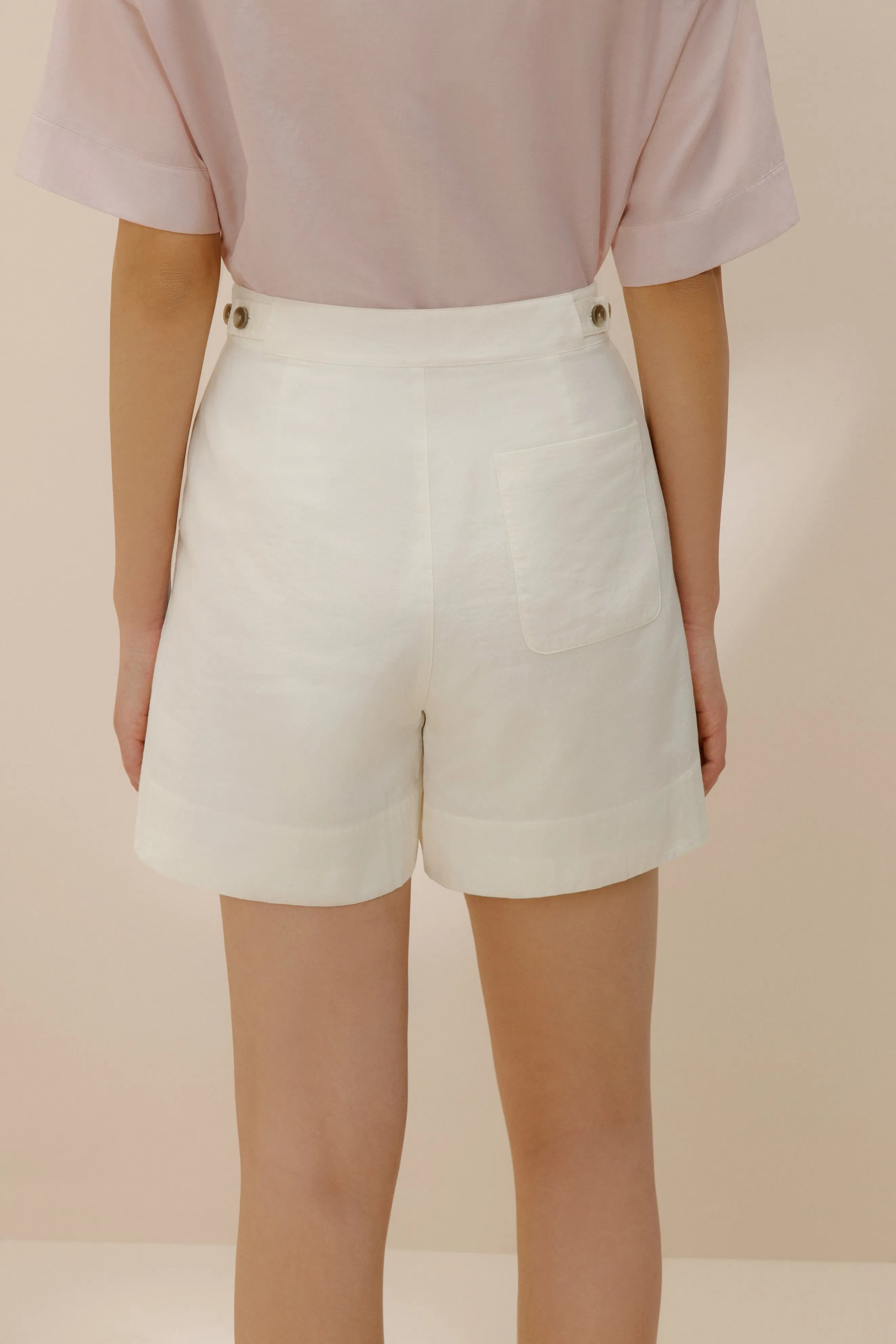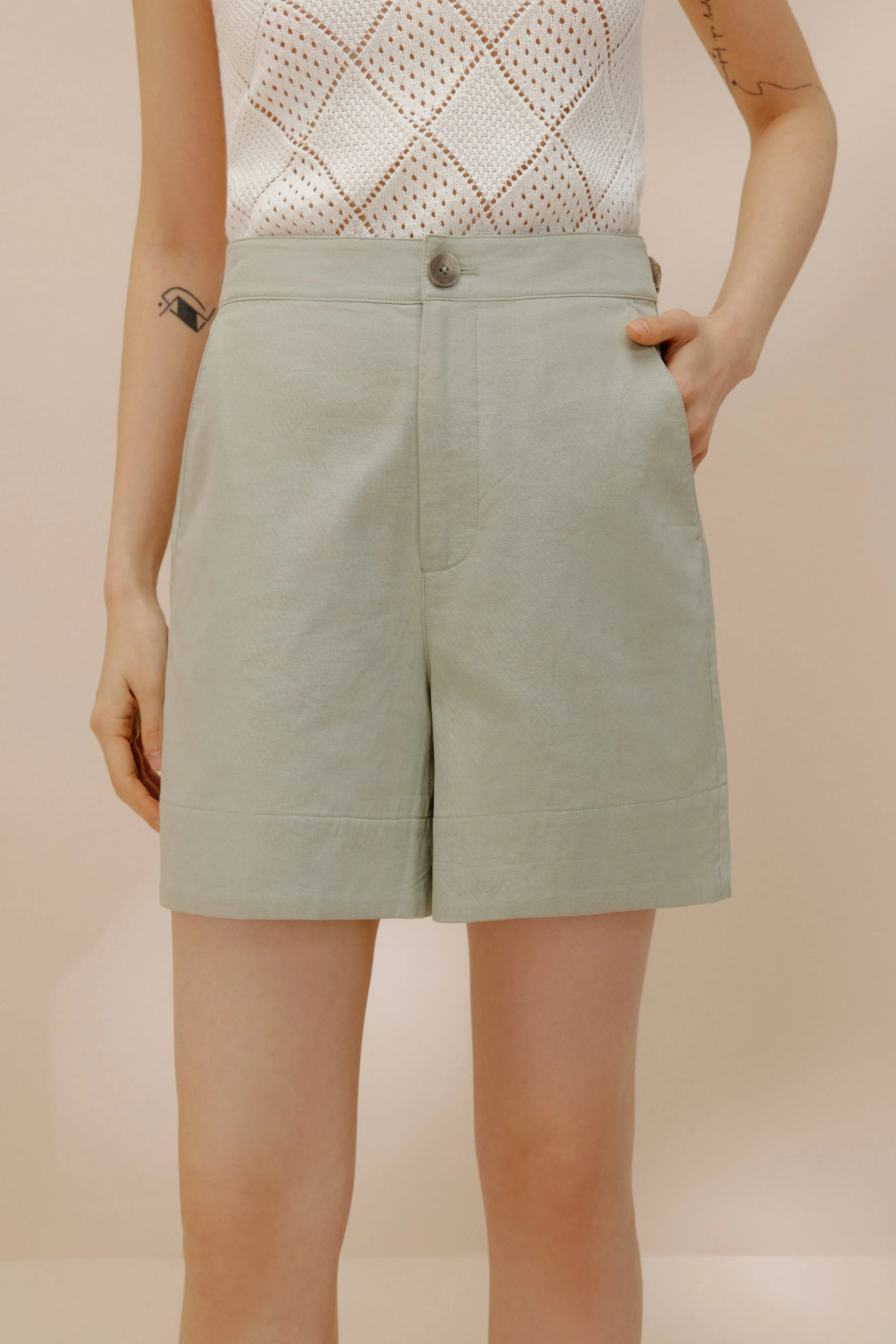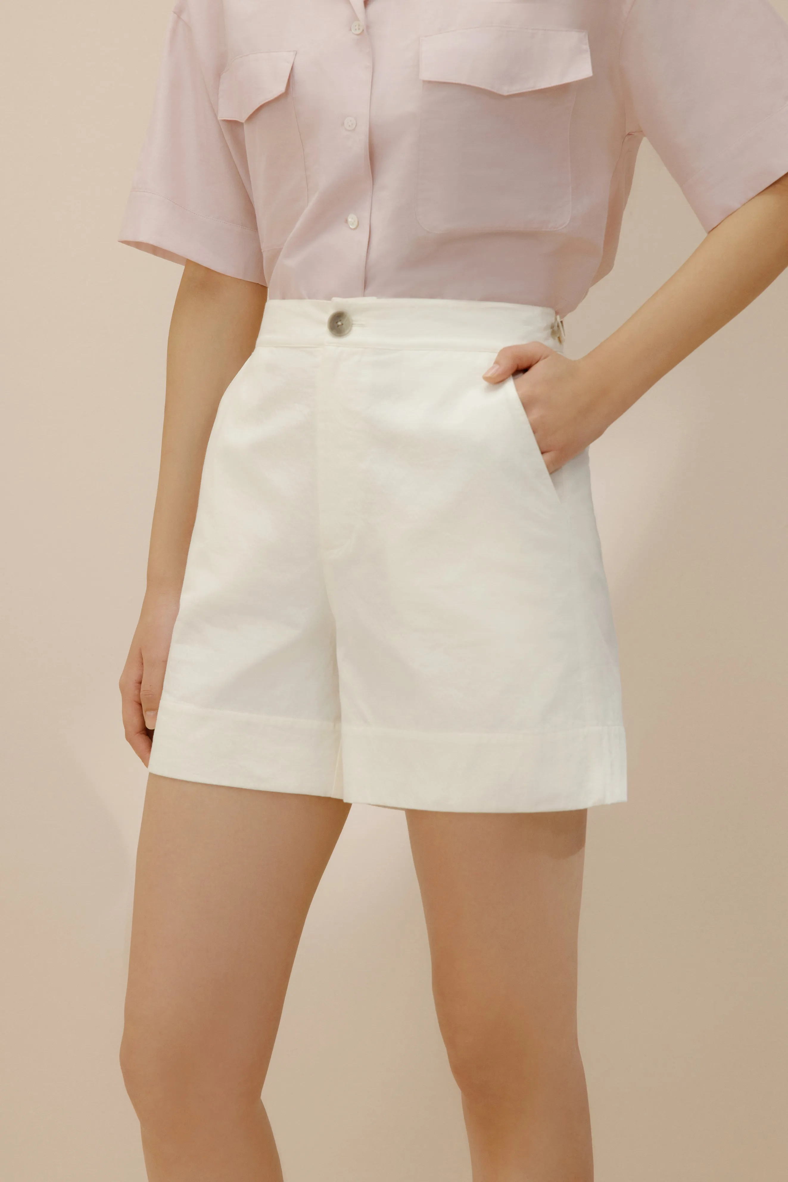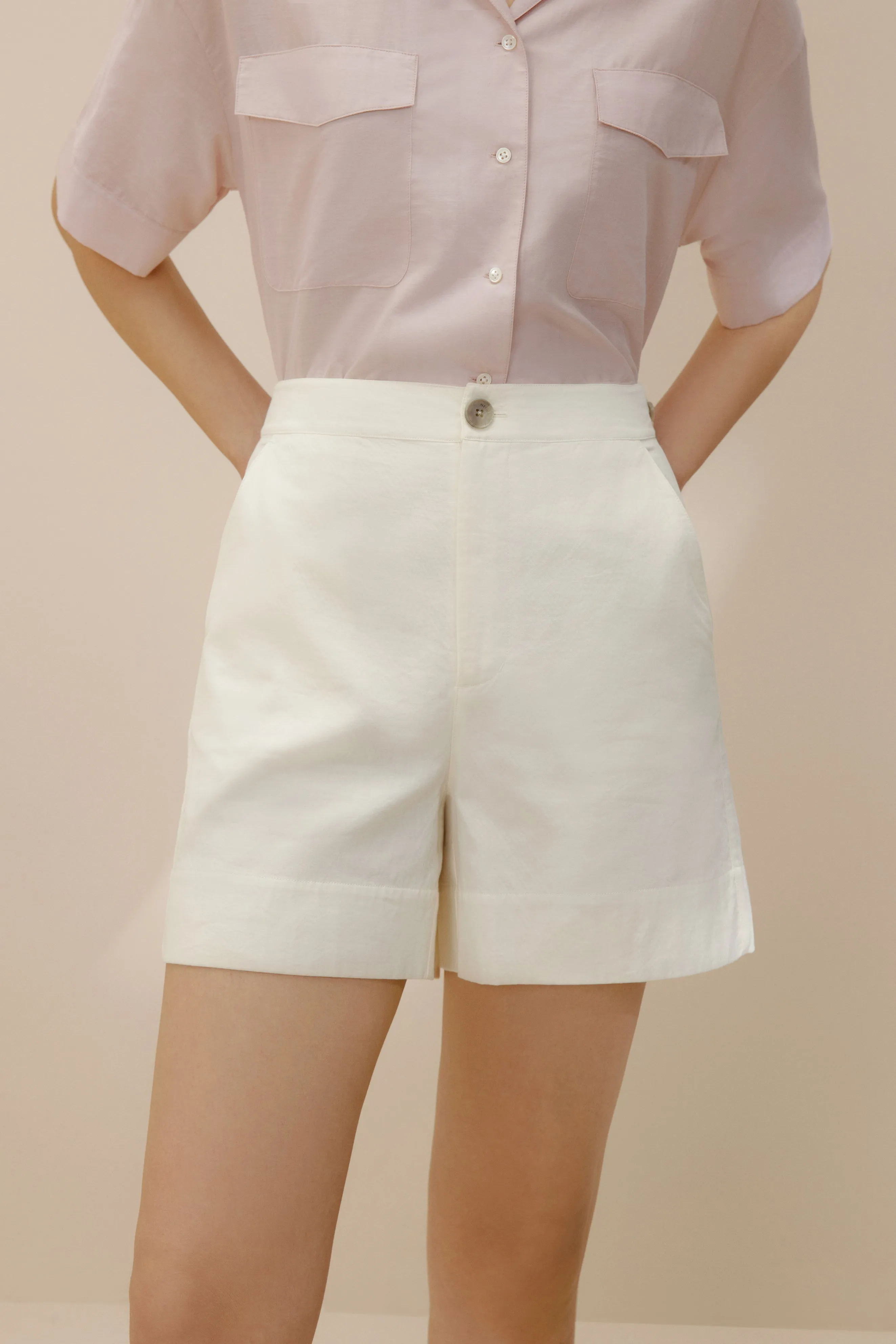 • Semi-high waist shorts with adjustable waistband and pockets.