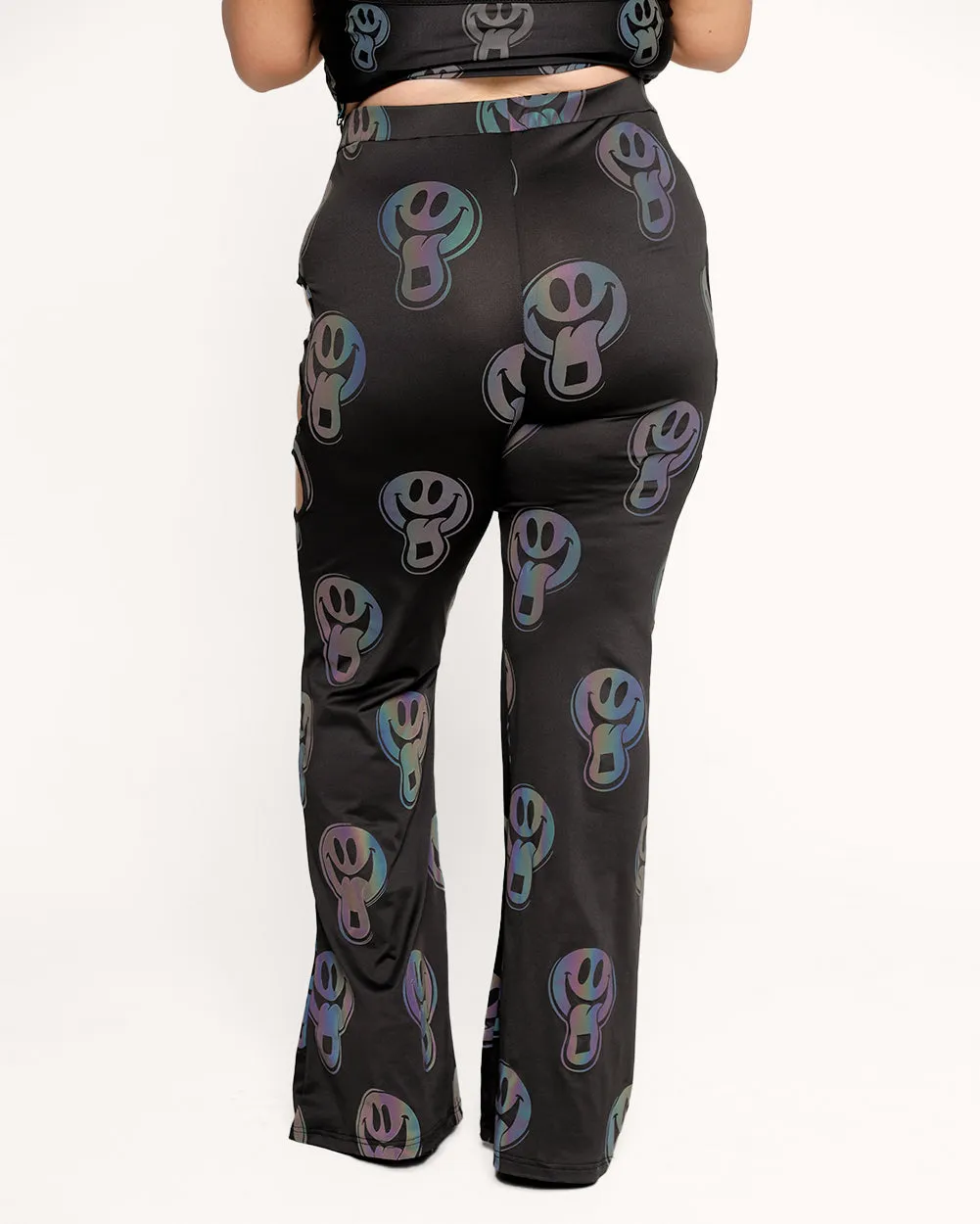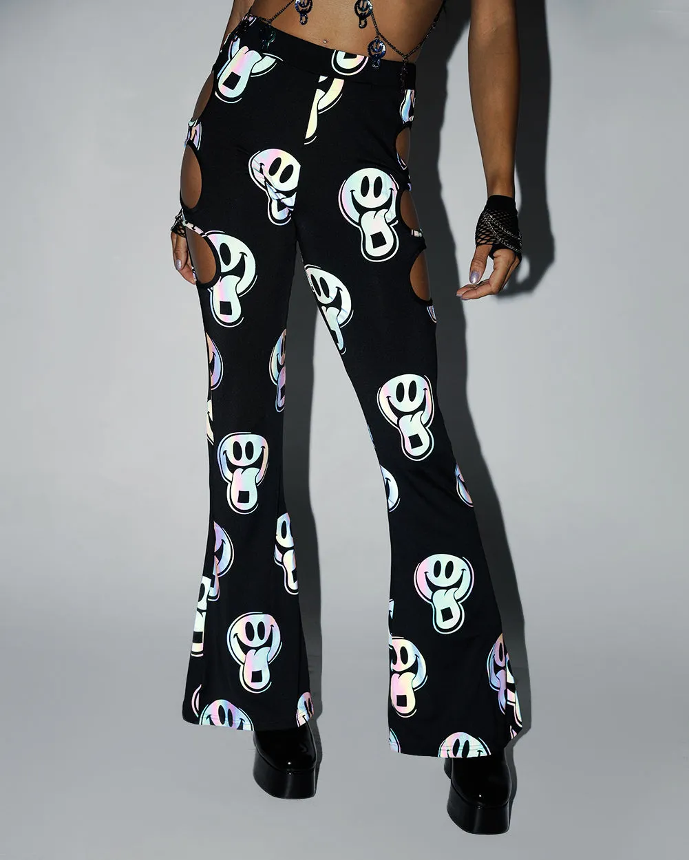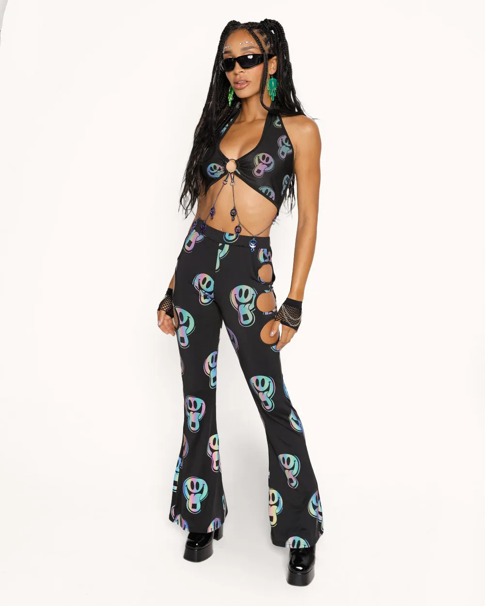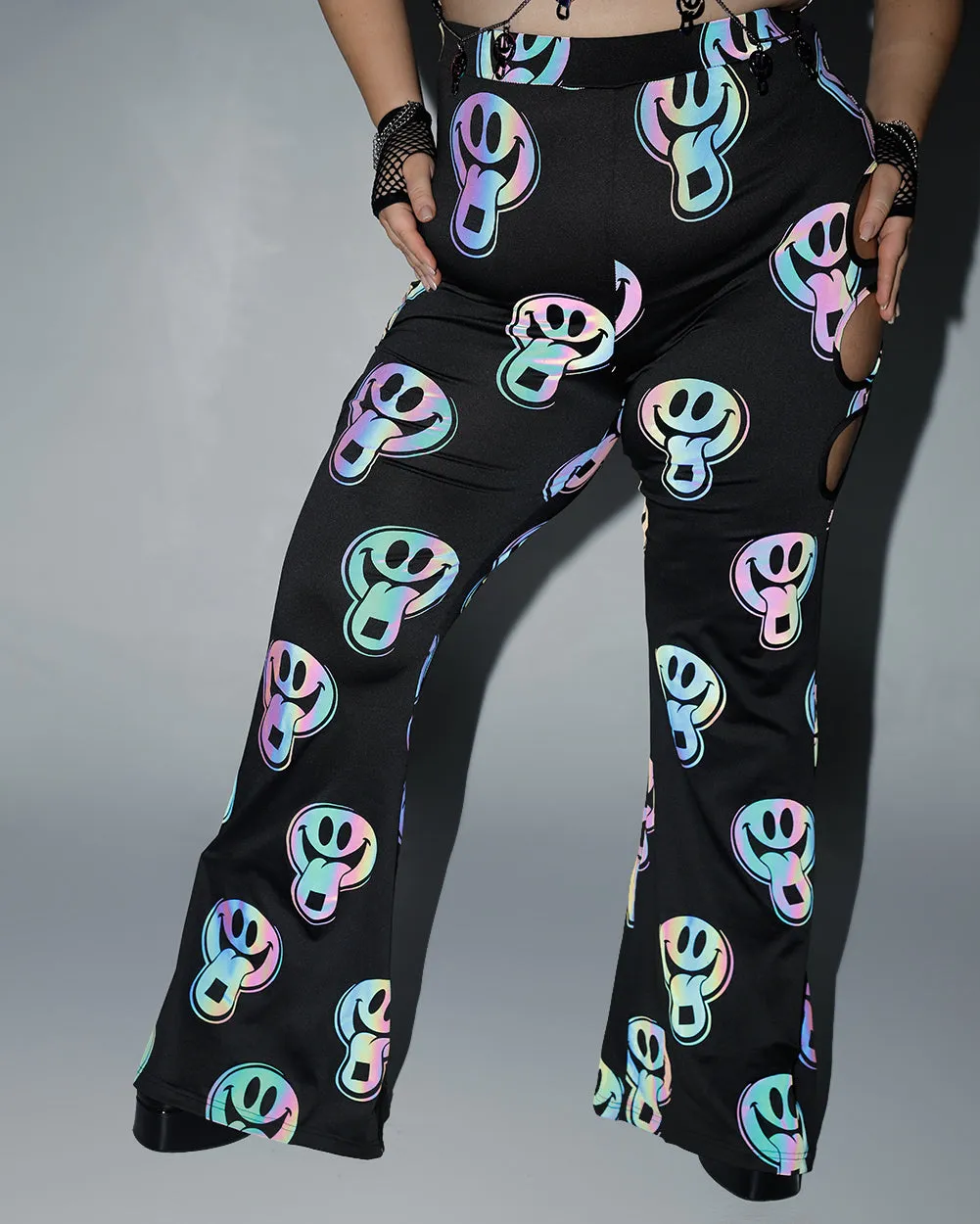 Surrender to the sensory overload of the Happy Hour Rainbow Reflective Cutout Bell Bottoms! Dance with abandon, as the hypnotic visuals on these reflective bottoms come to life, merging with the pulsating beats of the music.
