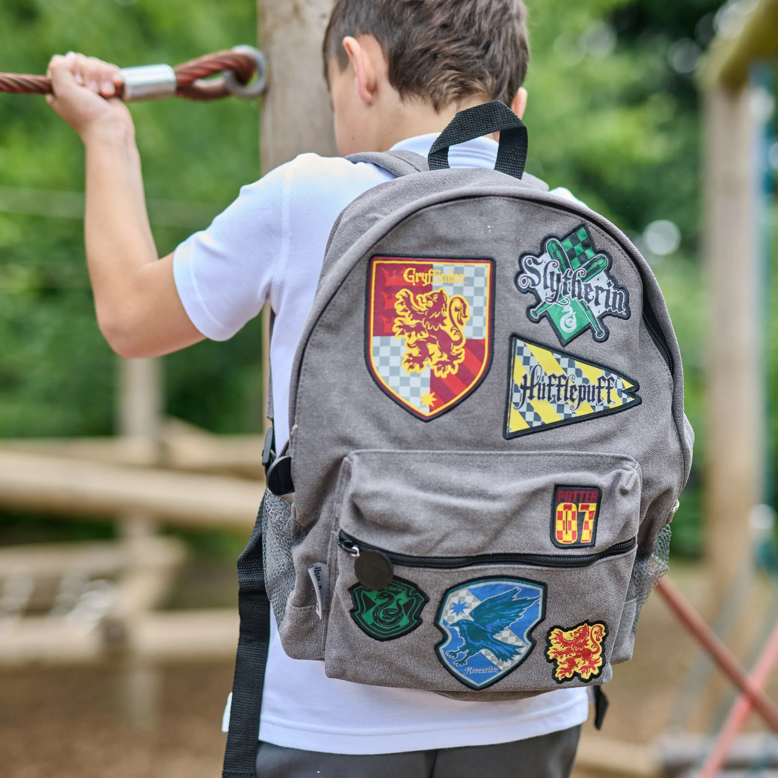 Every Hogwarts class will become a spellbinding one with this enchanting backpack! Inspired by the famous wizard's School of Witchcraft and Wizardry, Hogwarts. This Harry Potter rucksack features various embroidered patches of the Ravenclaw, Gryffindor, Hufflepuff and Slytherin coats of arms as well as Harry Potter's iconic Quidditch number 07 against a gray background. This is a canvas backpack suitable for muggles and wizard alike.