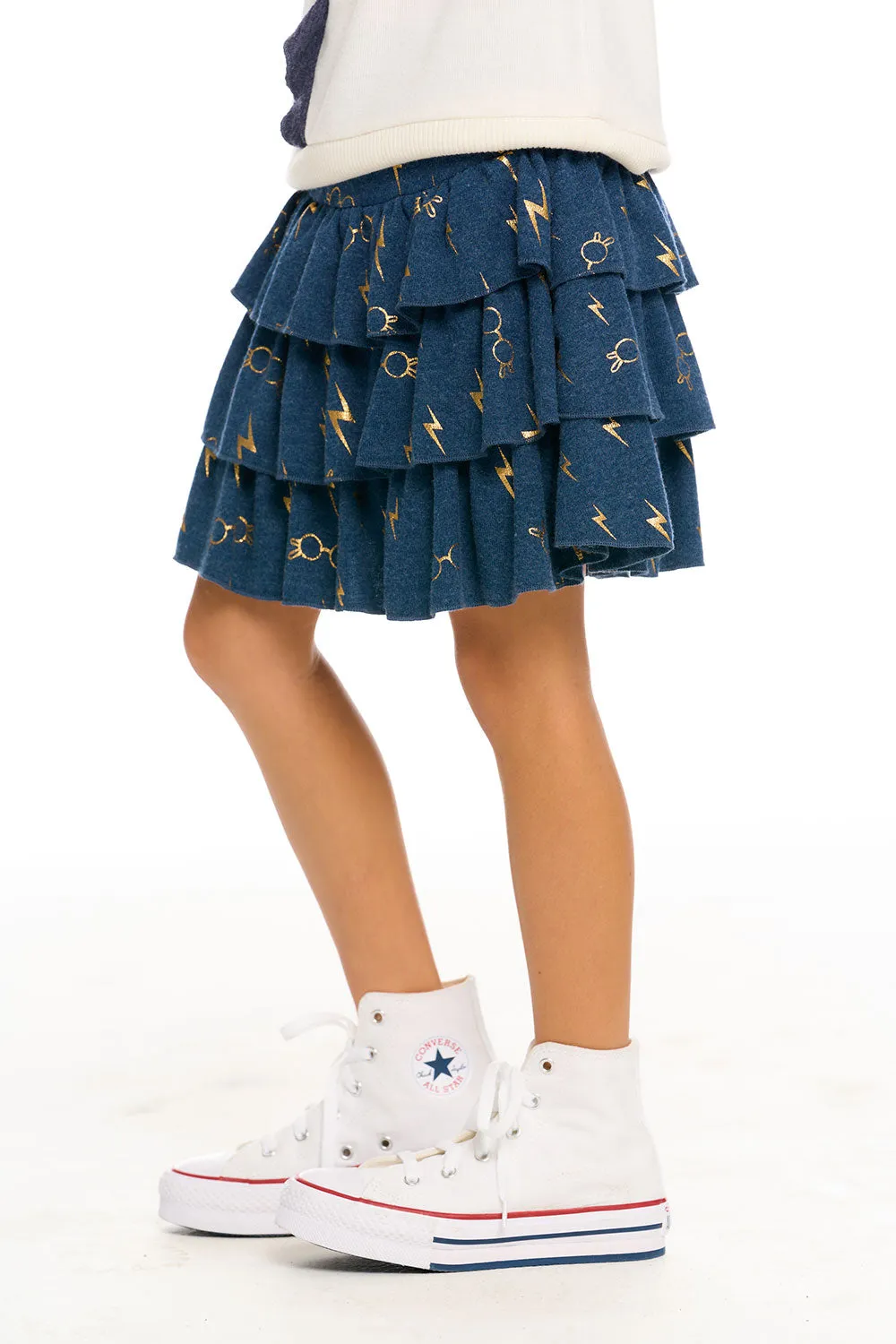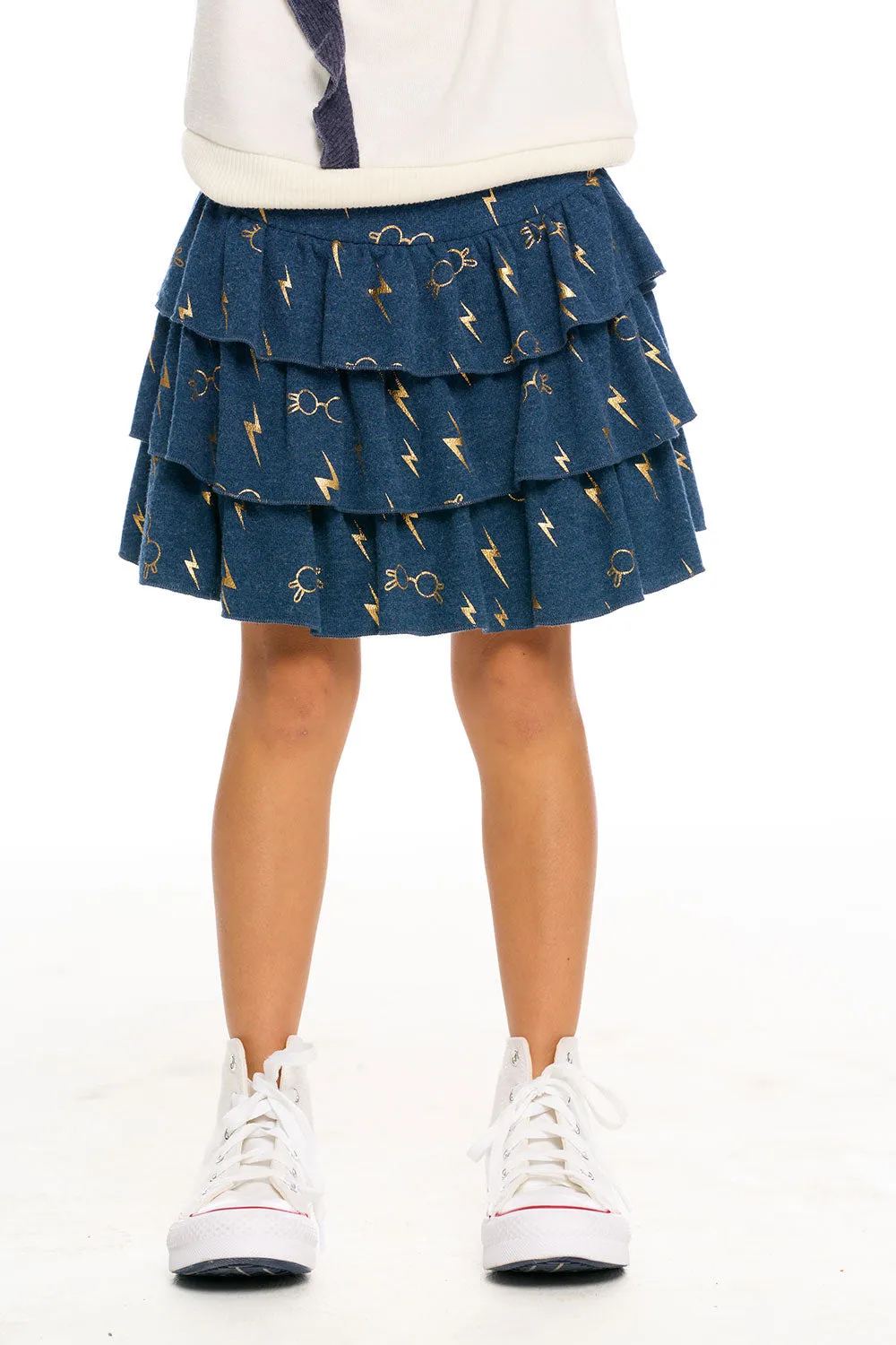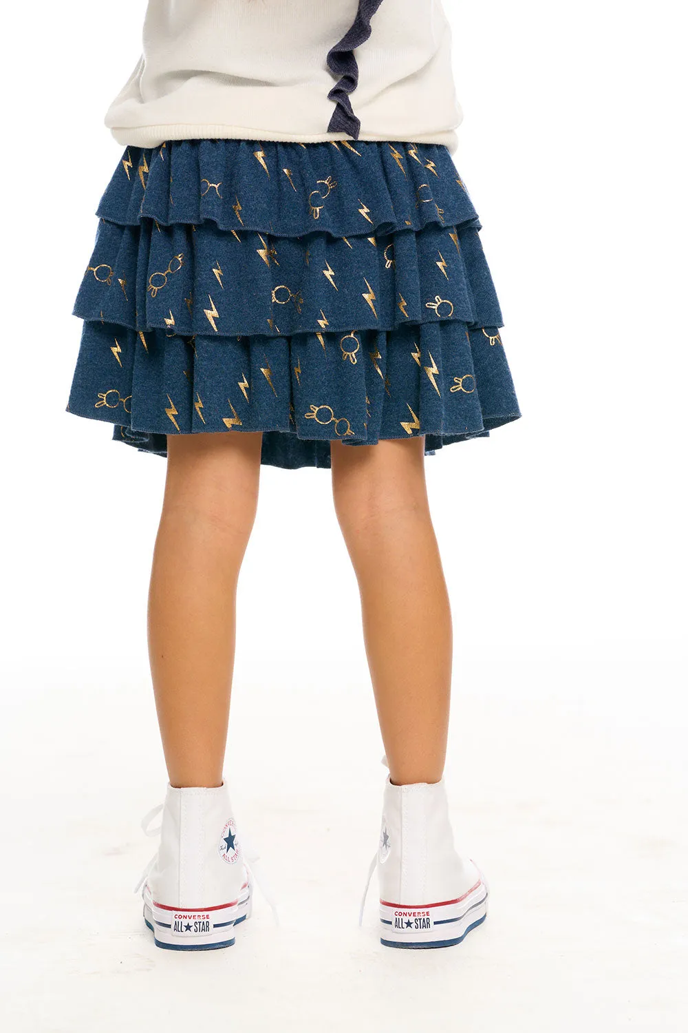 Give your little muggle the magic of Harry Potter with our Girl's Recycled Bliss Knit Harry Potter Bolts & Glasses Ruffled Skirt in blue. She'll be spellbound over the super cozy, eco-friendly fabric and adorable tiered, ruffle design that Hermione would surely adore.