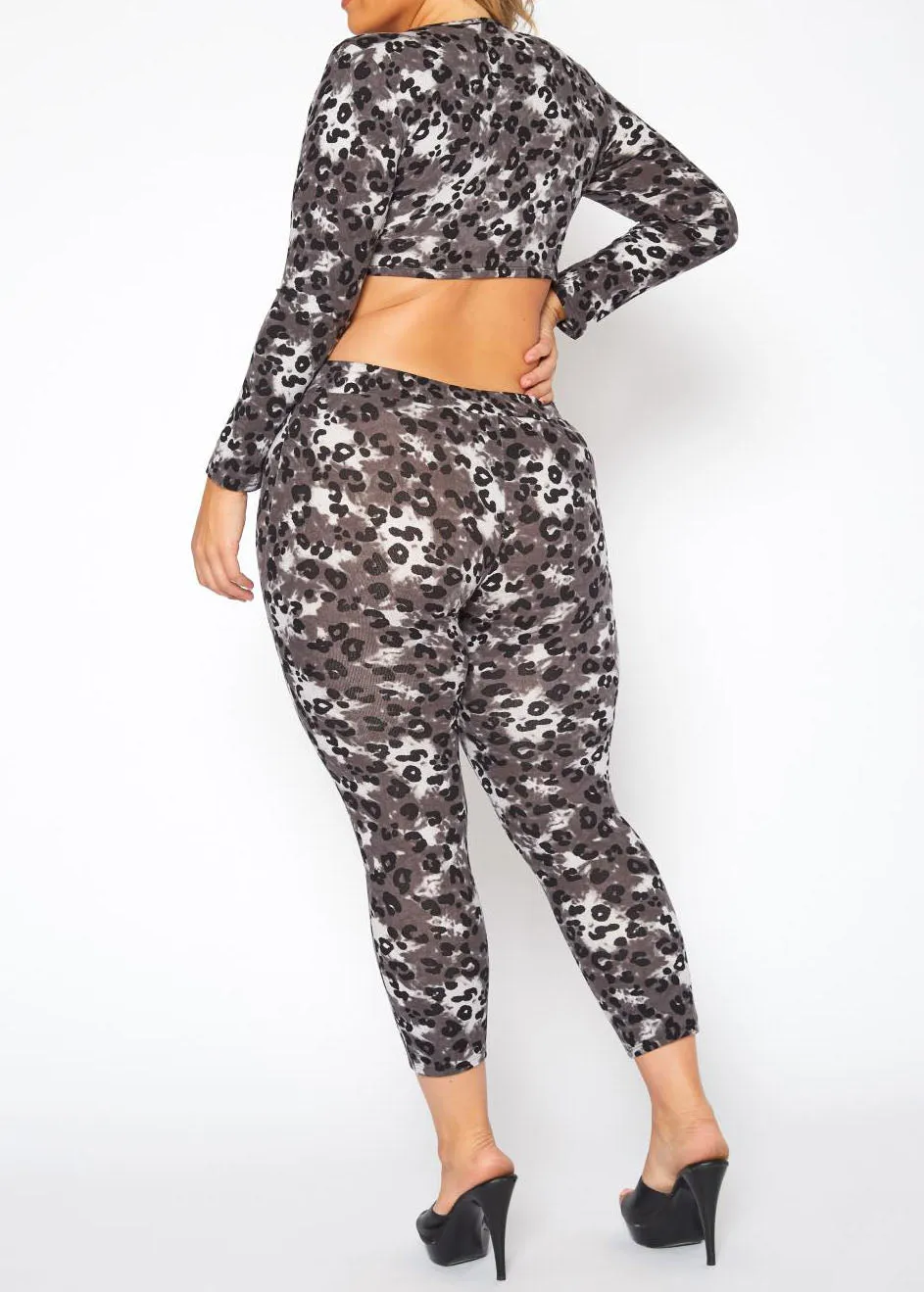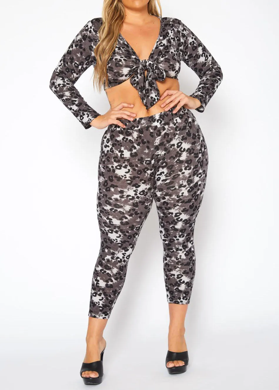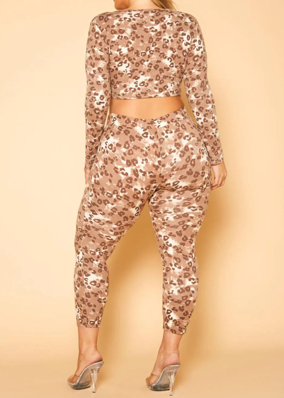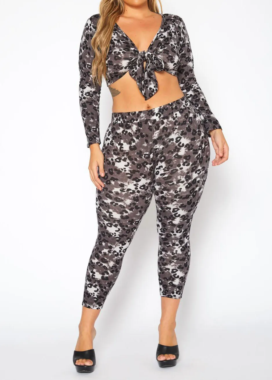 Experience fierce style and ultimate comfort with our Plus Size Leopard Print Tie Front Crop Top & Leggings Set. The trendy leopard print adds a touch of wild to your wardrobe, while the crop top and leggings provide a flattering and comfortable fit, perfect for any occasion.